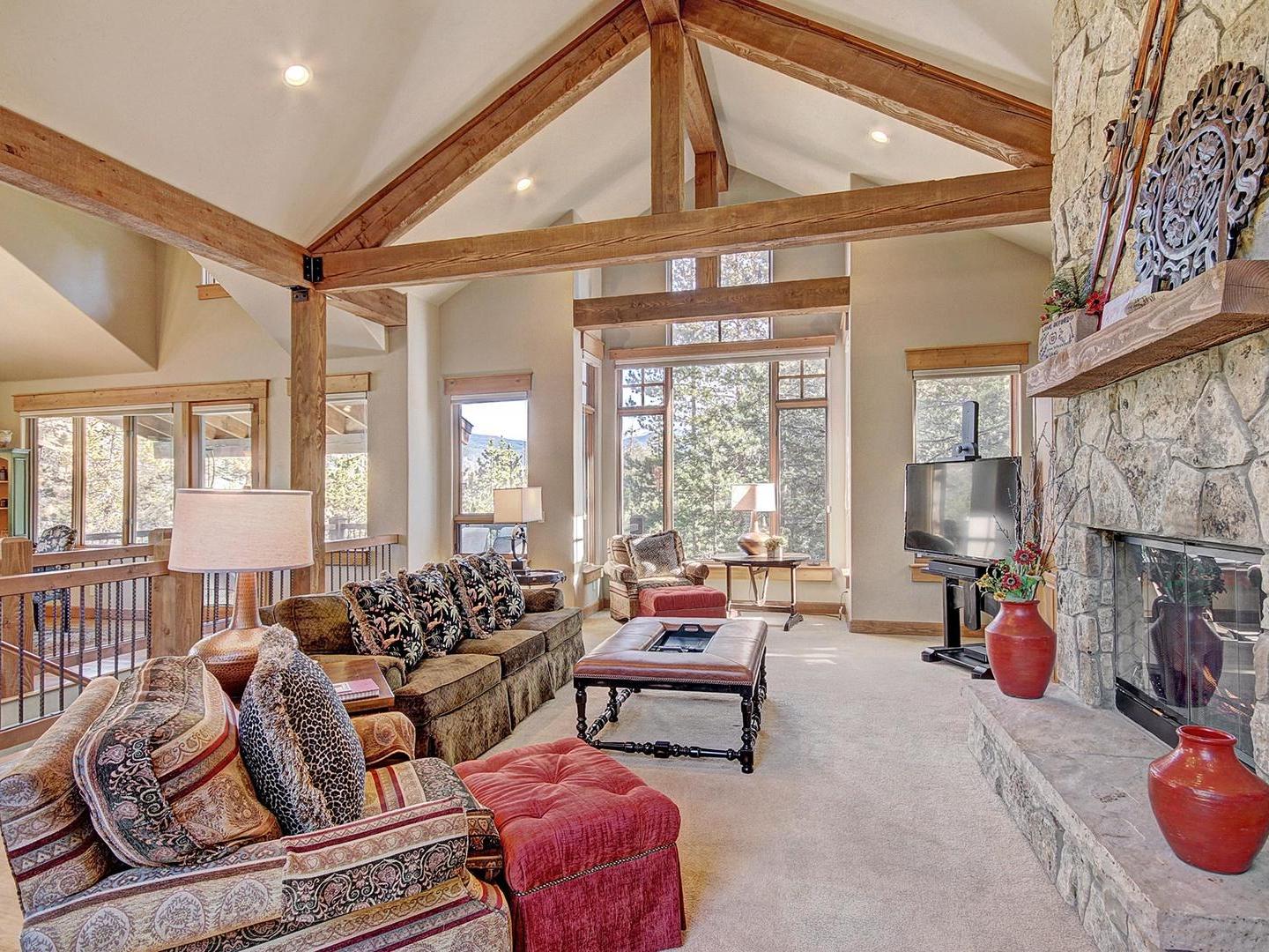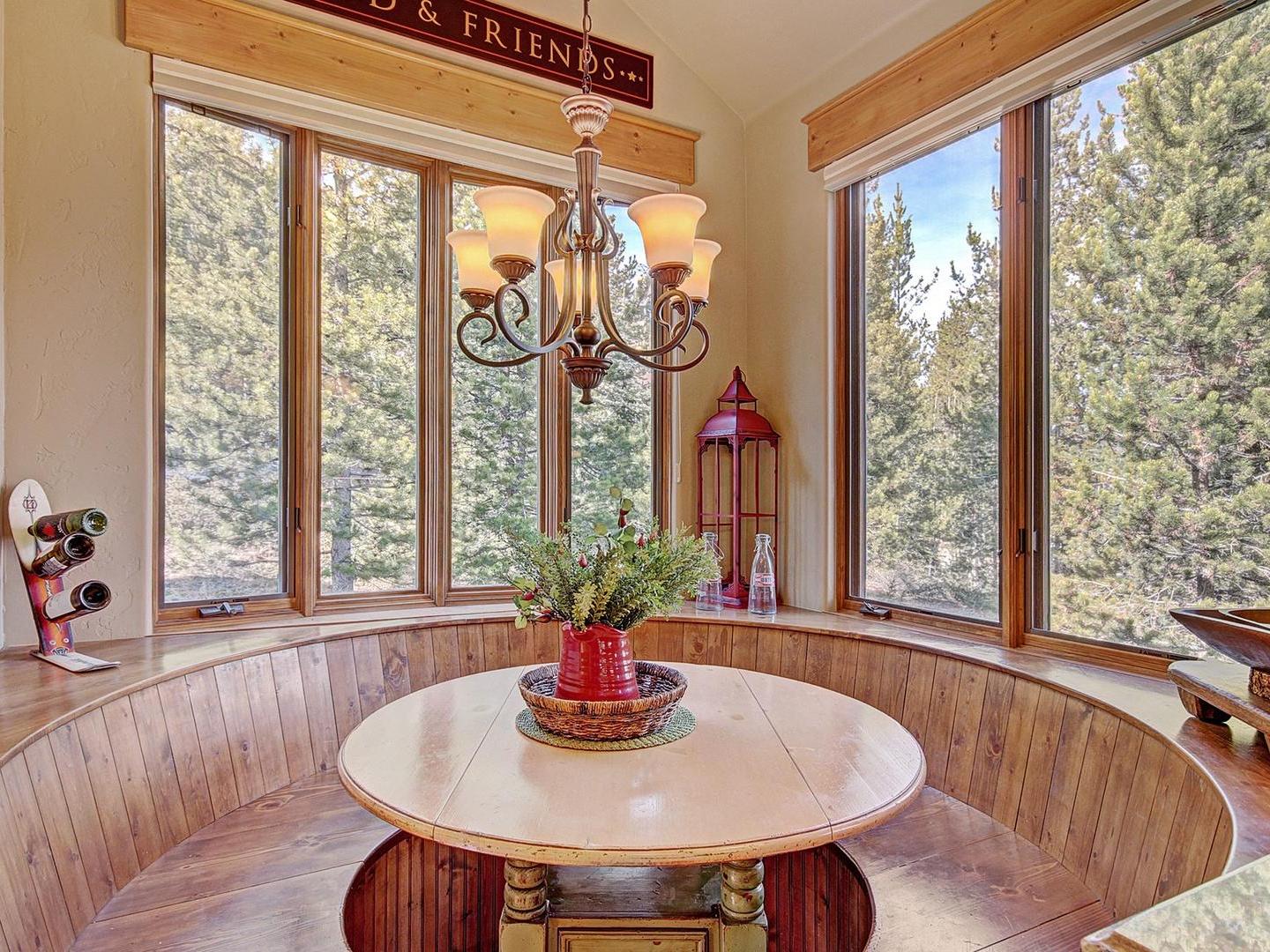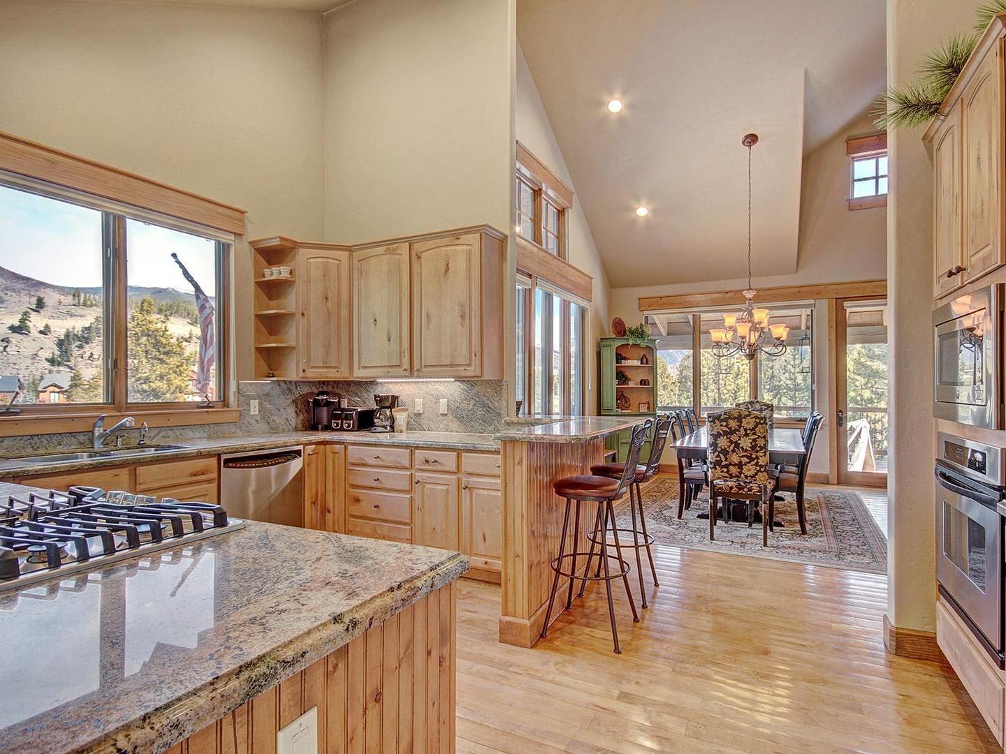 On the middle level, a large living room boasts high ceilings with gorgeous wood beams and floor to ceiling windows showcasing views of the Continental Divide. Ample seating, a roaring fireplace and a flat screen television create a cozy space to gather after the day’s adventures. Around the corner, a gourmet kitchen features top-of-the-line stainless steel appliances, beautiful countertops, and several eating spots including a breakfast bar and a round kitchen nook set among windows.