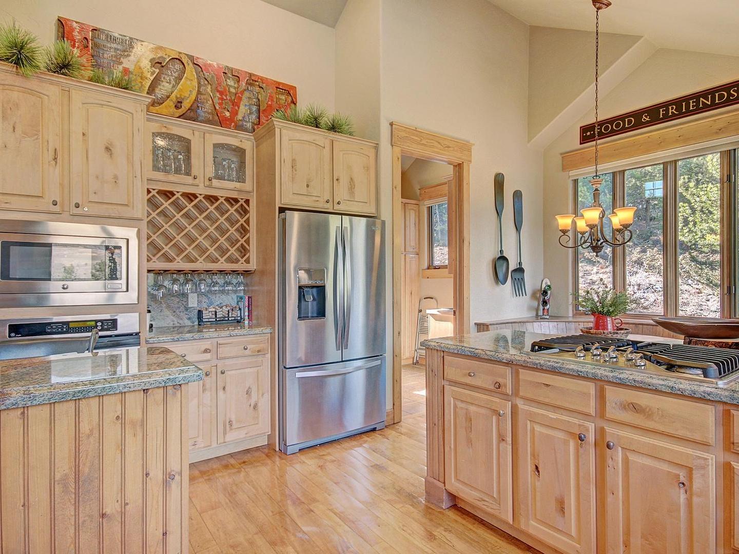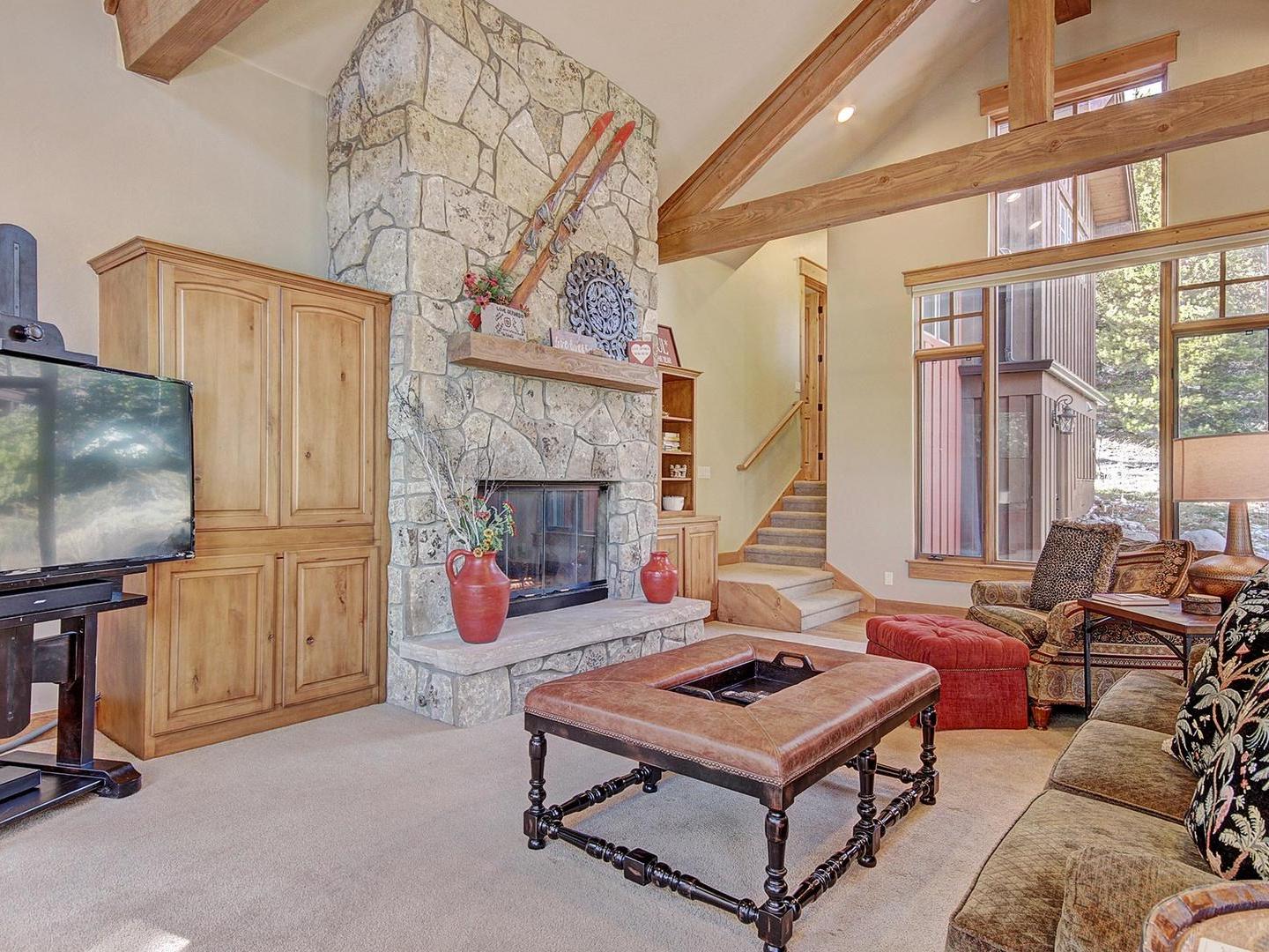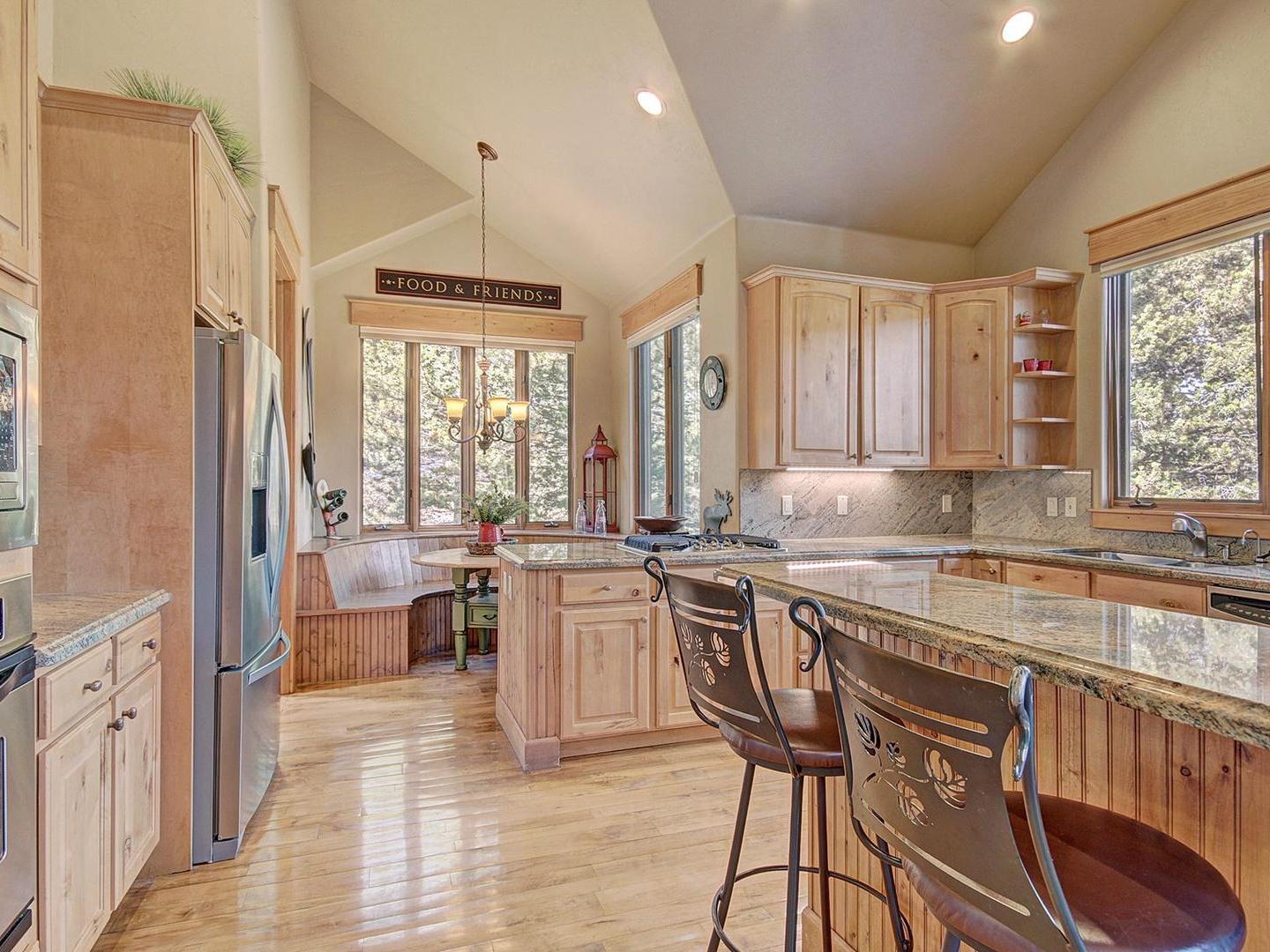 On the middle level, a large living room boasts high ceilings with gorgeous wood beams and floor to ceiling windows showcasing views of the Continental Divide. Ample seating, a roaring fireplace and a flat screen television create a cozy space to gather after the day’s adventures. Around the corner, a gourmet kitchen features top-of-the-line stainless steel appliances, beautiful countertops, and several eating spots including a breakfast bar and a round kitchen nook set among windows.