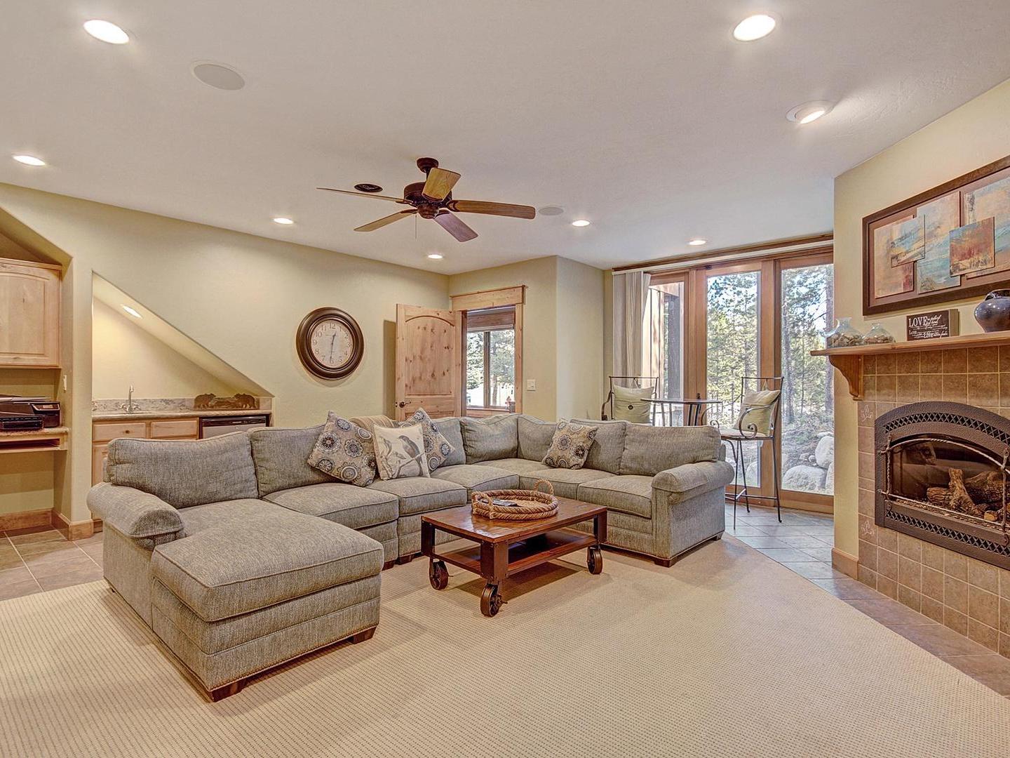 For more formal dining, a large table sits just off the kitchen and can seat up to 10 guests. Two balconies and a patio are accessed from this level offering superb views, a variety of seating and a cozy hammock. If your family or group wants to watch different shows or do multiple activities, a lower level family room offers the additional space to do so. It features a large comfortable sectional sofa, a fireplace and a massive flat screen television, perfect for the big game. A wet bar with a refrigerator ensures guests’ comfort and hydration without having to head upstairs to the kitchen.