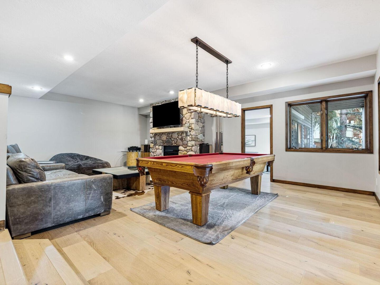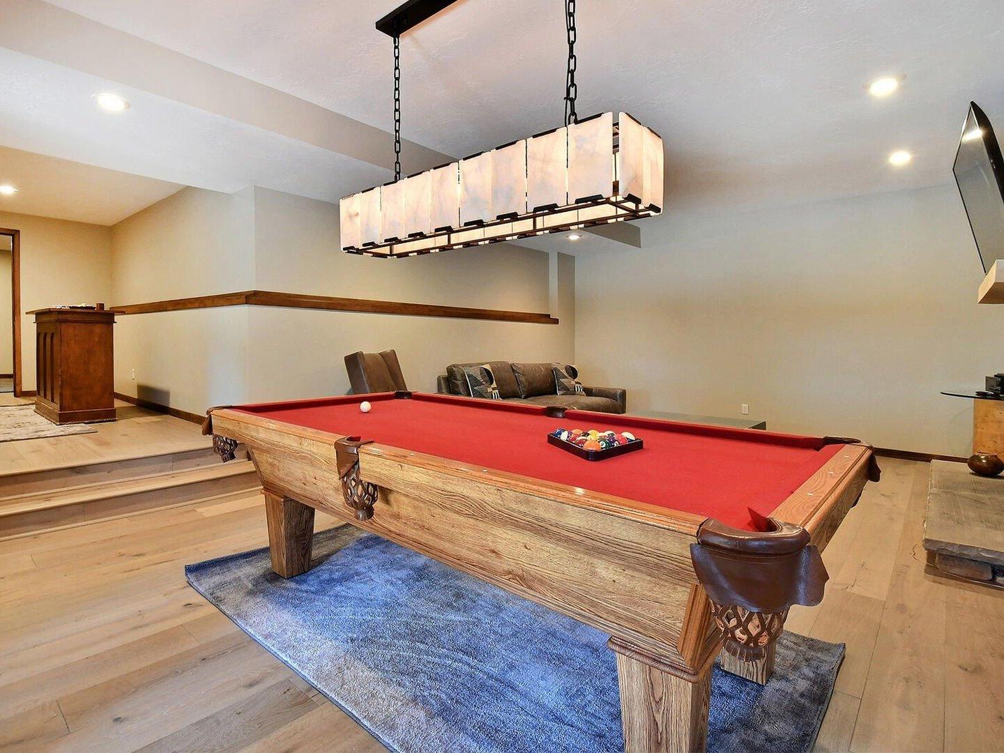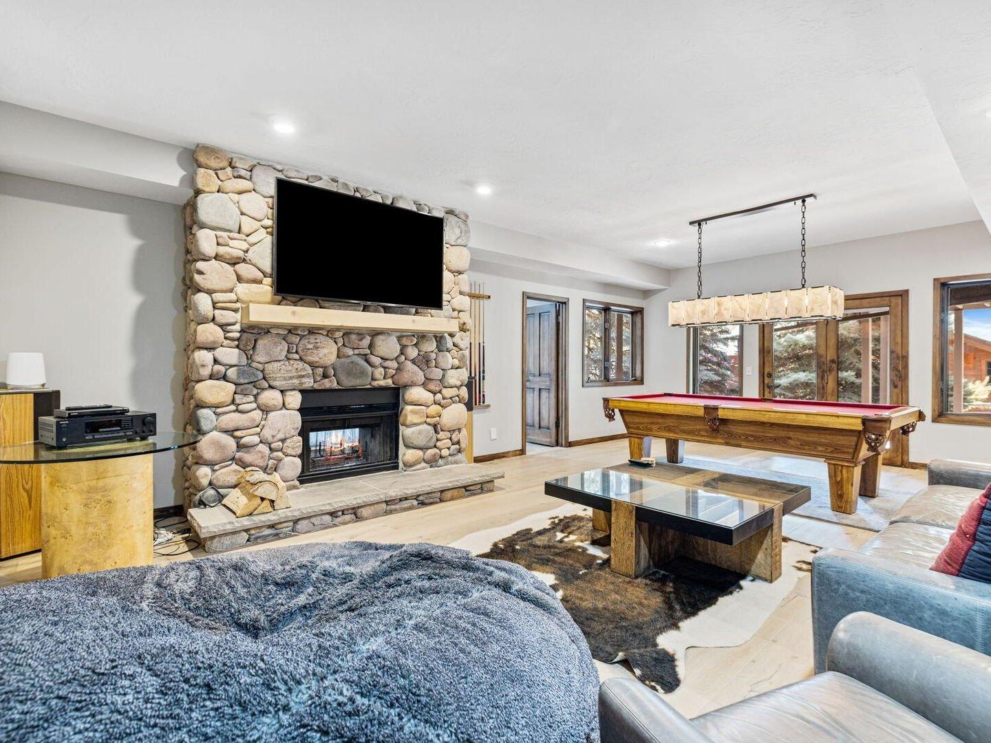Designed for a fun Deer Valley or Park City vacation, this luxurious vacation home features a family room on the lower level where the entertainment is abundant. Leather sofas are centered on a stone fireplace and flat screen television in the family room's sitting area next to a pool table. For those who need some additional exercise the home also includes a fitness room.