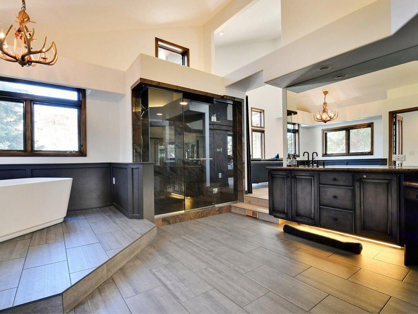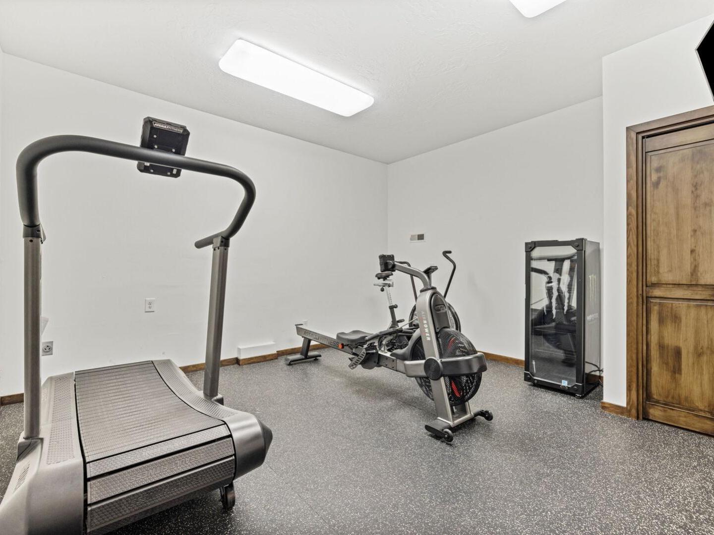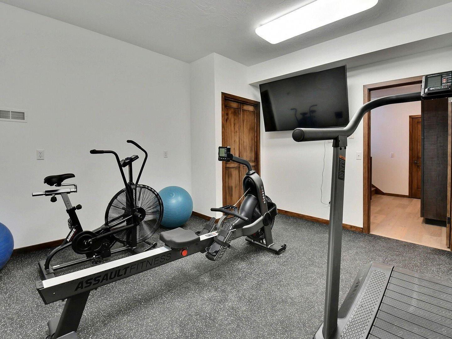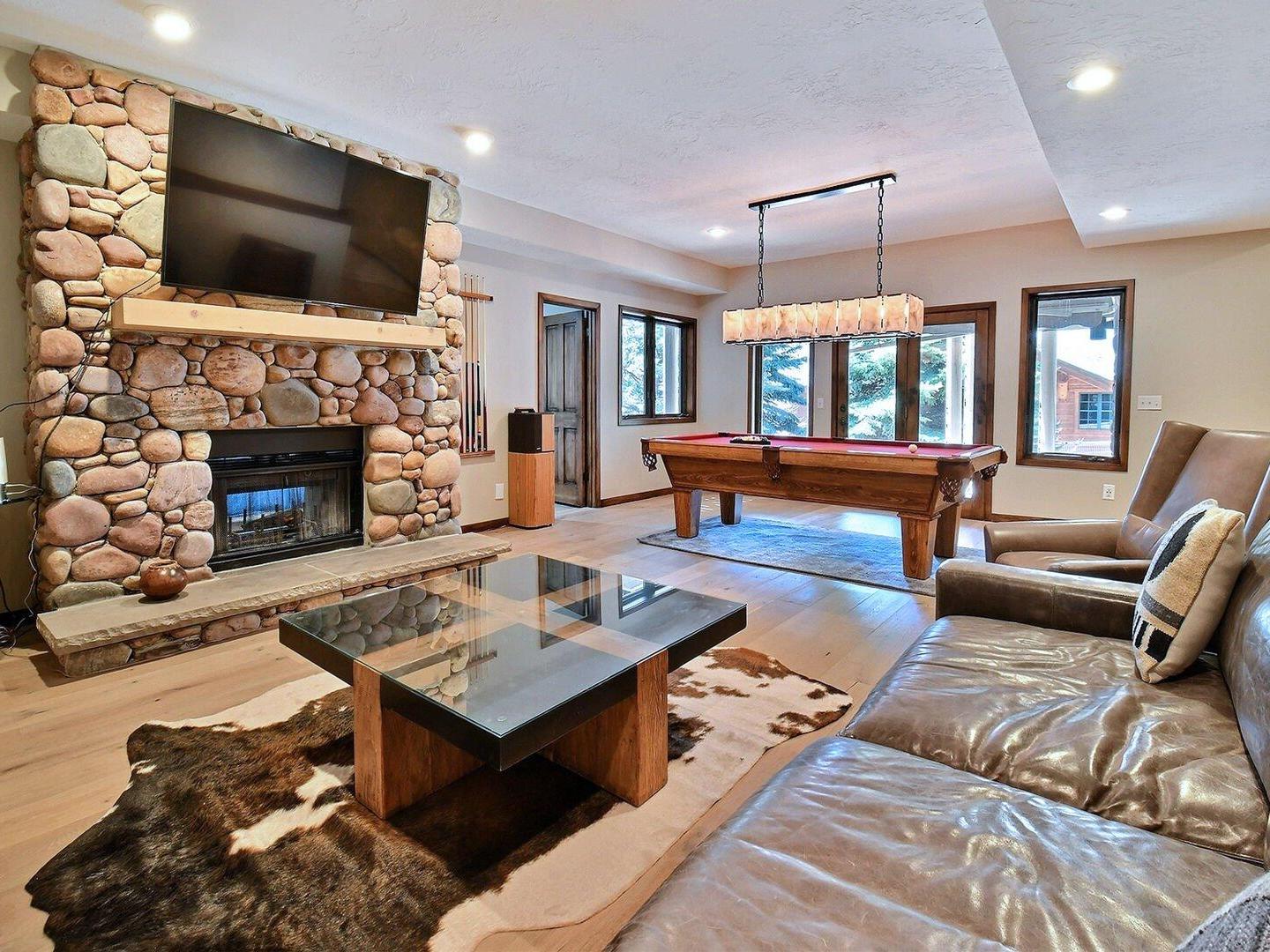 Designed for a fun Deer Valley or Park City vacation, this luxurious vacation home features a family room on the lower level where the entertainment is abundant. Leather sofas are centered on a stone fireplace and flat screen television in the family room's sitting area next to a pool table. For those who need some additional exercise the home also includes a fitness room.
