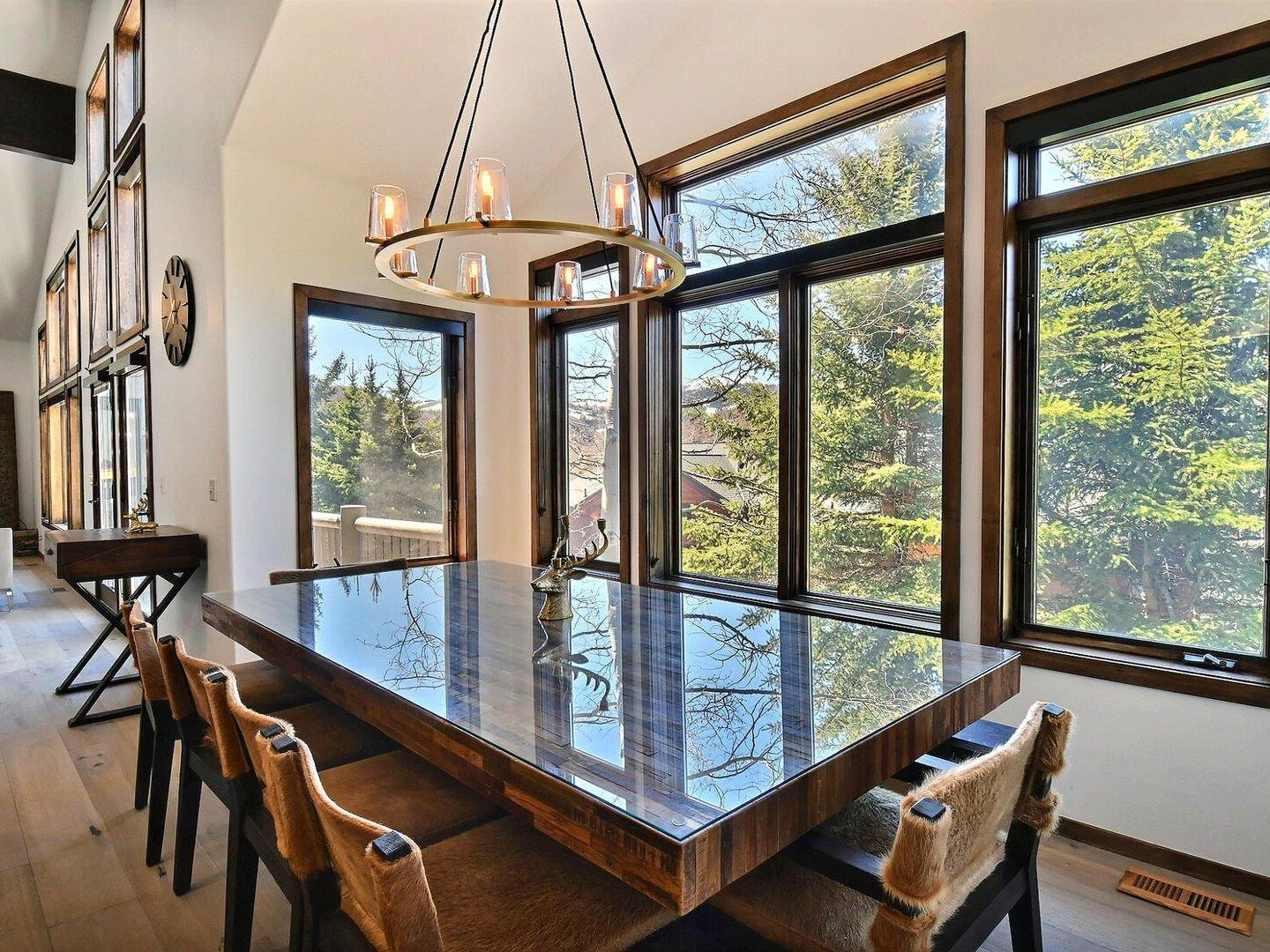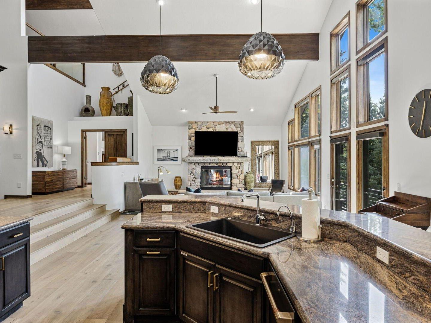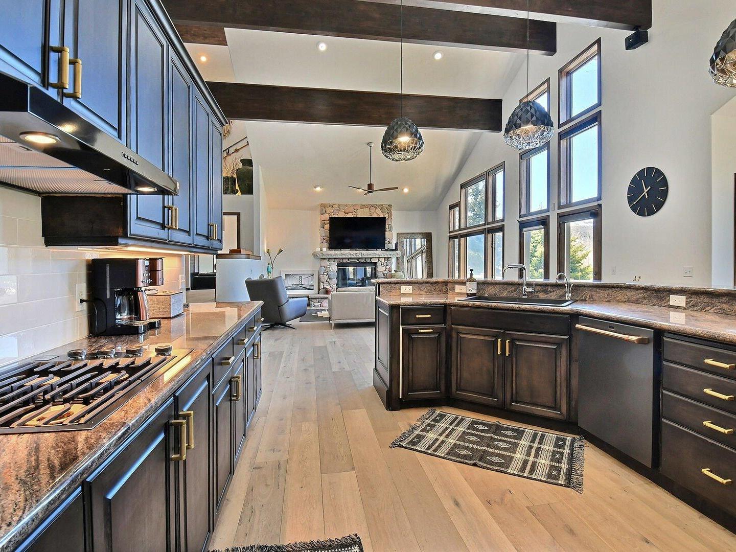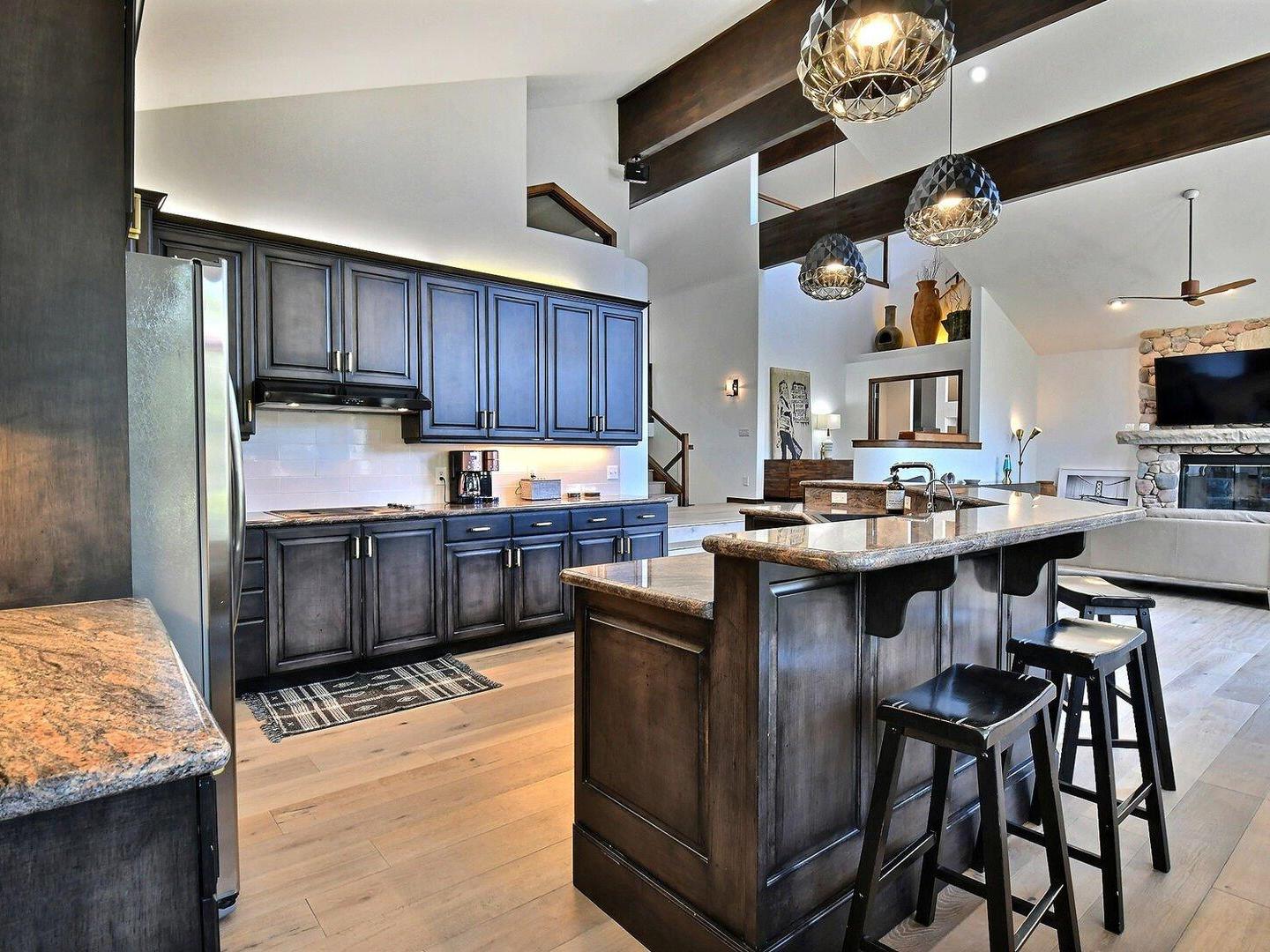 Open and expansive, the main level of 3165 thistle includes a fully equipped kitchen, dining area and living room. Quality furnishings are situated in front of a beautiful stone fireplace under vaulted ceilings in the living room where guests also have access to the huge wrap-around deck. Amazing views of the surrounding mountains can be enjoyed from the deck while relaxing in the large outdoor hot tub. Adjacent to the living room sits a large dining table with room for 10 guests. Right next to the dining table a breakfast bar allows for an additional 4 guests.