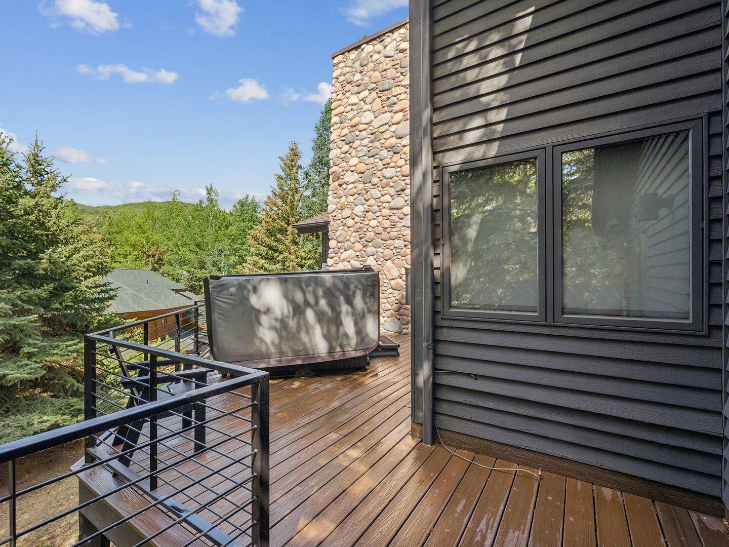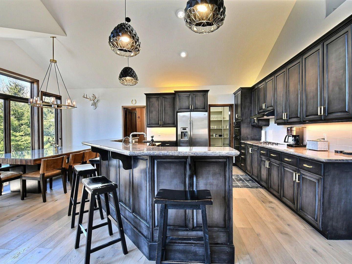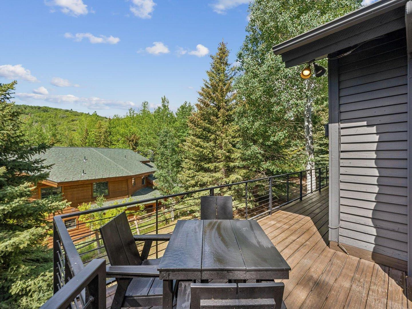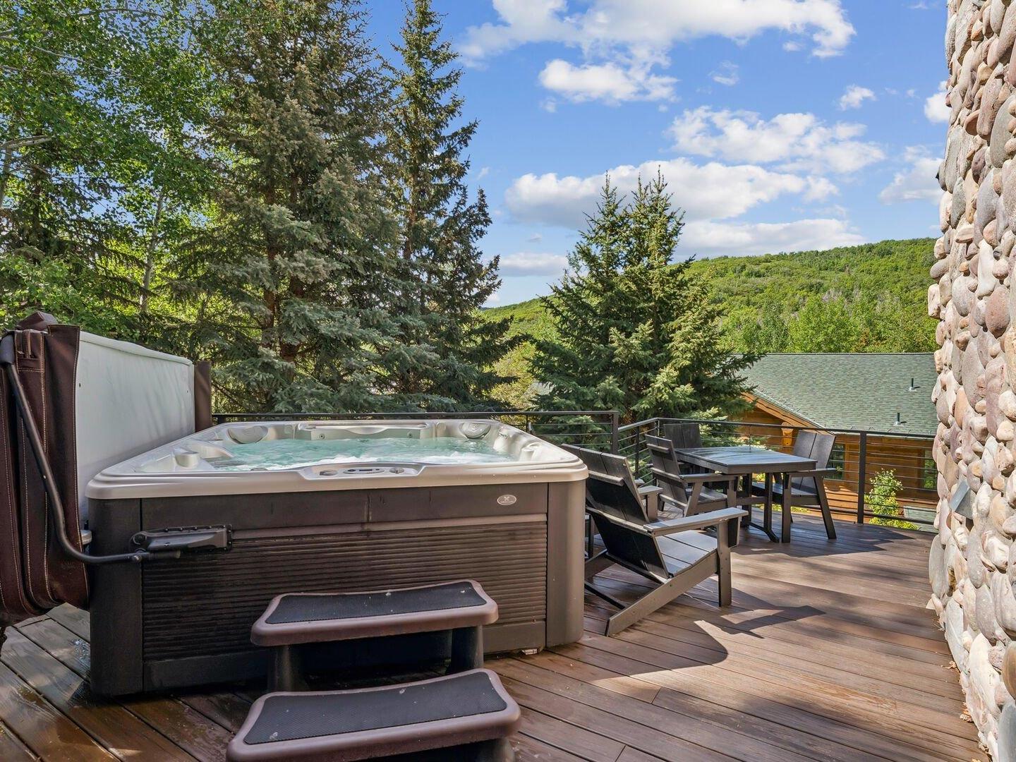 Open and expansive, the main level of 3165 thistle includes a fully equipped kitchen, dining area and living room. Quality furnishings are situated in front of a beautiful stone fireplace under vaulted ceilings in the living room where guests also have access to the huge wrap-around deck. Amazing views of the surrounding mountains can be enjoyed from the deck while relaxing in the large outdoor hot tub. Adjacent to the living room sits a large dining table with room for 10 guests. Right next to the dining table a breakfast bar allows for an additional 4 guests.