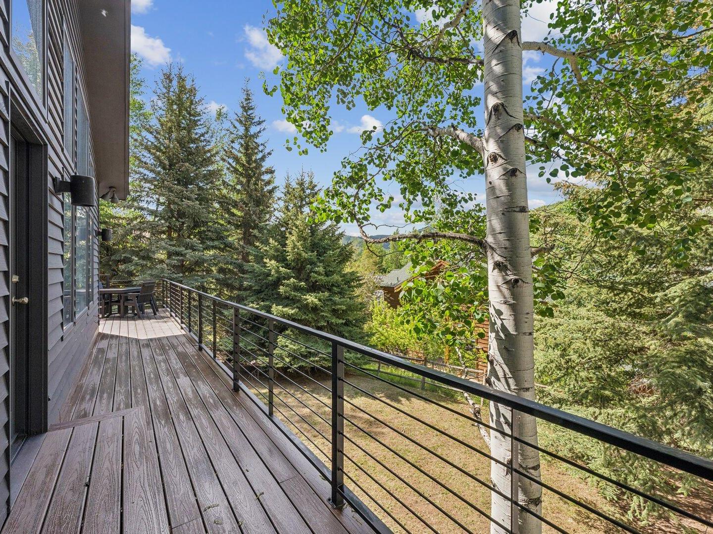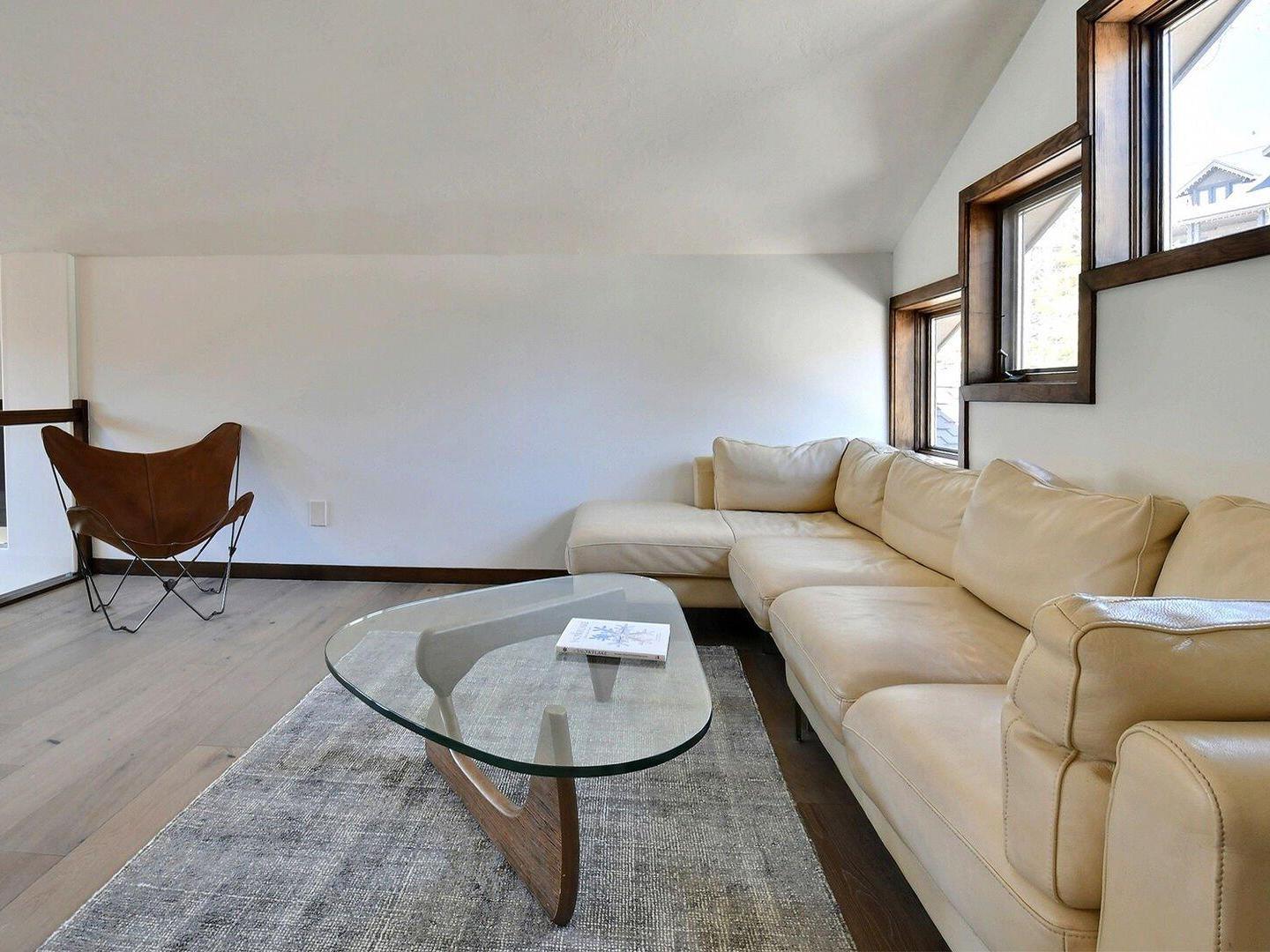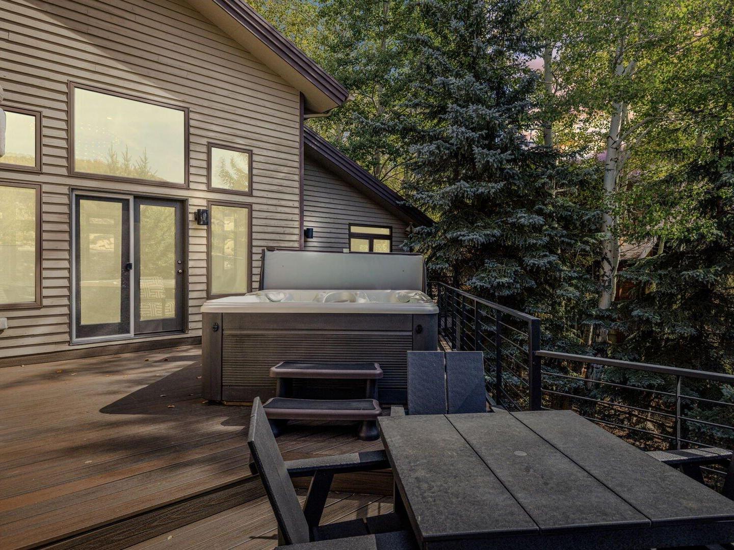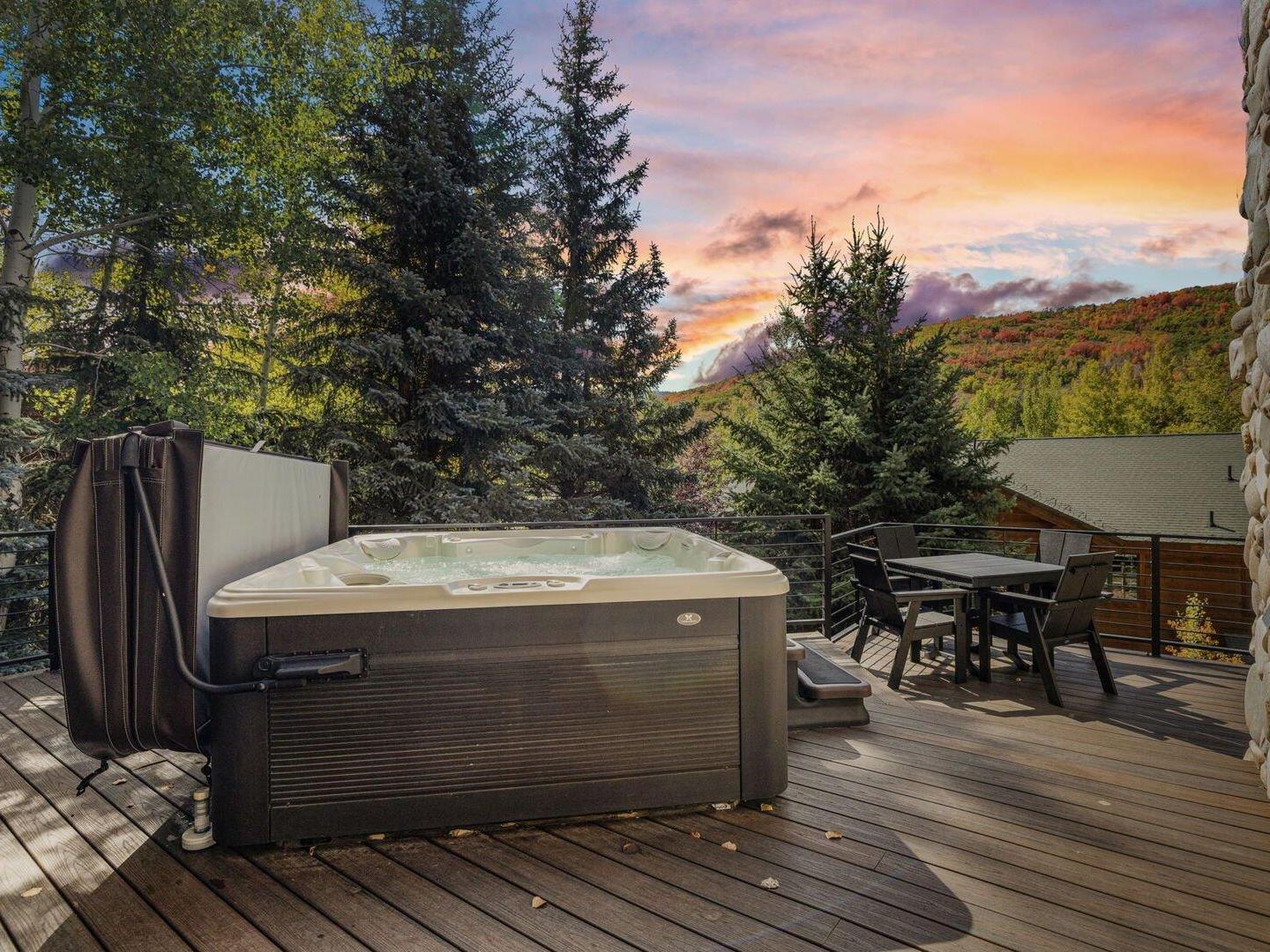 Open and expansive, the main level of 3165 thistle includes a fully equipped kitchen, dining area and living room. Quality furnishings are situated in front of a beautiful stone fireplace under vaulted ceilings in the living room where guests also have access to the huge wrap-around deck. Amazing views of the surrounding mountains can be enjoyed from the deck while relaxing in the large outdoor hot tub. Adjacent to the living room sits a large dining table with room for 10 guests. Right next to the dining table a breakfast bar allows for an additional 4 guests.