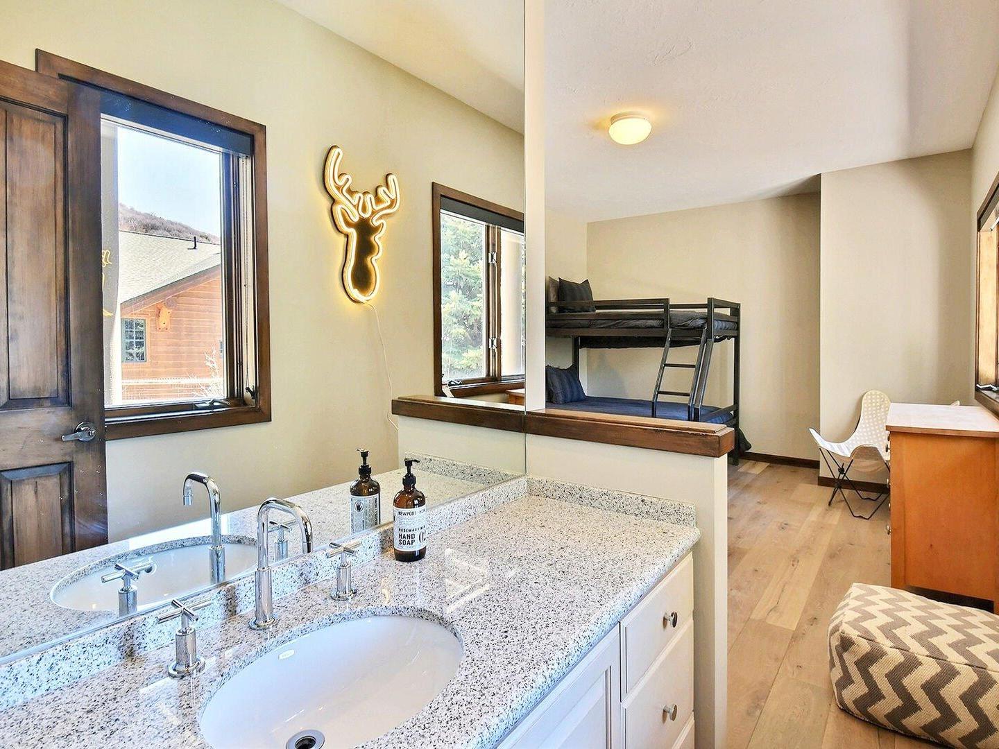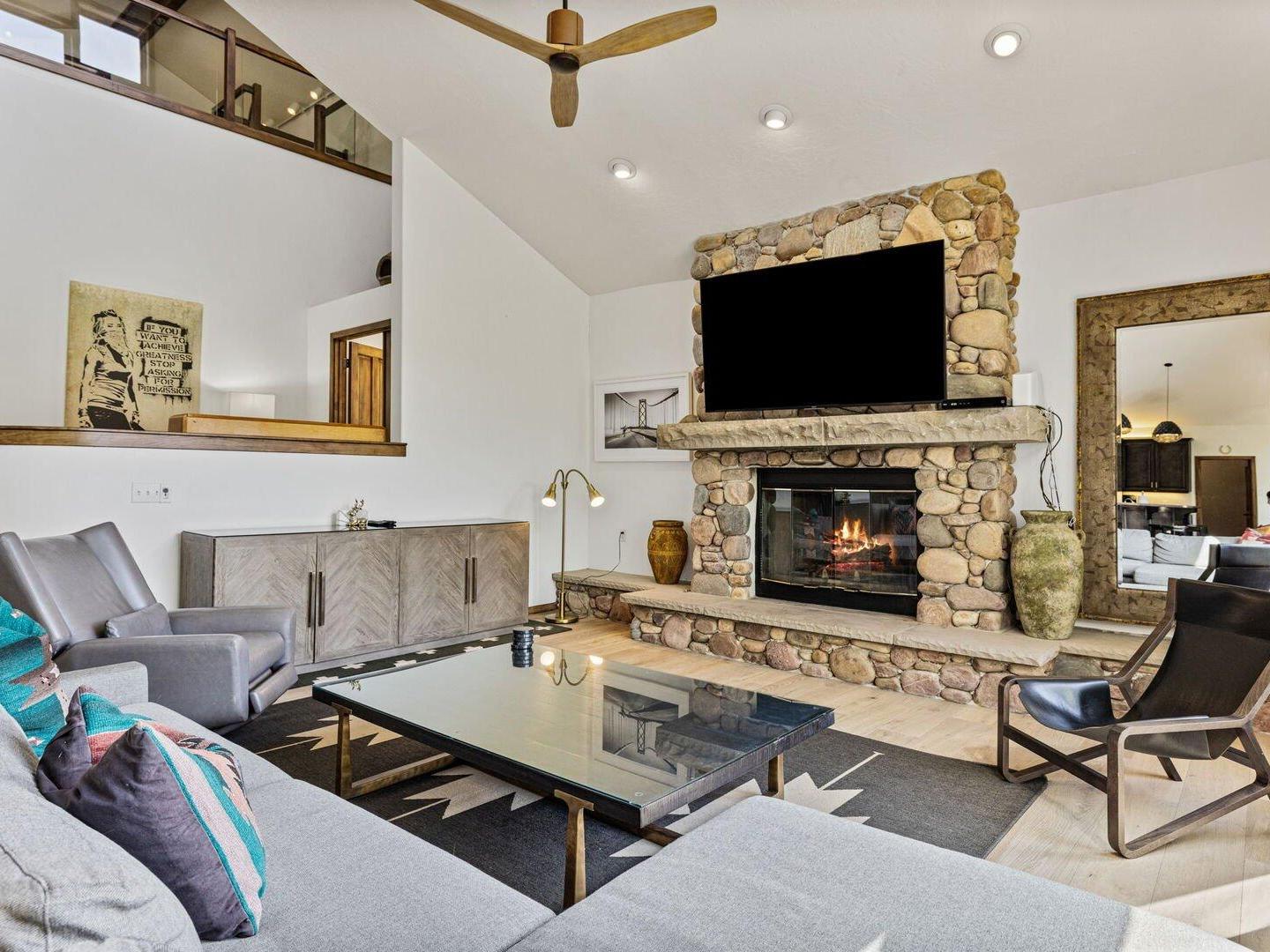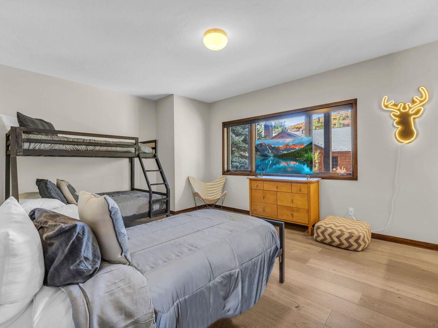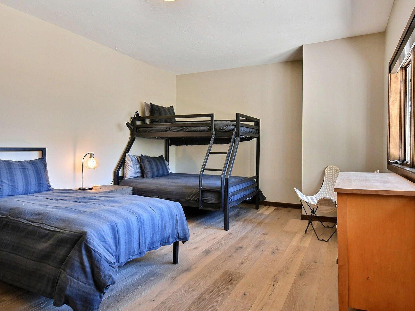 A large master suite with a King bed set in front of a gas fireplace and including a beautiful private bathroom with steam shower and jetted tub occupies the upper level of 3165 Thistle. There are two additional rooms with King beds, one also features a stone framed fireplace. Queen beds are offered in two of the guest bedrooms and the sixth bedroom is a Bunk room with a Twin over Full bunk bed plus a Twin bed.