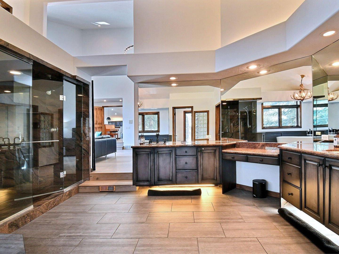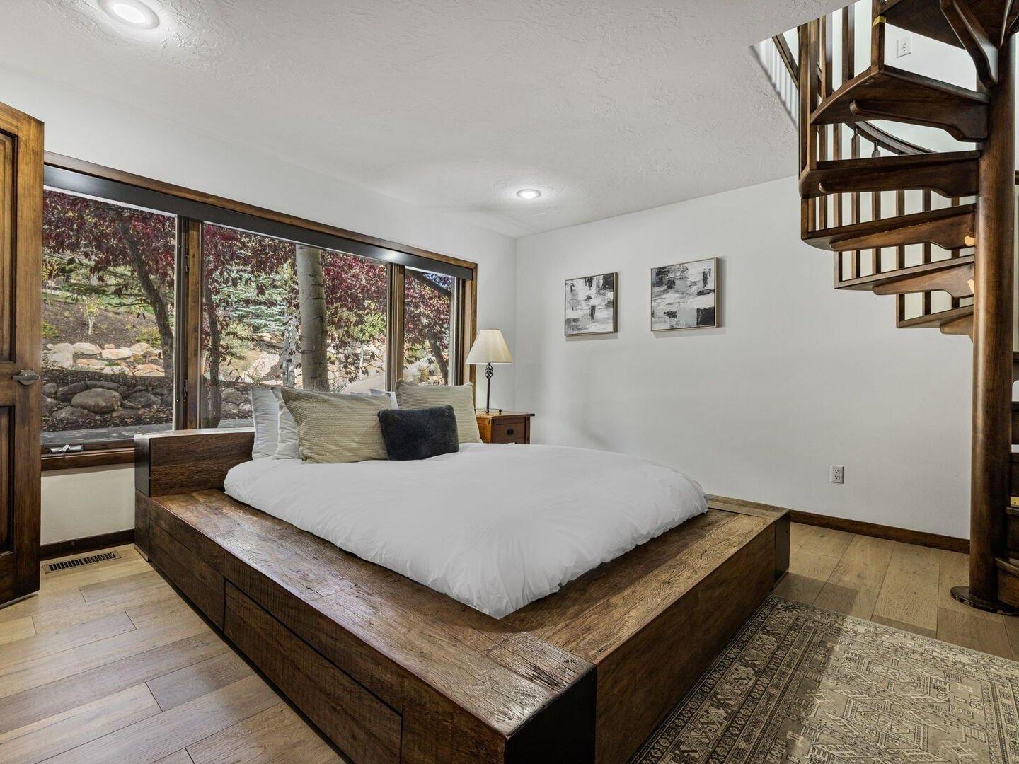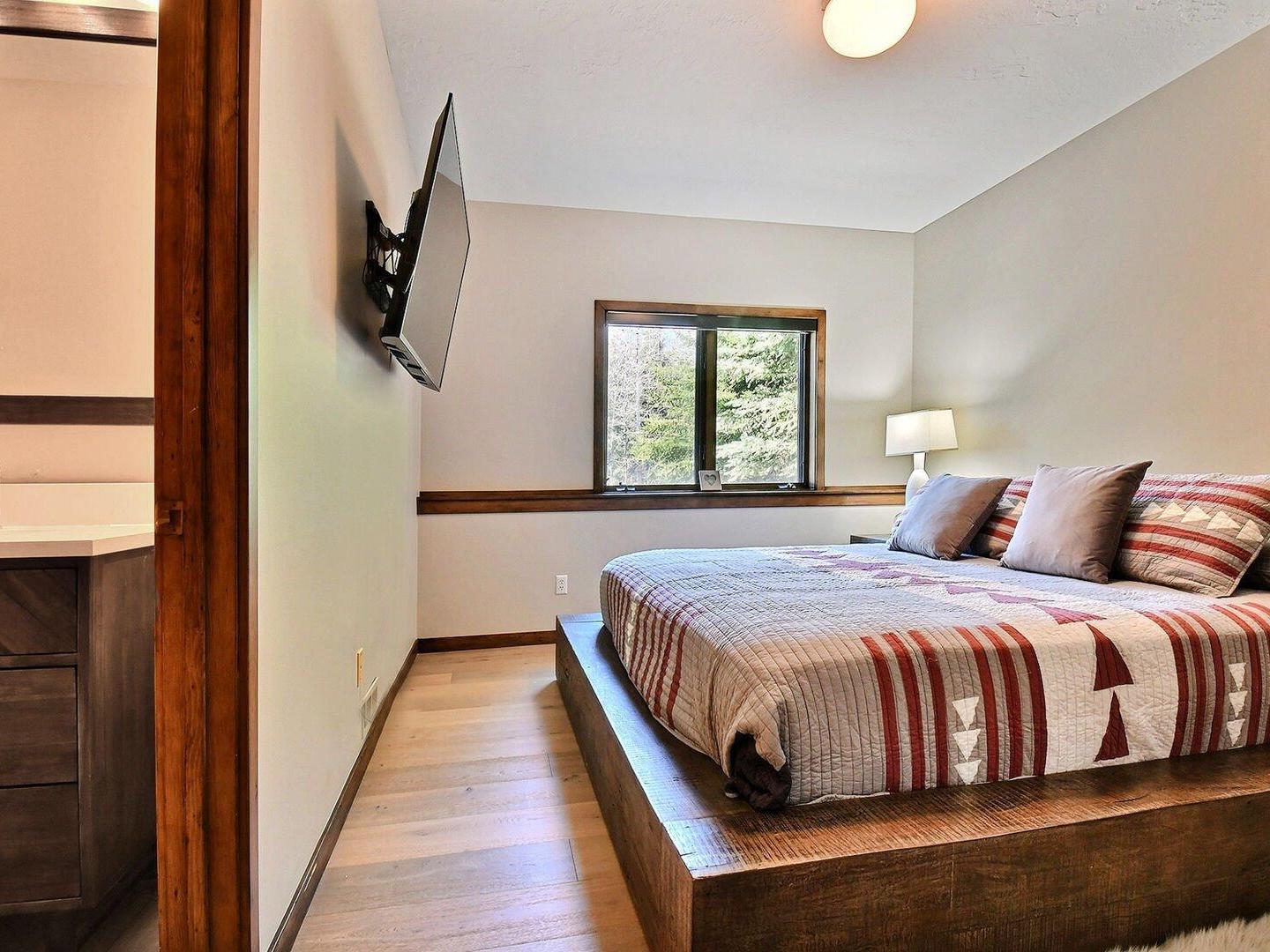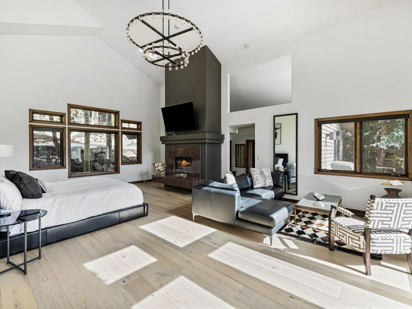 A large master suite with a King bed set in front of a gas fireplace and including a beautiful private bathroom with steam shower and jetted tub occupies the upper level of 3165 Thistle. There are two additional rooms with King beds, one also features a stone framed fireplace. Queen beds are offered in two of the guest bedrooms and the sixth bedroom is a Bunk room with a Twin over Full bunk bed plus a Twin bed.