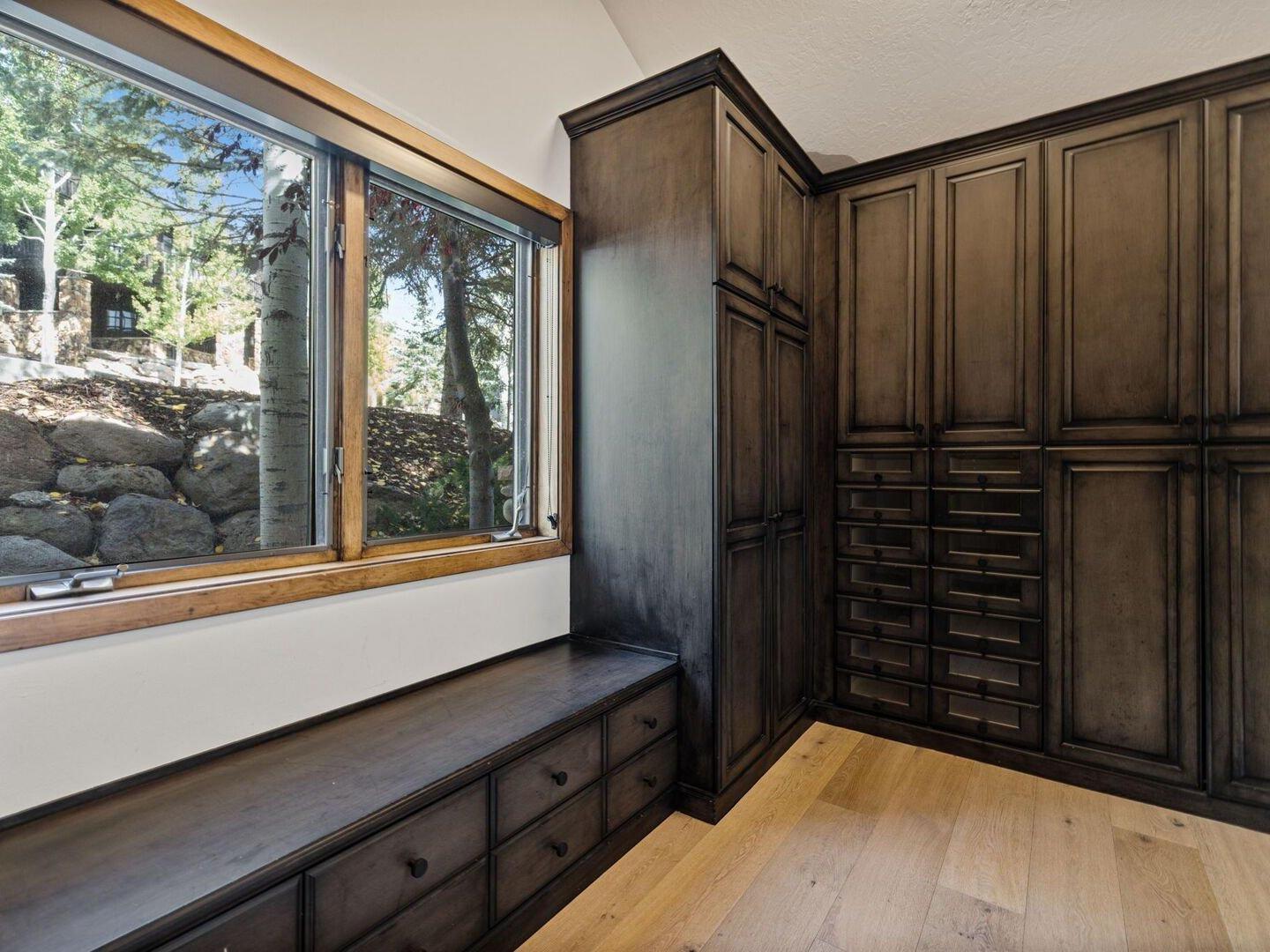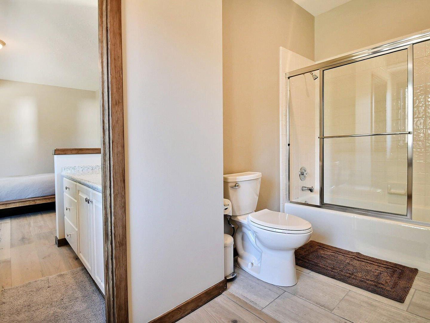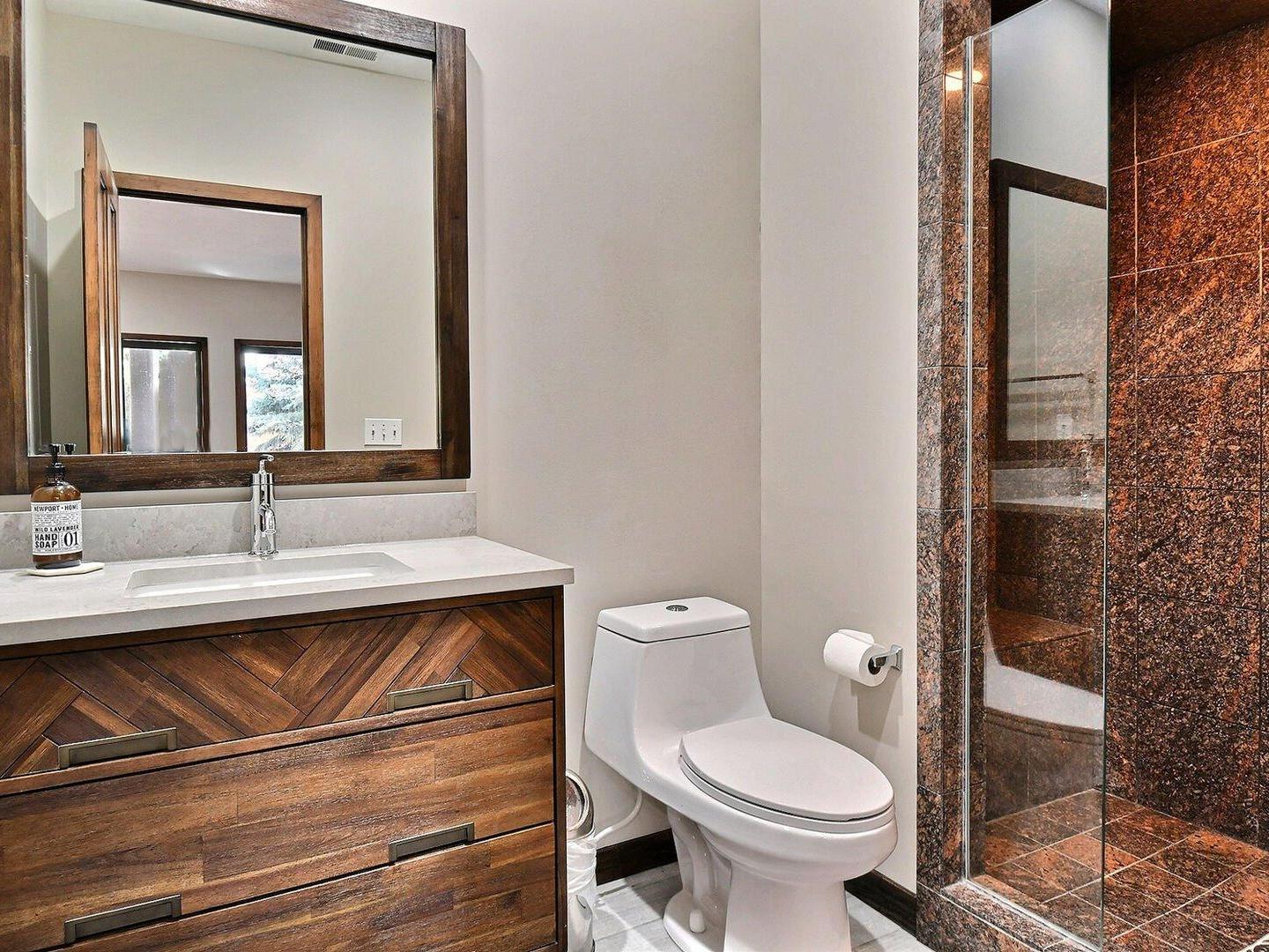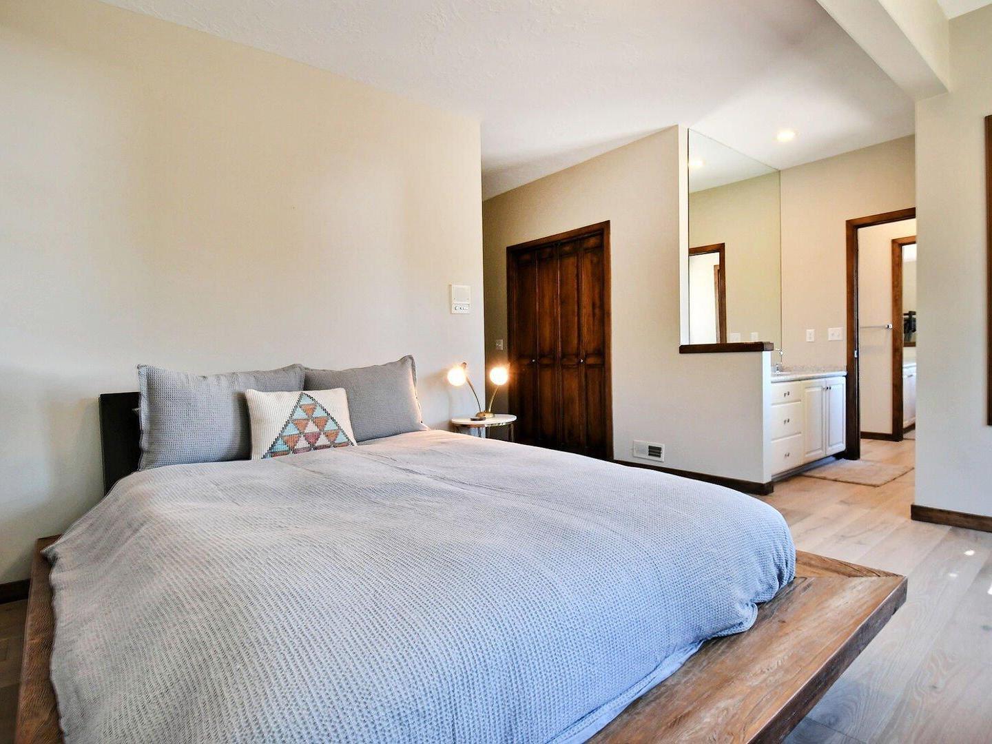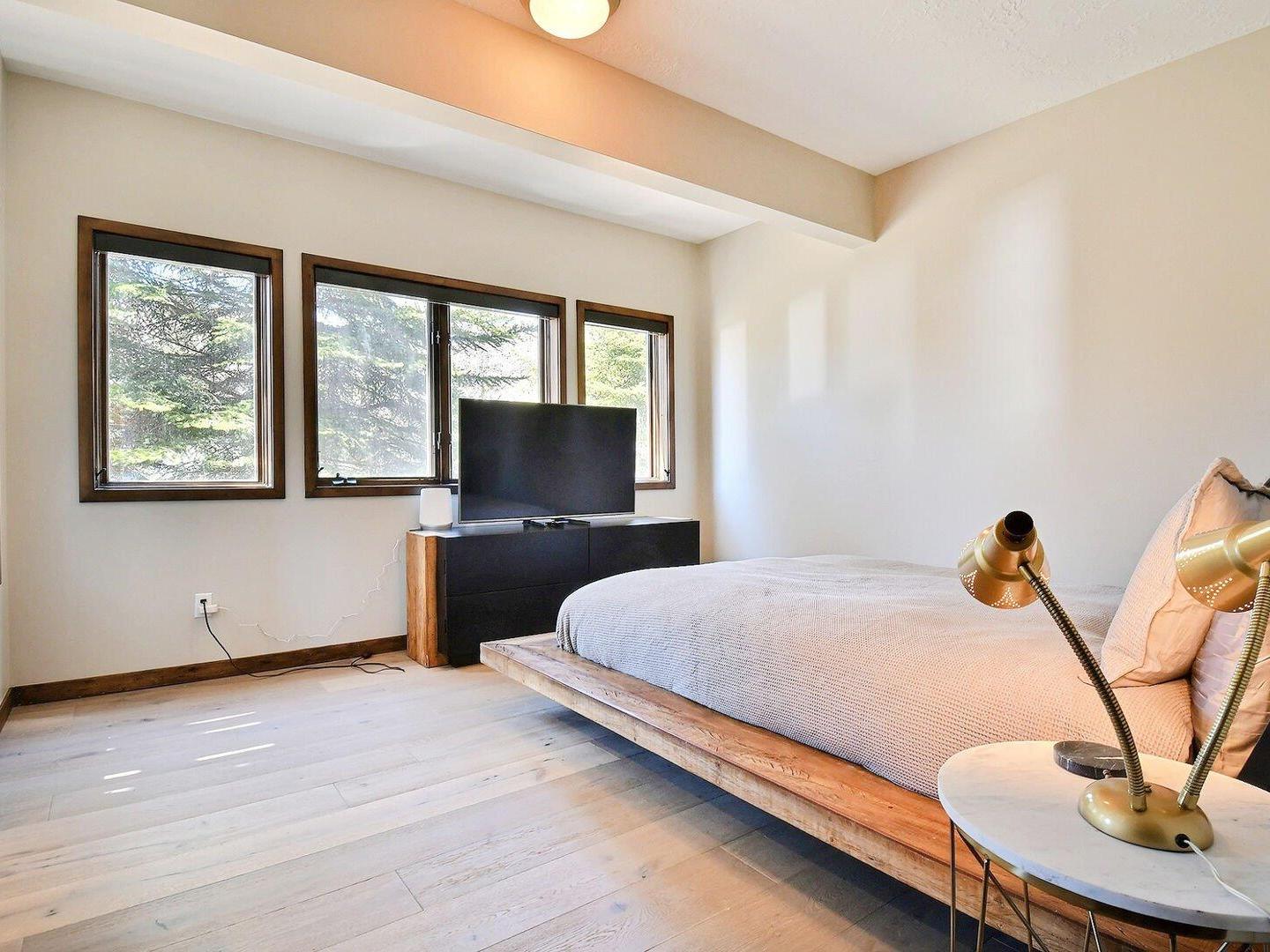 A large master suite with a King bed set in front of a gas fireplace and including a beautiful private bathroom with steam shower and jetted tub occupies the upper level of 3165 Thistle. There are two additional rooms with King beds, one also features a stone framed fireplace. Queen beds are offered in two of the guest bedrooms and the sixth bedroom is a Bunk room with a Twin over Full bunk bed plus a Twin bed.