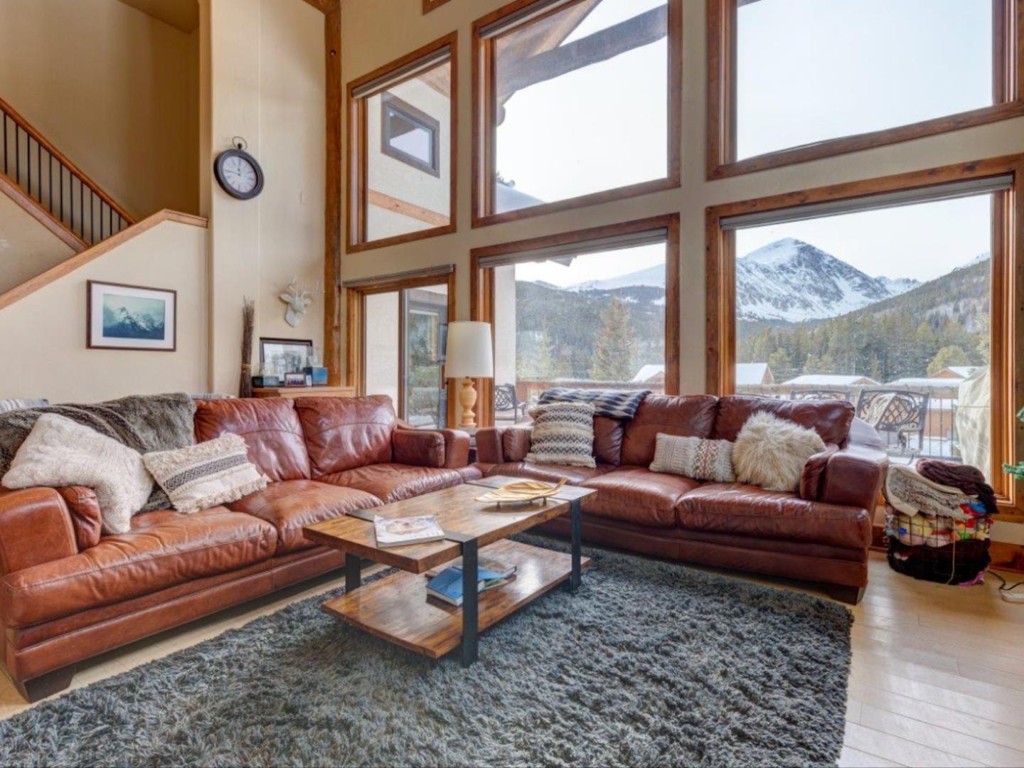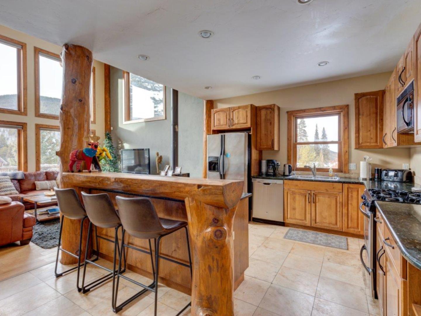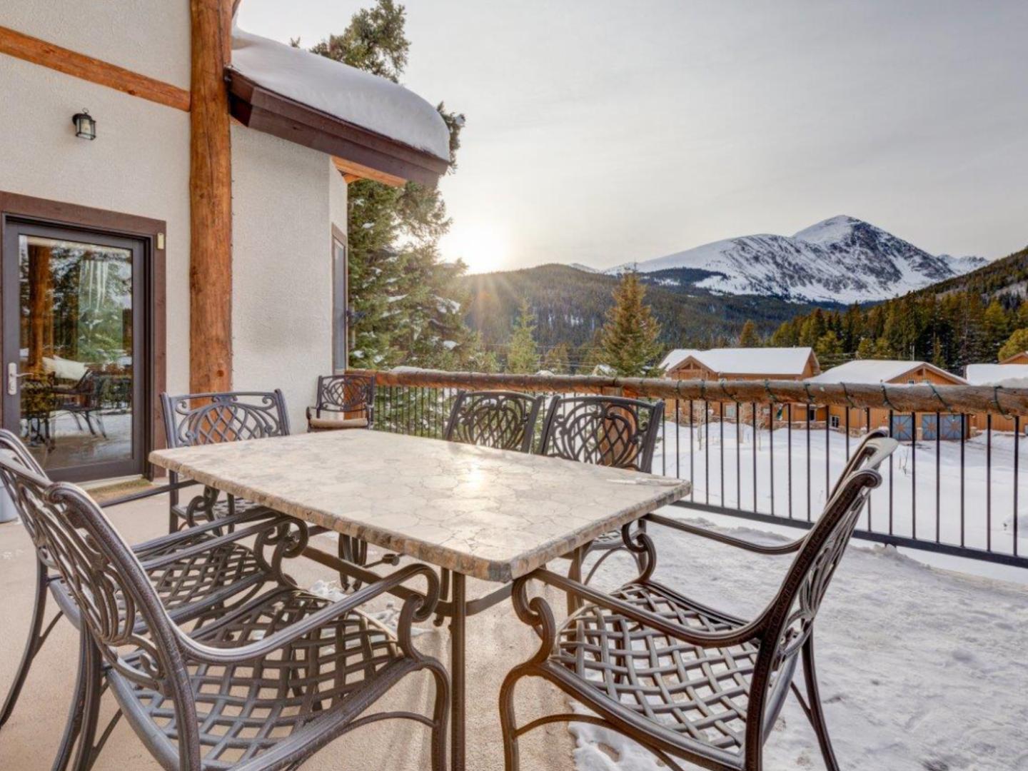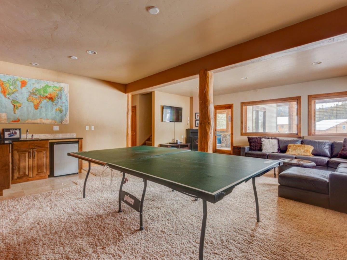 With its 25-foot ceilings, plush sectional sofa and massive flat screen television, the main floor living room offers ample, inviting space to hang out and unwind. In the neighboring open kitchen, you’ll find all your cooking essentials, plus a charming lodgepole breakfast bar for two, and a cozy wood-burning stove. Up to 10 guests can enjoy a home-cooked meal or gather around the adjacent dining table for a group game night. Also on this level, a large deck provides soaring Quandary Peak views and a table for outside dining. Retreat to the lower floor, to enjoy more living space for hours of group entertainment. A generous-sized family room boasts an oversized sofa, massive flat screen television and a gas fireplace, along with a bar, ping-pong table and ample room to stretch out. You’ll also find a relaxing indoor spa room, featuring a private hot tub and stunning scenery -the perfect spot to gather after an exhilarating alpine day.