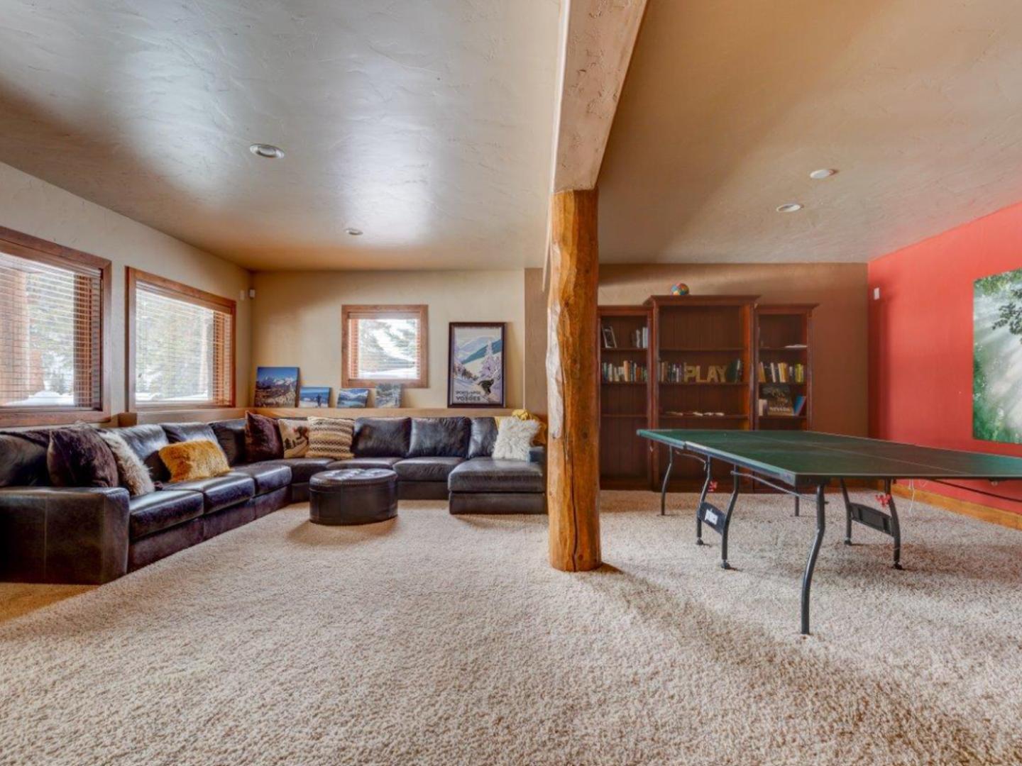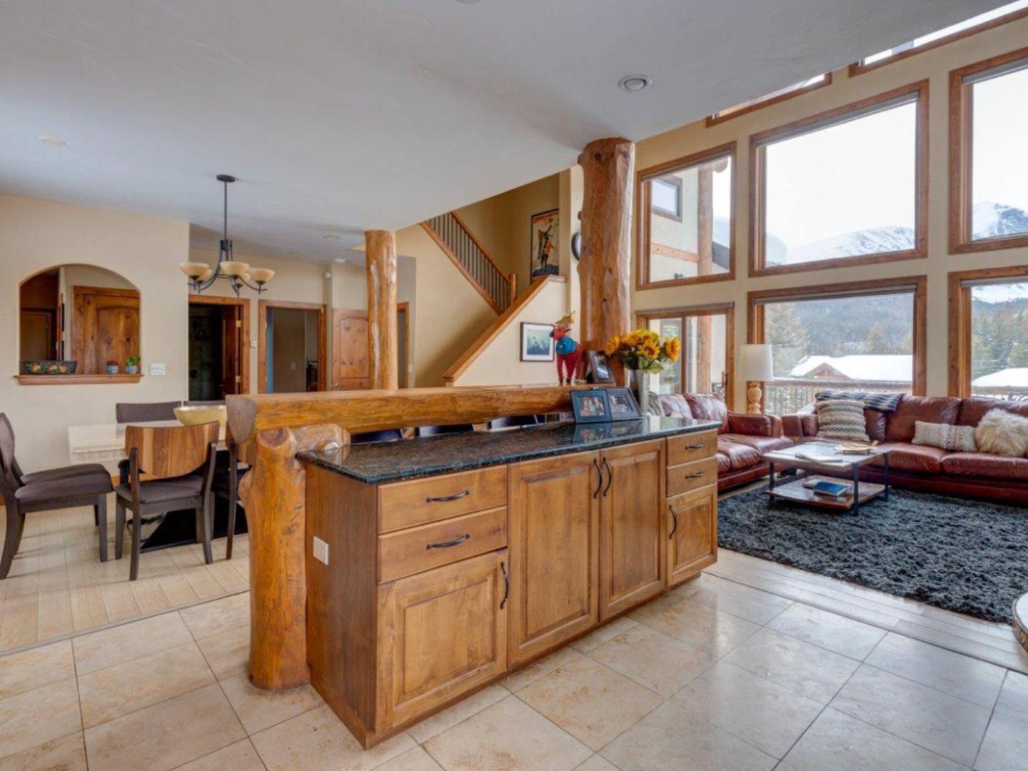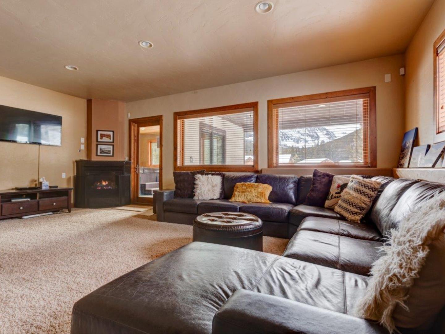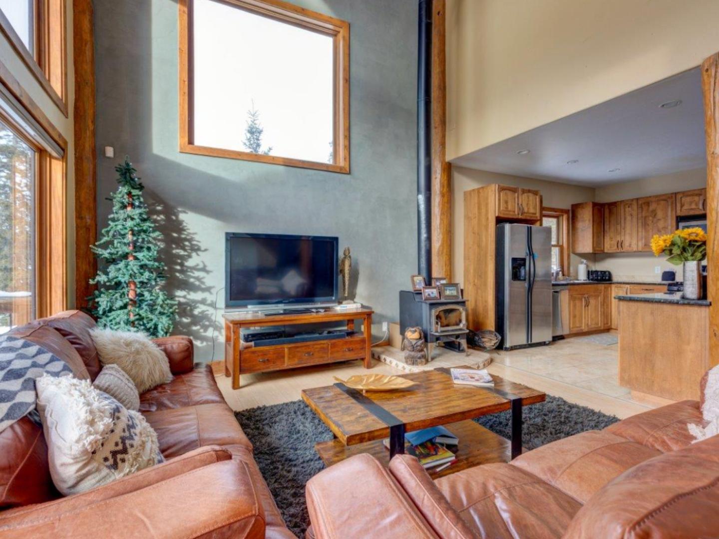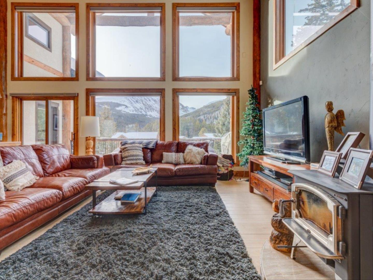 With its 25-foot ceilings, plush sectional sofa and massive flat screen television, the main floor living room offers ample, inviting space to hang out and unwind. In the neighboring open kitchen, you’ll find all your cooking essentials, plus a charming lodgepole breakfast bar for two, and a cozy wood-burning stove. Up to 10 guests can enjoy a home-cooked meal or gather around the adjacent dining table for a group game night. Also on this level, a large deck provides soaring Quandary Peak views and a table for outside dining. Retreat to the lower floor, to enjoy more living space for hours of group entertainment. A generous-sized family room boasts an oversized sofa, massive flat screen television and a gas fireplace, along with a bar, ping-pong table and ample room to stretch out. You’ll also find a relaxing indoor spa room, featuring a private hot tub and stunning scenery -the perfect spot to gather after an exhilarating alpine day.