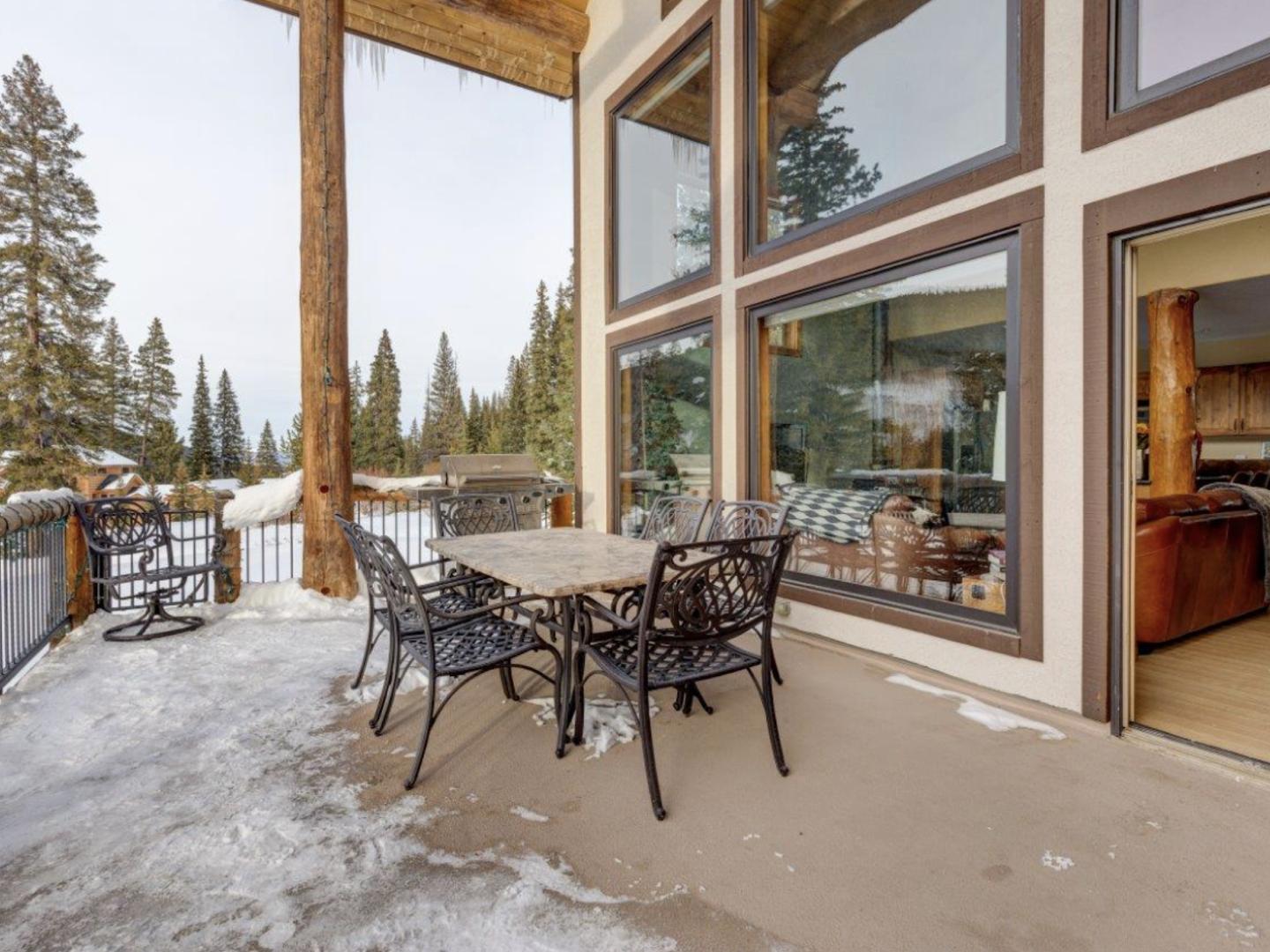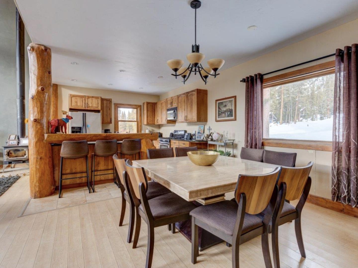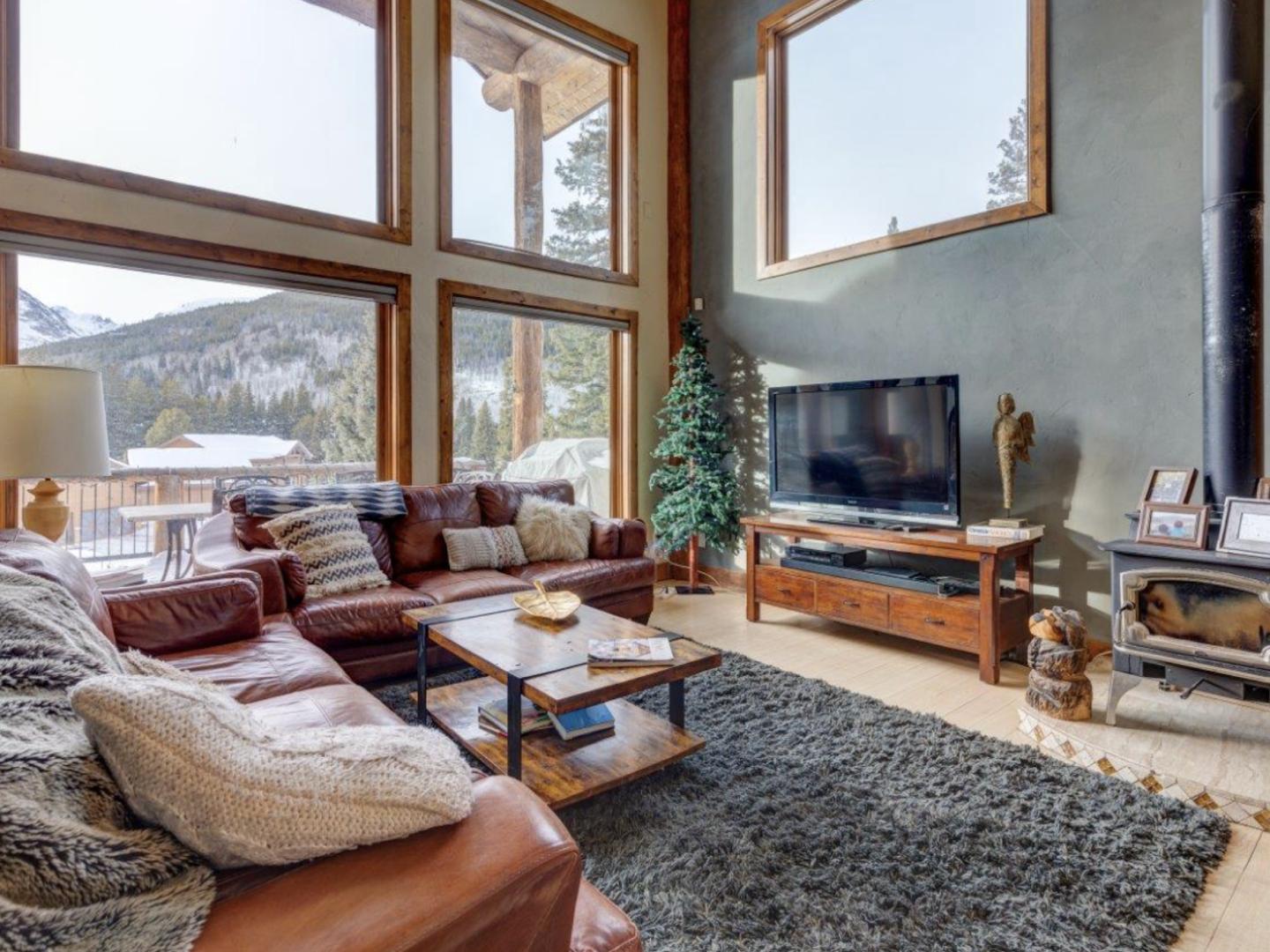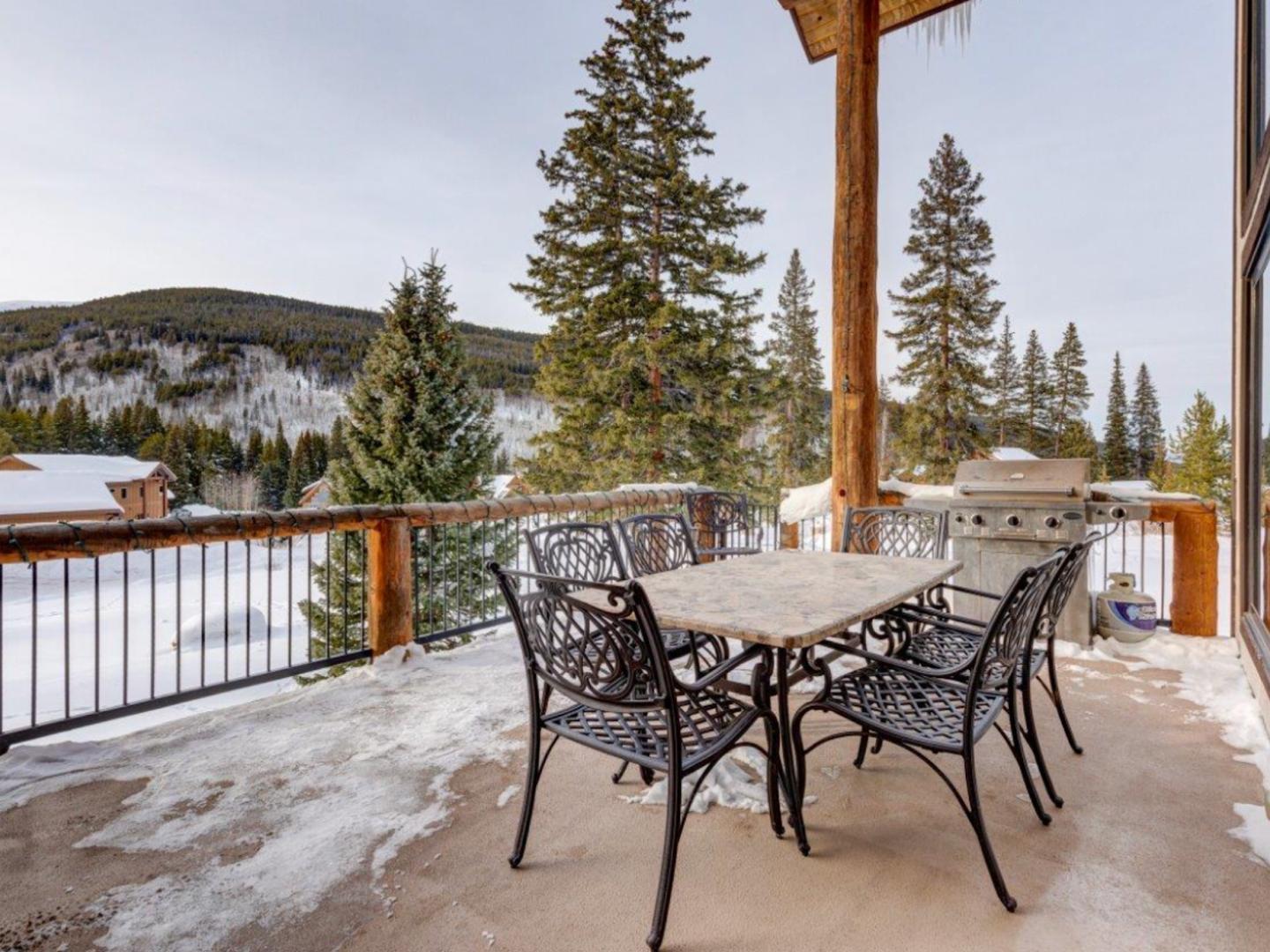 With its 25-foot ceilings, plush sectional sofa and massive flat screen television, the main floor living room offers ample, inviting space to hang out and unwind. In the neighboring open kitchen, you’ll find all your cooking essentials, plus a charming lodgepole breakfast bar for two, and a cozy wood-burning stove. Up to 10 guests can enjoy a home-cooked meal or gather around the adjacent dining table for a group game night. Also on this level, a large deck provides soaring Quandary Peak views and a table for outside dining. Retreat to the lower floor, to enjoy more living space for hours of group entertainment. A generous-sized family room boasts an oversized sofa, massive flat screen television and a gas fireplace, along with a bar, ping-pong table and ample room to stretch out. You’ll also find a relaxing indoor spa room, featuring a private hot tub and stunning scenery -the perfect spot to gather after an exhilarating alpine day.