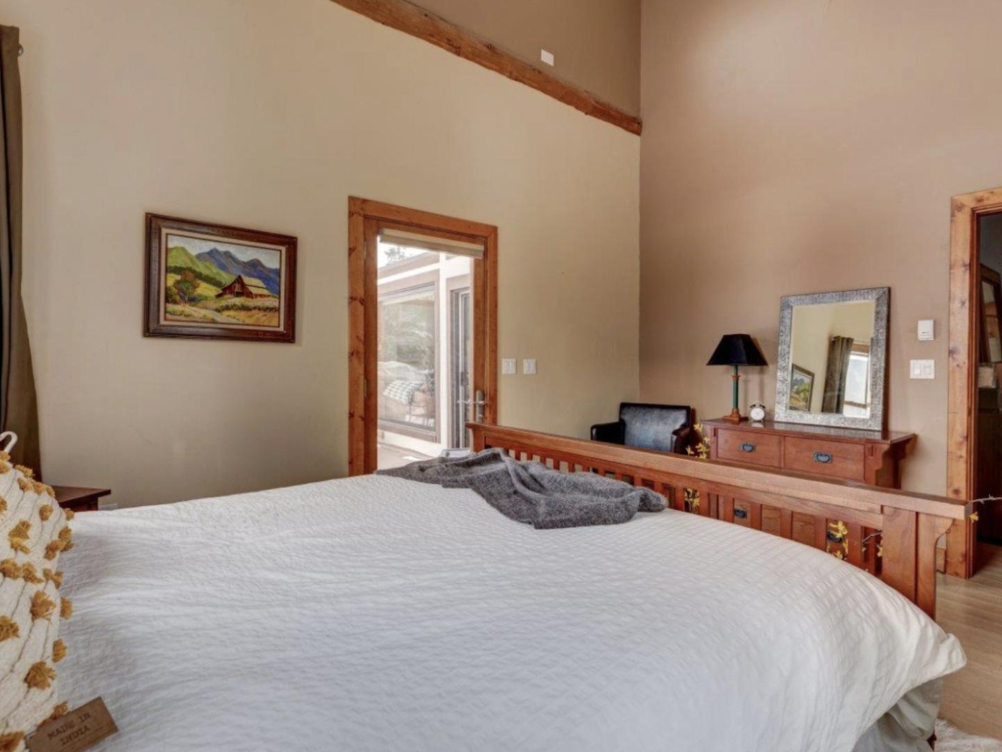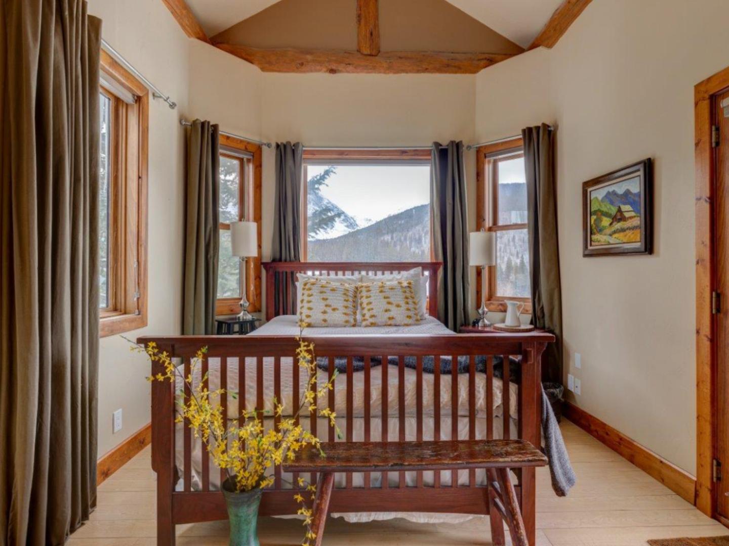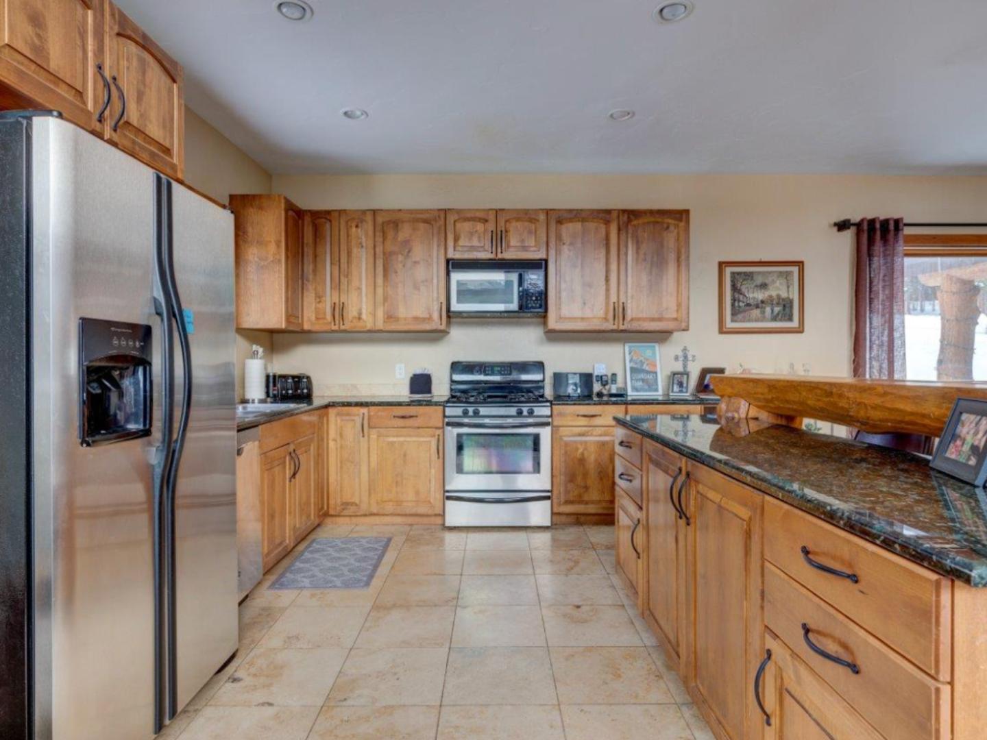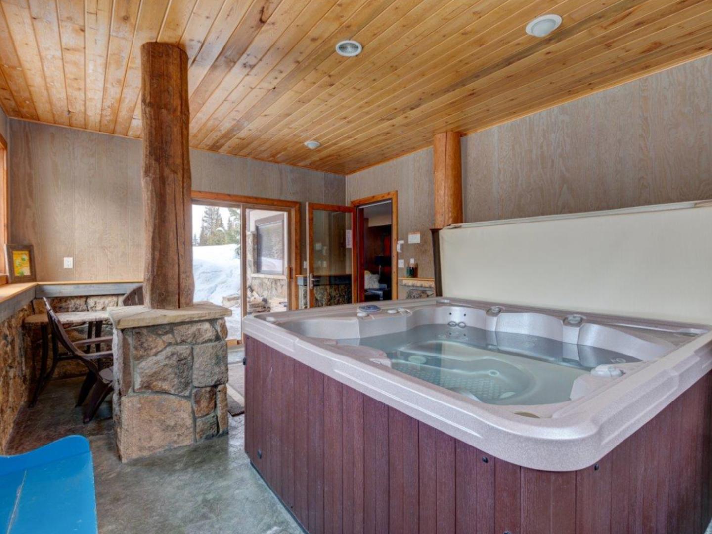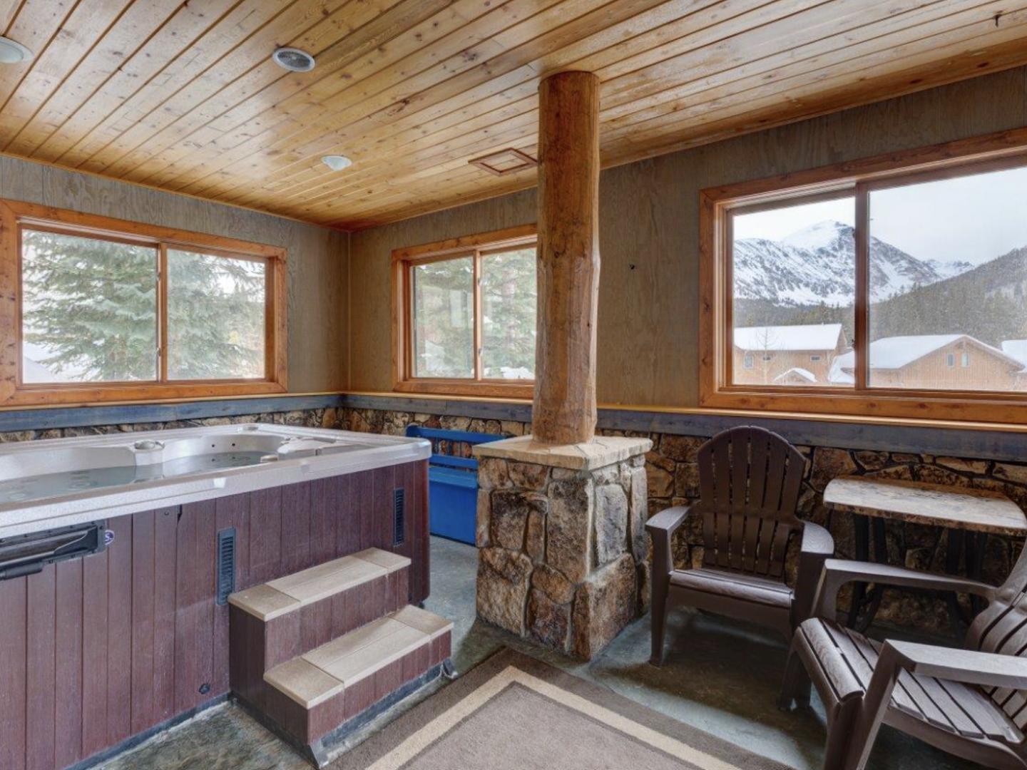 With its 25-foot ceilings, plush sectional sofa and massive flat screen television, the main floor living room offers ample, inviting space to hang out and unwind. In the neighboring open kitchen, you’ll find all your cooking essentials, plus a charming lodgepole breakfast bar for two, and a cozy wood-burning stove. Up to 10 guests can enjoy a home-cooked meal or gather around the adjacent dining table for a group game night. Also on this level, a large deck provides soaring Quandary Peak views and a table for outside dining. Retreat to the lower floor, to enjoy more living space for hours of group entertainment. A generous-sized family room boasts an oversized sofa, massive flat screen television and a gas fireplace, along with a bar, ping-pong table and ample room to stretch out. You’ll also find a relaxing indoor spa room, featuring a private hot tub and stunning scenery -the perfect spot to gather after an exhilarating alpine day.
