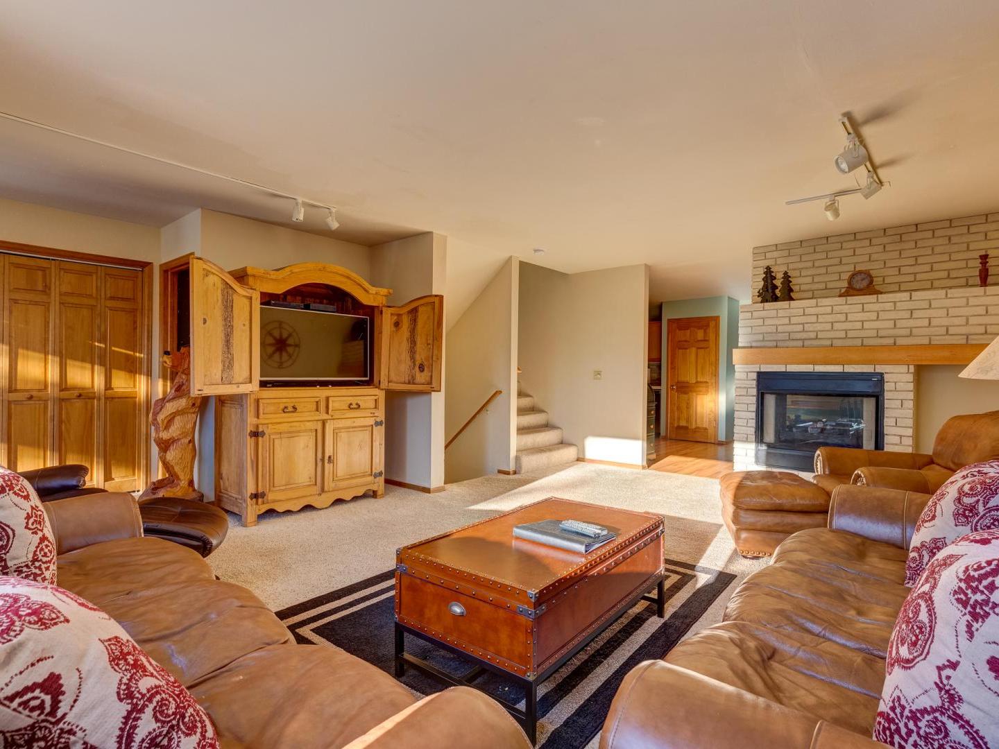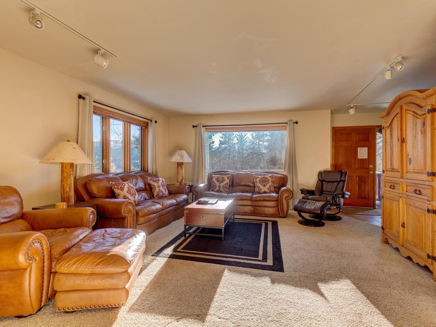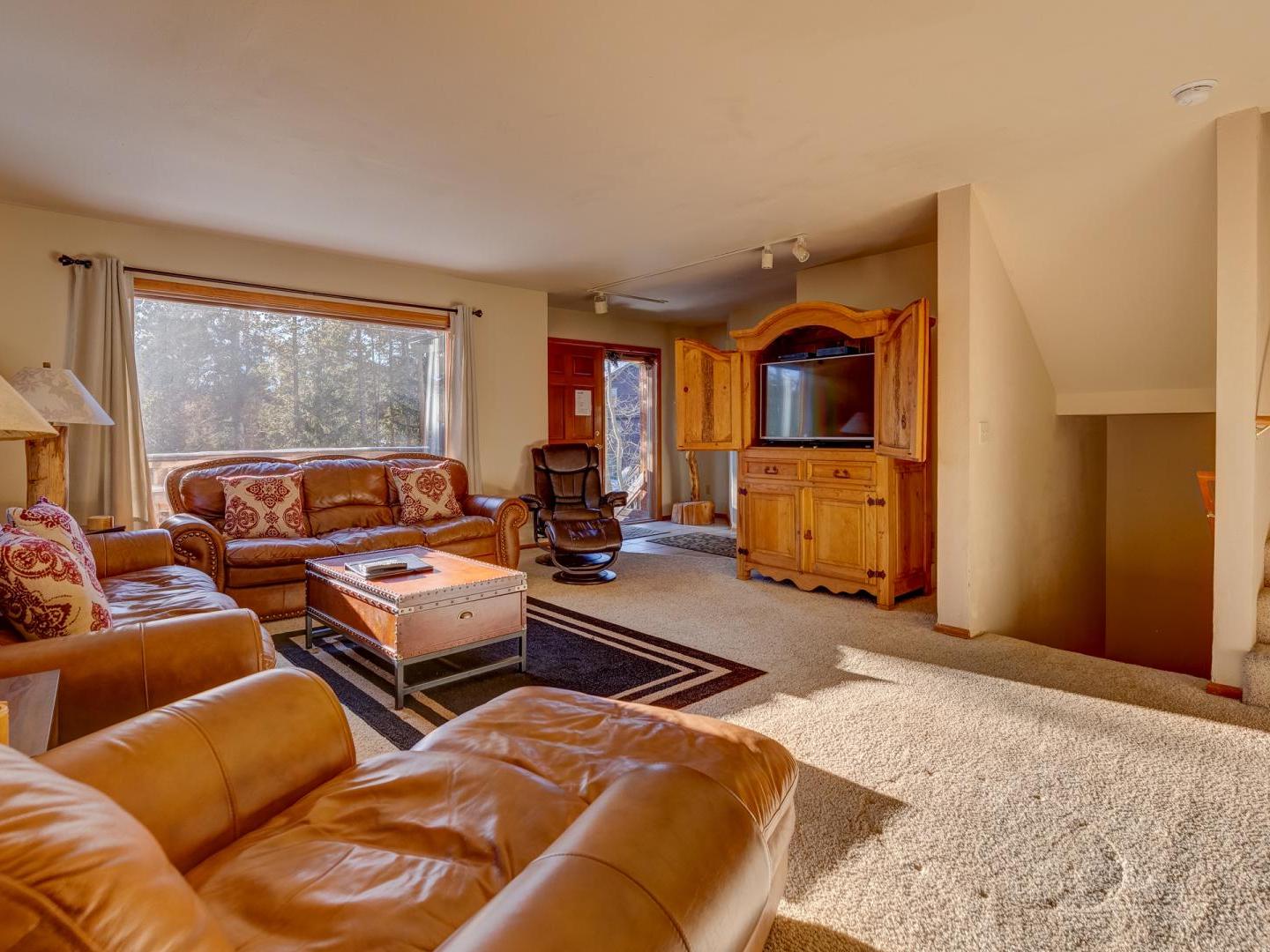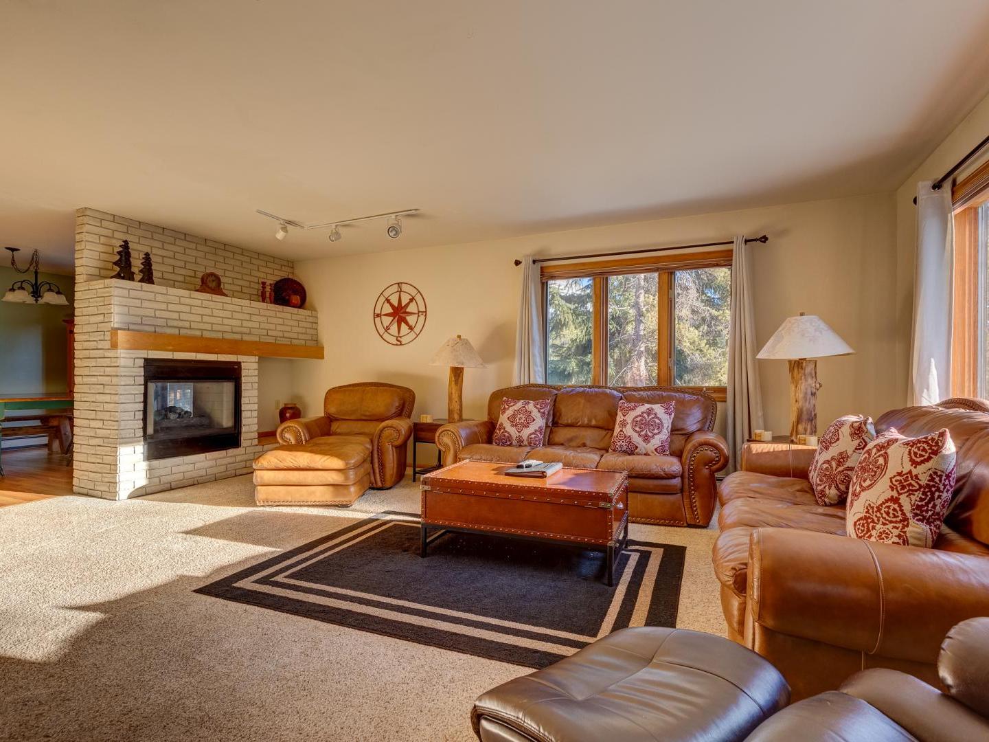 Spacious yet cozy, the main floor living room boasts leather sofas, a large flat screen television and a plush leather recliner, set in front of a dual-sided gas fireplace. Around the corner, a fully equipped kitchen offers all your cooking needs, while the dining area, located on the other side of the fireplace, features a large table for eight guests. Sliding glass doors lead to a generous deck, offering a grill, seating, and a lovely wooded view. On the back patio surrounded by mature shady trees, a private relaxing hot tub offers the perfect place to unwind after a day on the slopes.