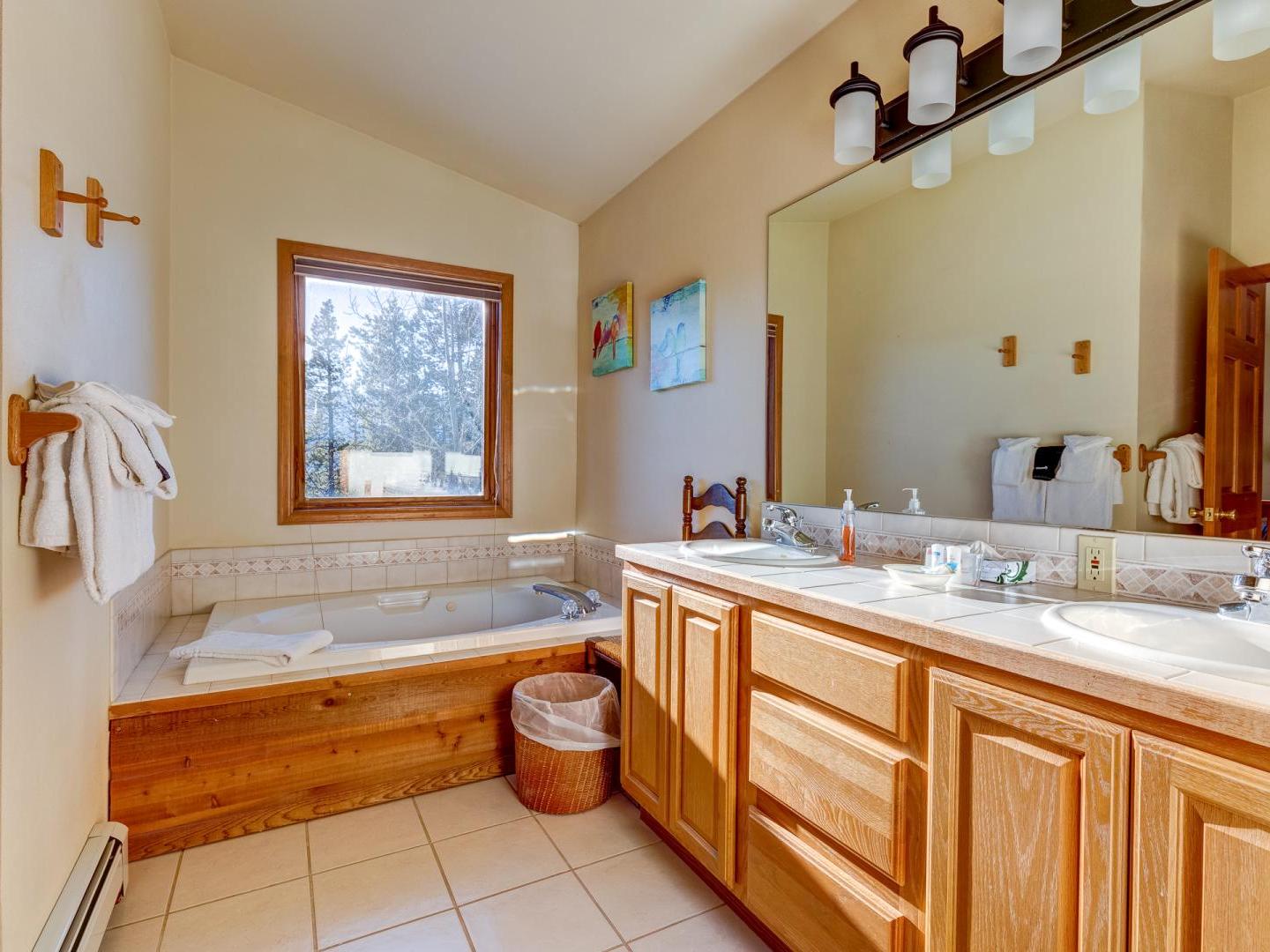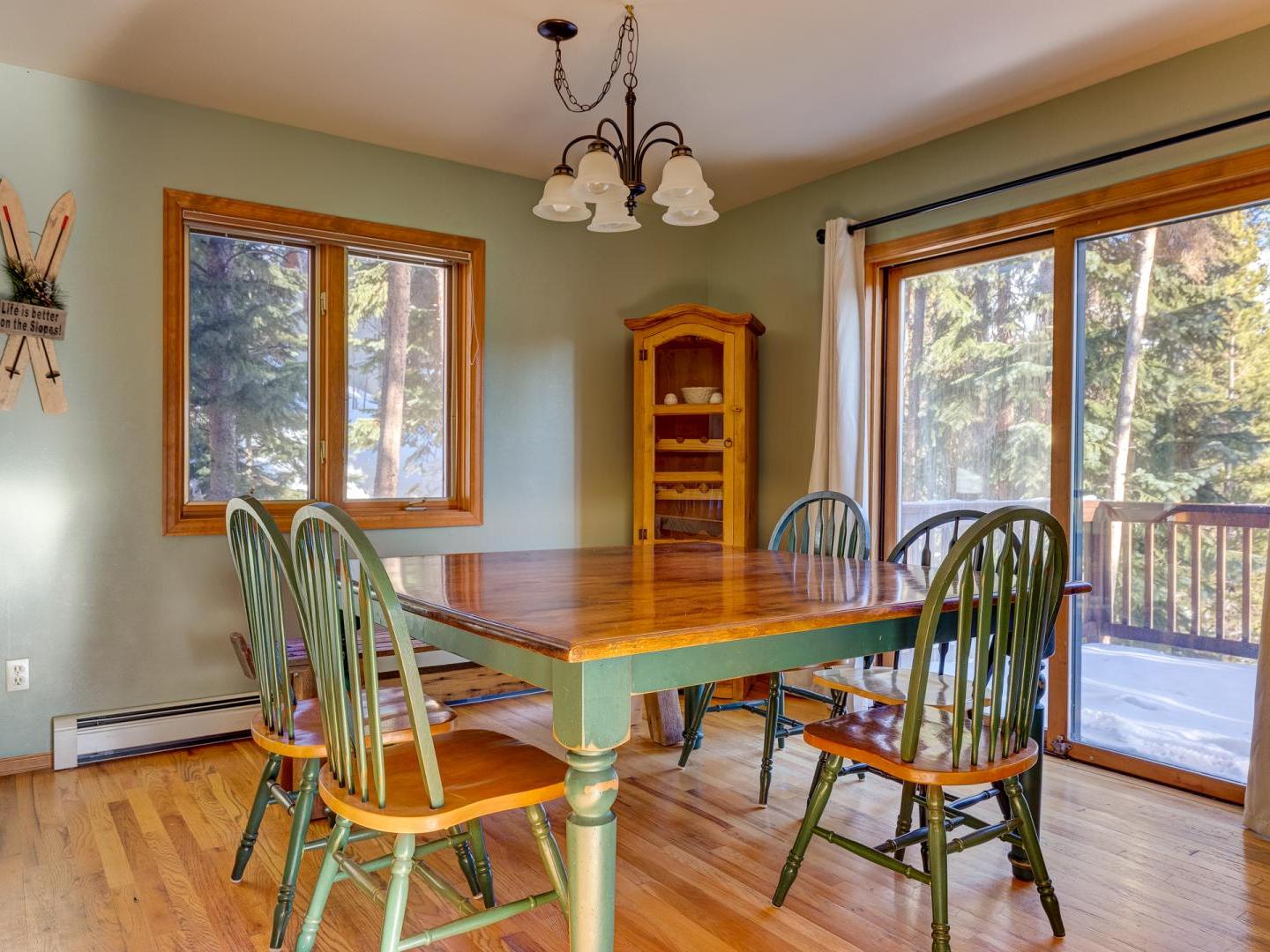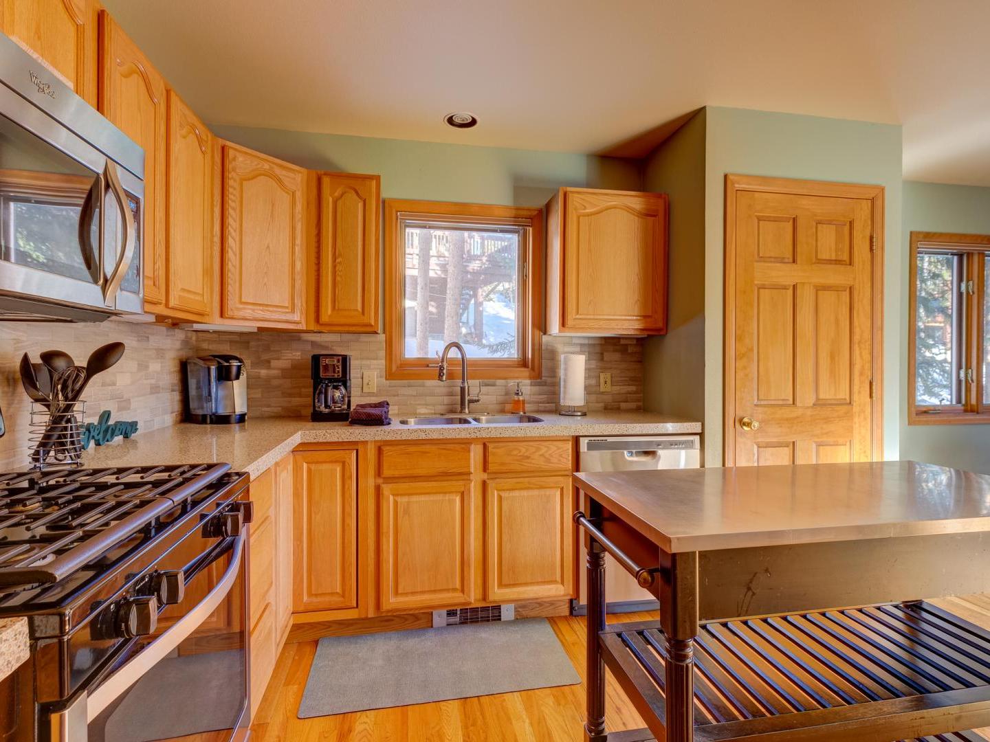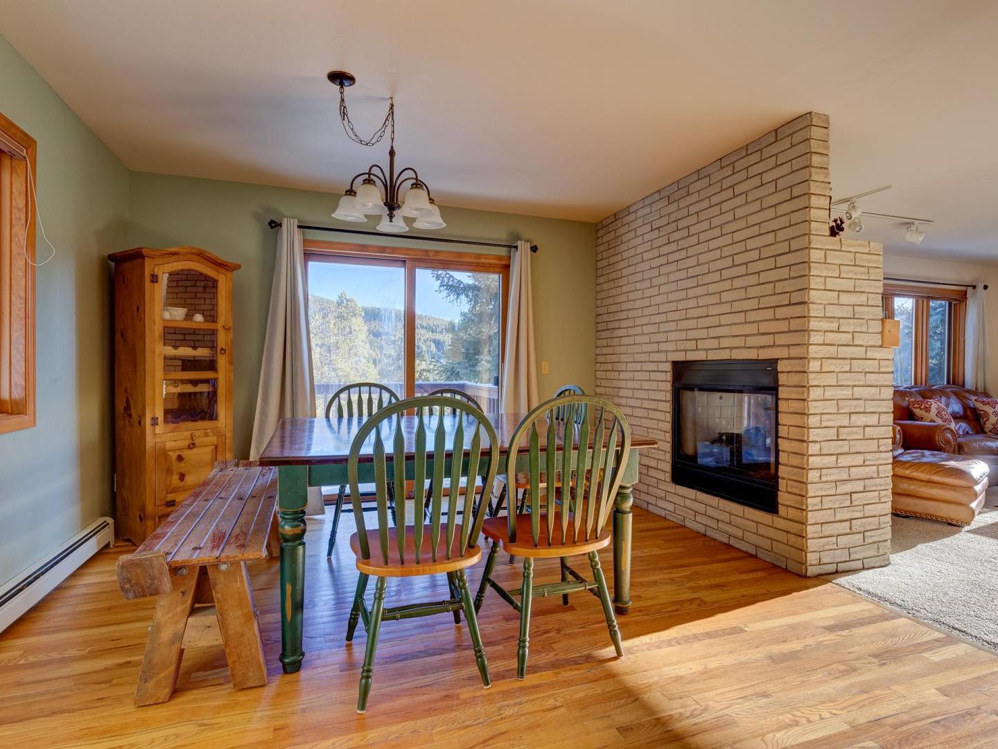 Spacious yet cozy, the main floor living room boasts leather sofas, a large flat screen television and a plush leather recliner, set in front of a dual-sided gas fireplace. Around the corner, a fully equipped kitchen offers all your cooking needs, while the dining area, located on the other side of the fireplace, features a large table for eight guests. Sliding glass doors lead to a generous deck, offering a grill, seating, and a lovely wooded view. On the back patio surrounded by mature shady trees, a private relaxing hot tub offers the perfect place to unwind after a day on the slopes.