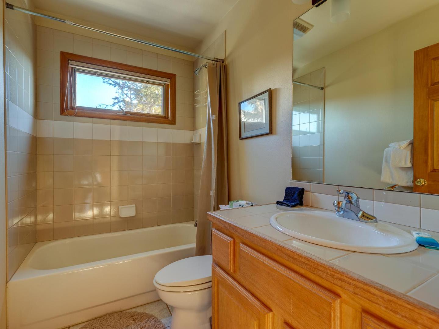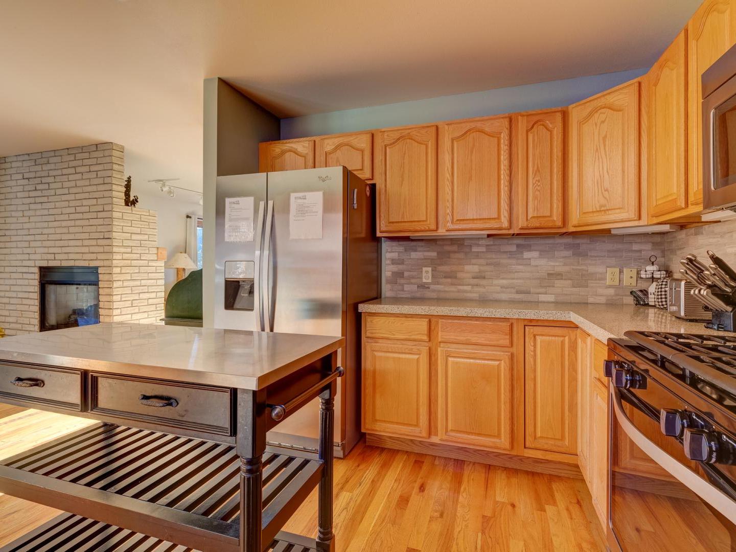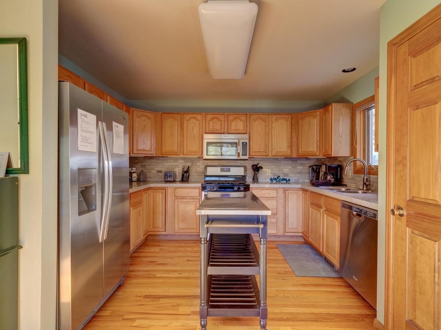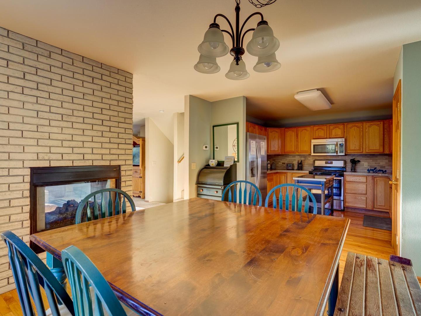 Spacious yet cozy, the main floor living room boasts leather sofas, a large flat screen television and a plush leather recliner, set in front of a dual-sided gas fireplace. Around the corner, a fully equipped kitchen offers all your cooking needs, while the dining area, located on the other side of the fireplace, features a large table for eight guests. Sliding glass doors lead to a generous deck, offering a grill, seating, and a lovely wooded view. On the back patio surrounded by mature shady trees, a private relaxing hot tub offers the perfect place to unwind after a day on the slopes.