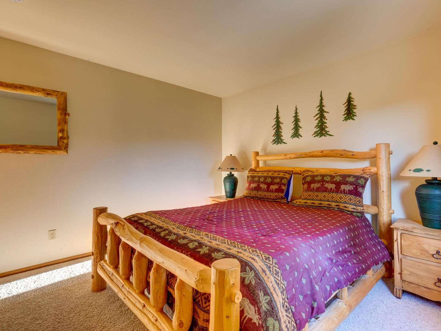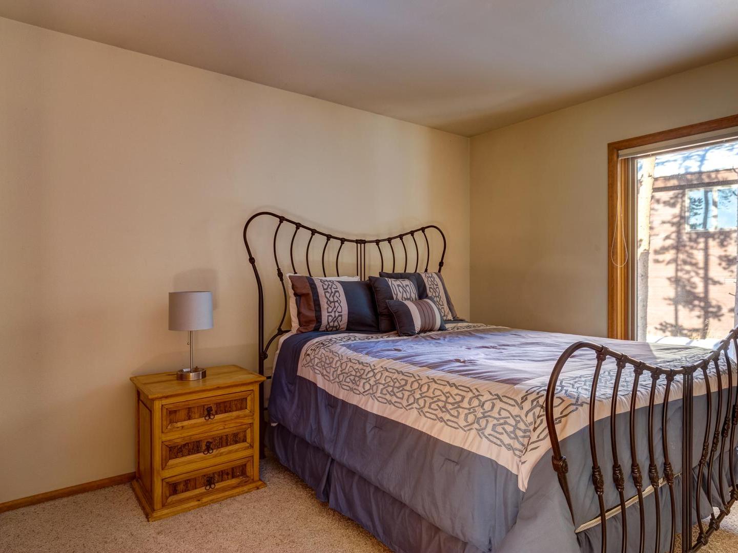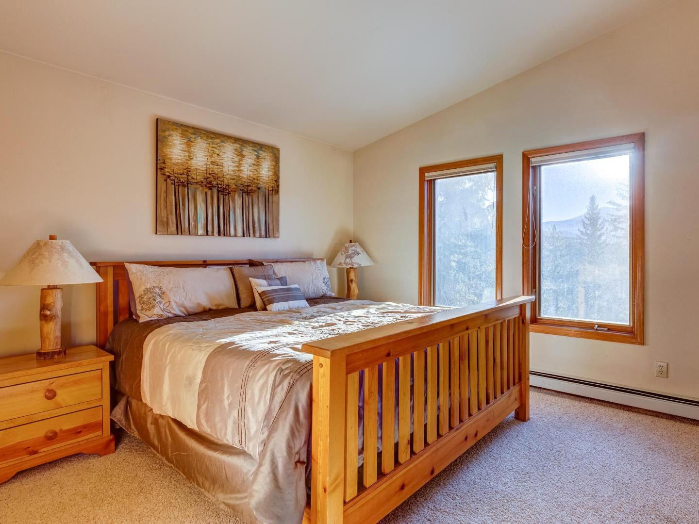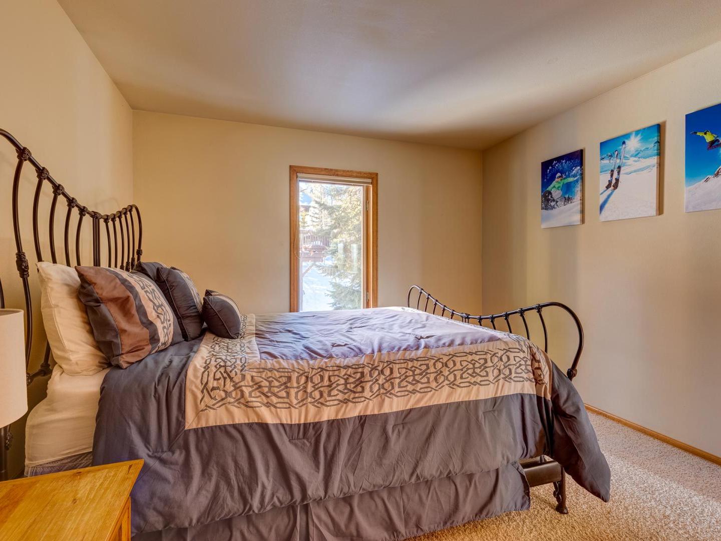 Three bedrooms plus a den offer a good night’s rest for up to nine vacationers. Perched on the top level, the master boasts a comfortable bed, ample closet space and a private luxurious bathroom featuring a jetted tub with an alpine view. Bedroom two offers a sunny view of Baldy Mountain and shares a hallway bathroom with the third guest room. For added lodging, a lower level den boasts multiple bedding options for any extra guests.