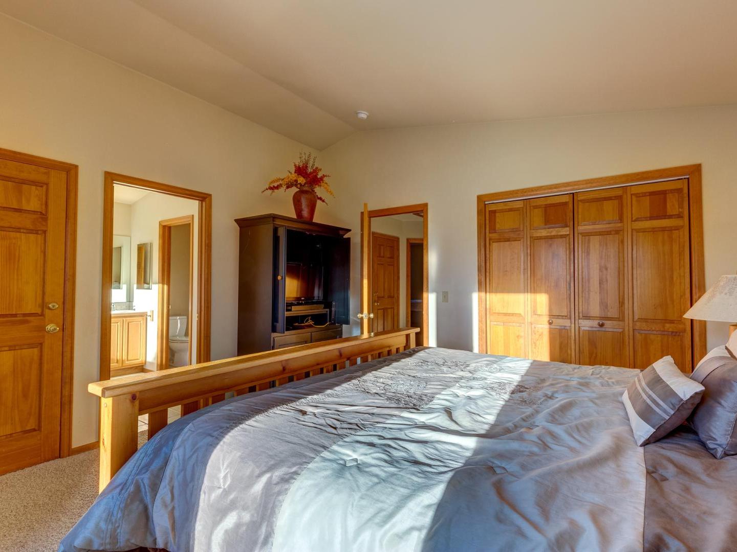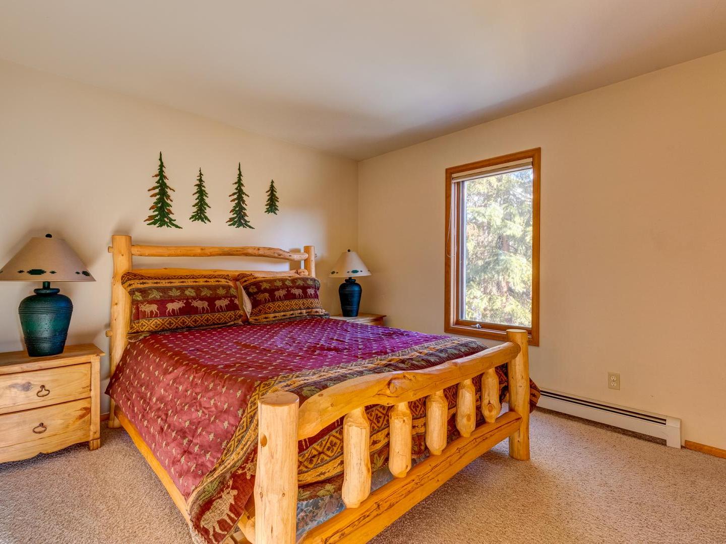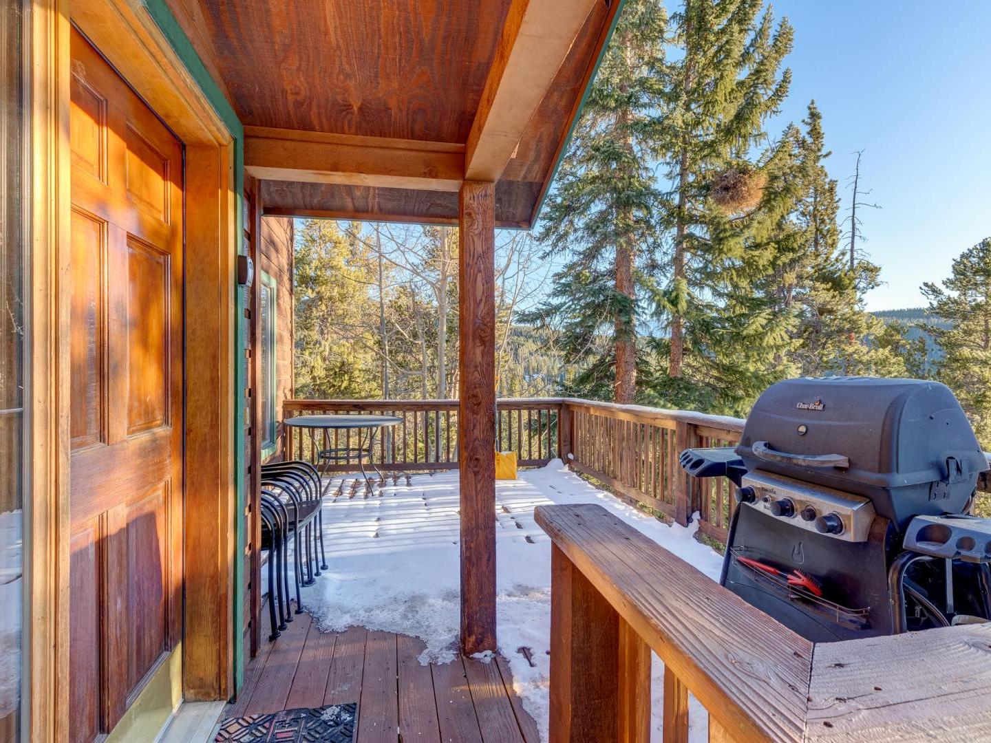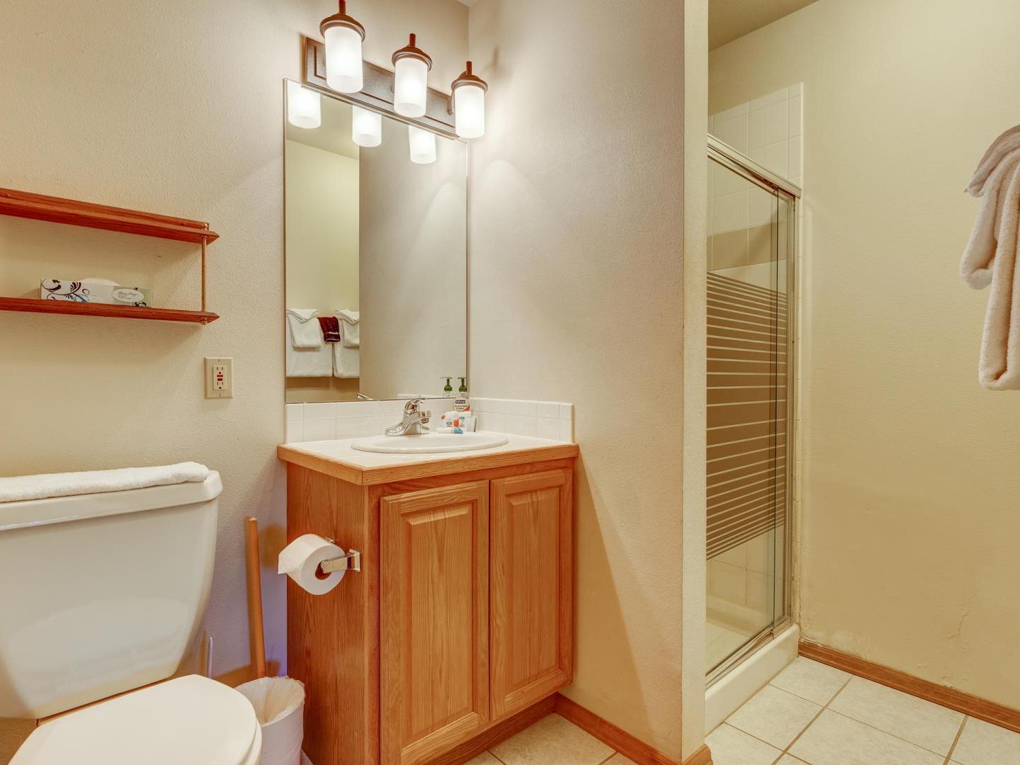 Three bedrooms plus a den offer a good night’s rest for up to nine vacationers. Perched on the top level, the master boasts a comfortable bed, ample closet space and a private luxurious bathroom featuring a jetted tub with an alpine view. Bedroom two offers a sunny view of Baldy Mountain and shares a hallway bathroom with the third guest room. For added lodging, a lower level den boasts multiple bedding options for any extra guests.