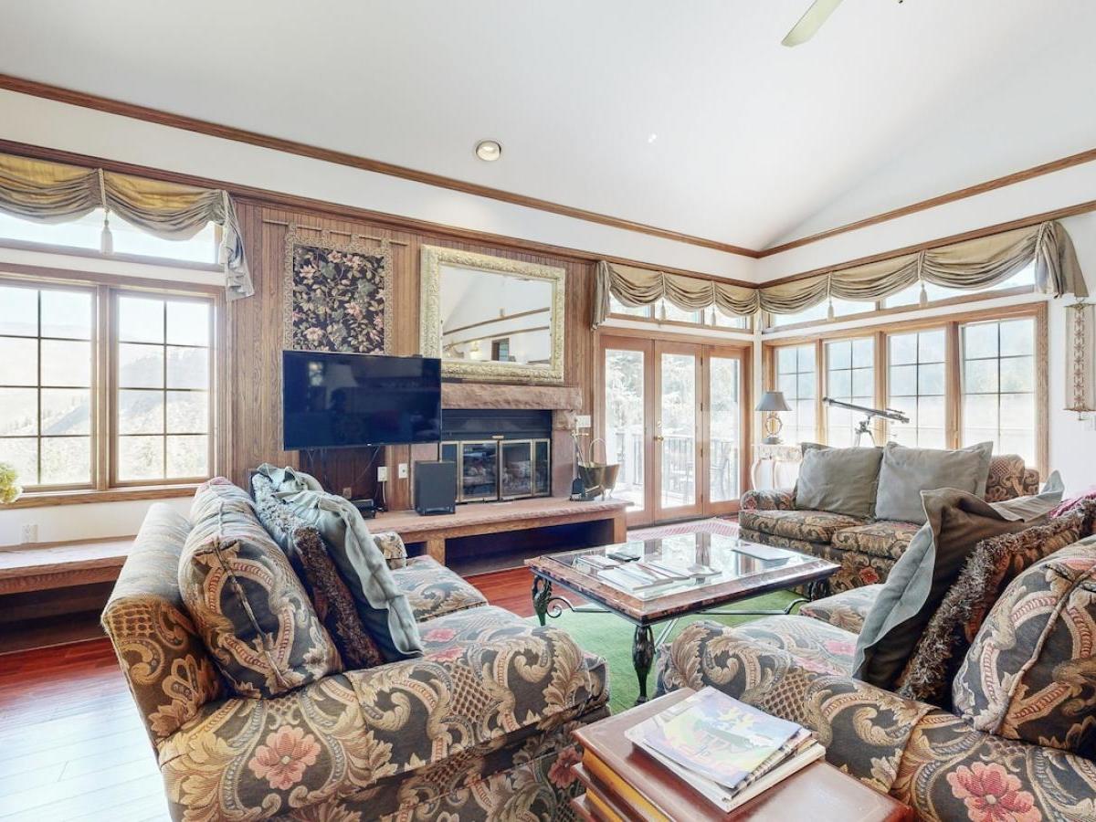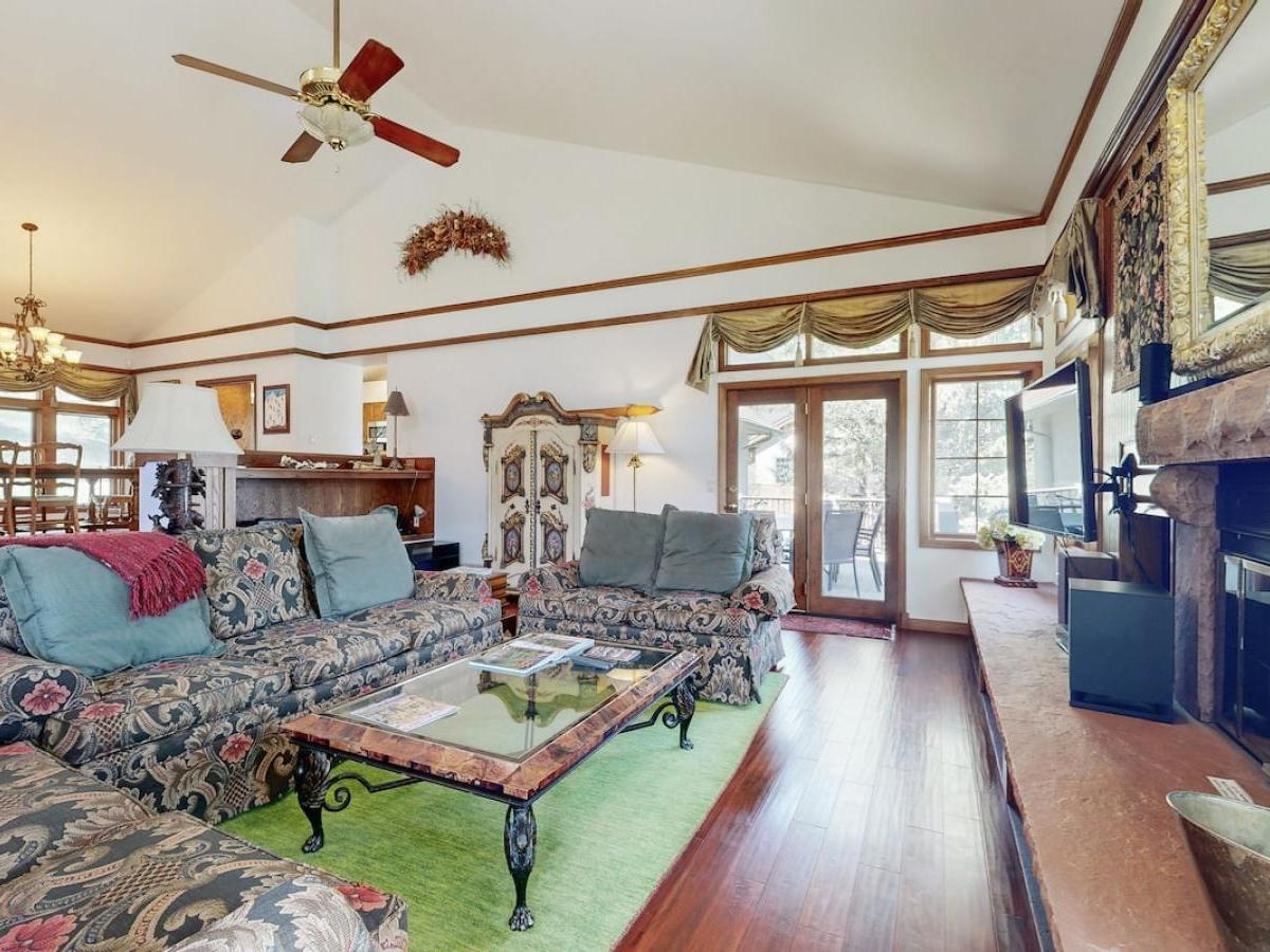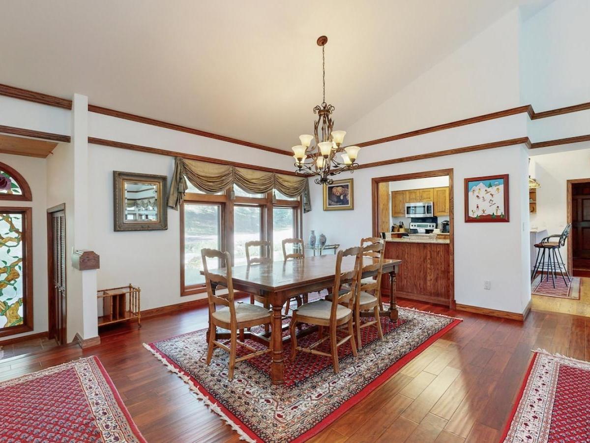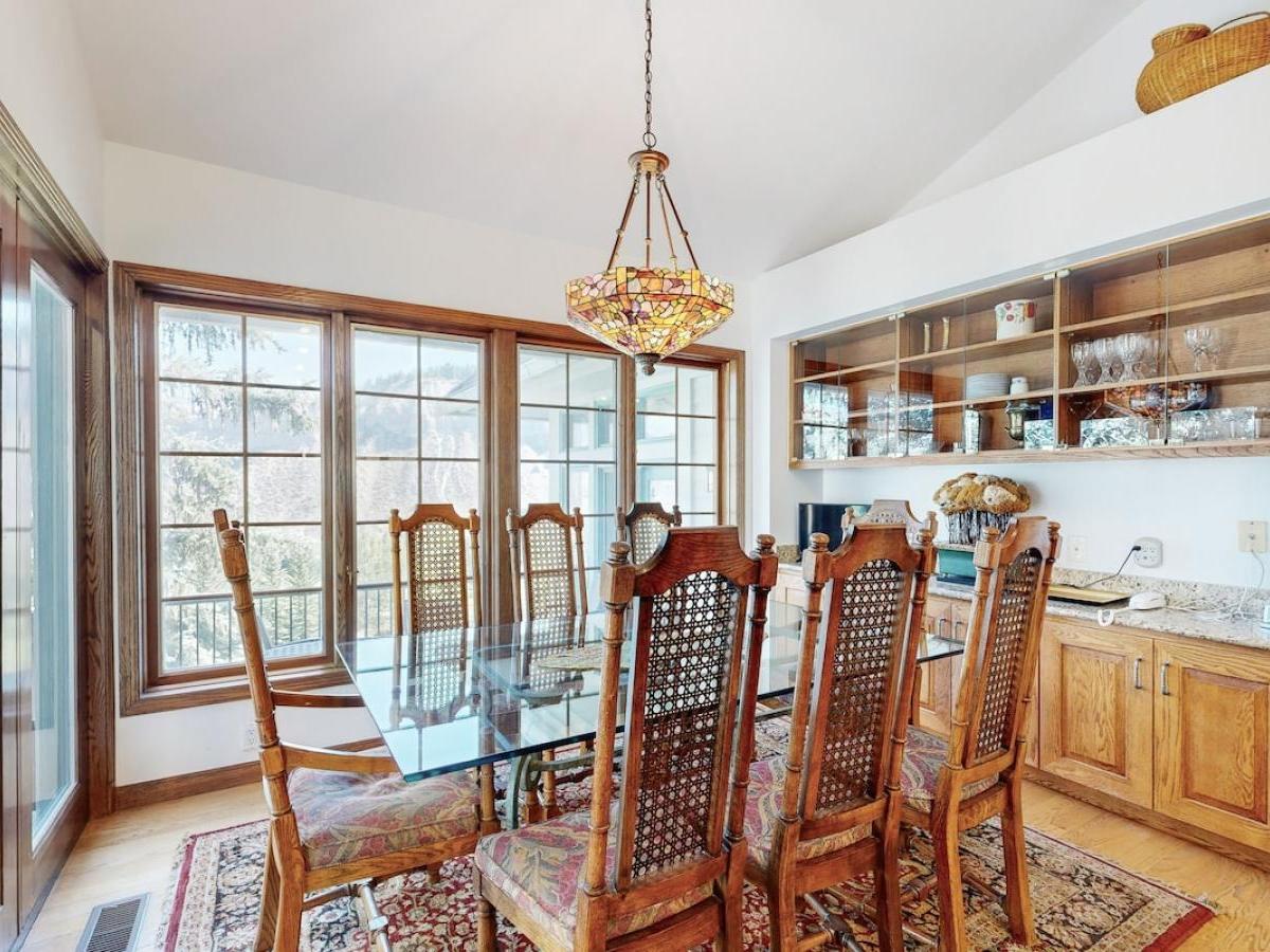 Oversized and bright, the sunken living room offers several seating areas along with a cozy gas fireplace and access to a large deck where the ski slope views are simply inspiring. Guests will love the open kitchen, fully equipped with everything needed to create memorable home cooked meals. Just off of the kitchen is a sun-soaked breakfast nook seating six. A more formal dining area that seats eight sits above the living room and off of the kitchen.