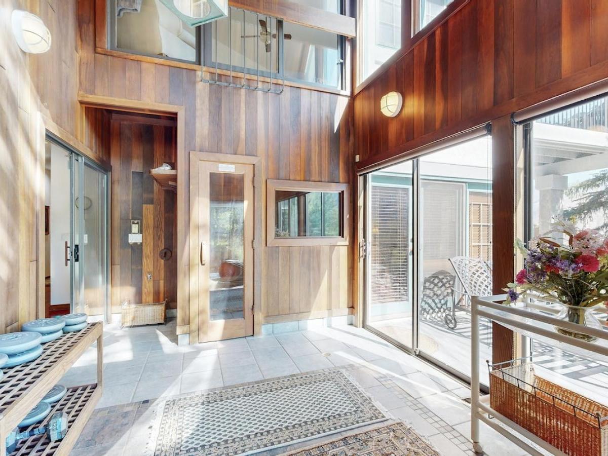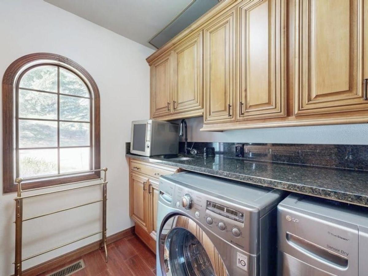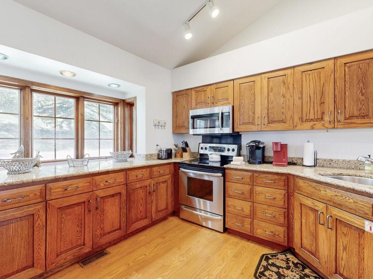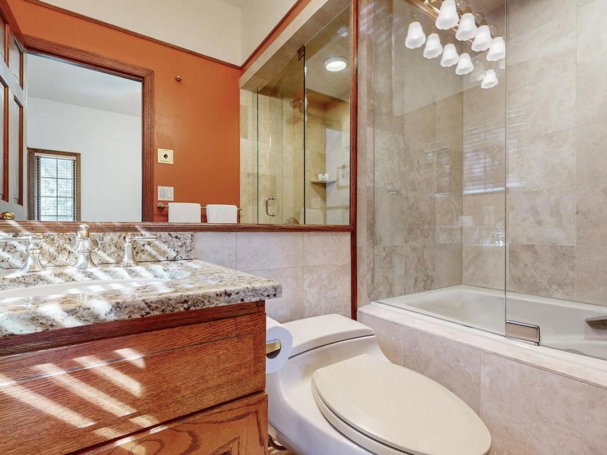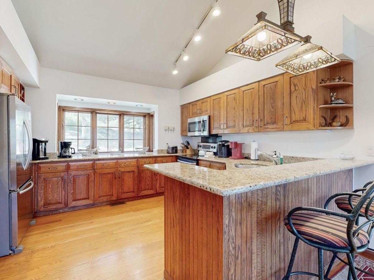 Oversized and bright, the sunken living room offers several seating areas along with a cozy gas fireplace and access to a large deck where the ski slope views are simply inspiring. Guests will love the open kitchen, fully equipped with everything needed to create memorable home cooked meals. Just off of the kitchen is a sun-soaked breakfast nook seating six. A more formal dining area that seats eight sits above the living room and off of the kitchen.