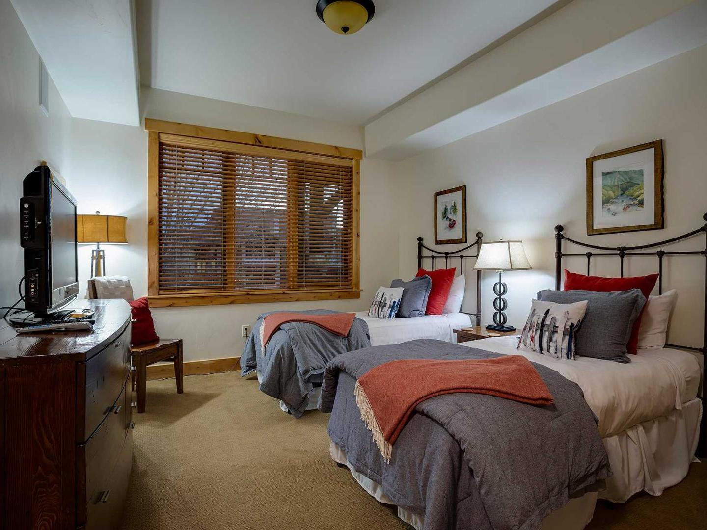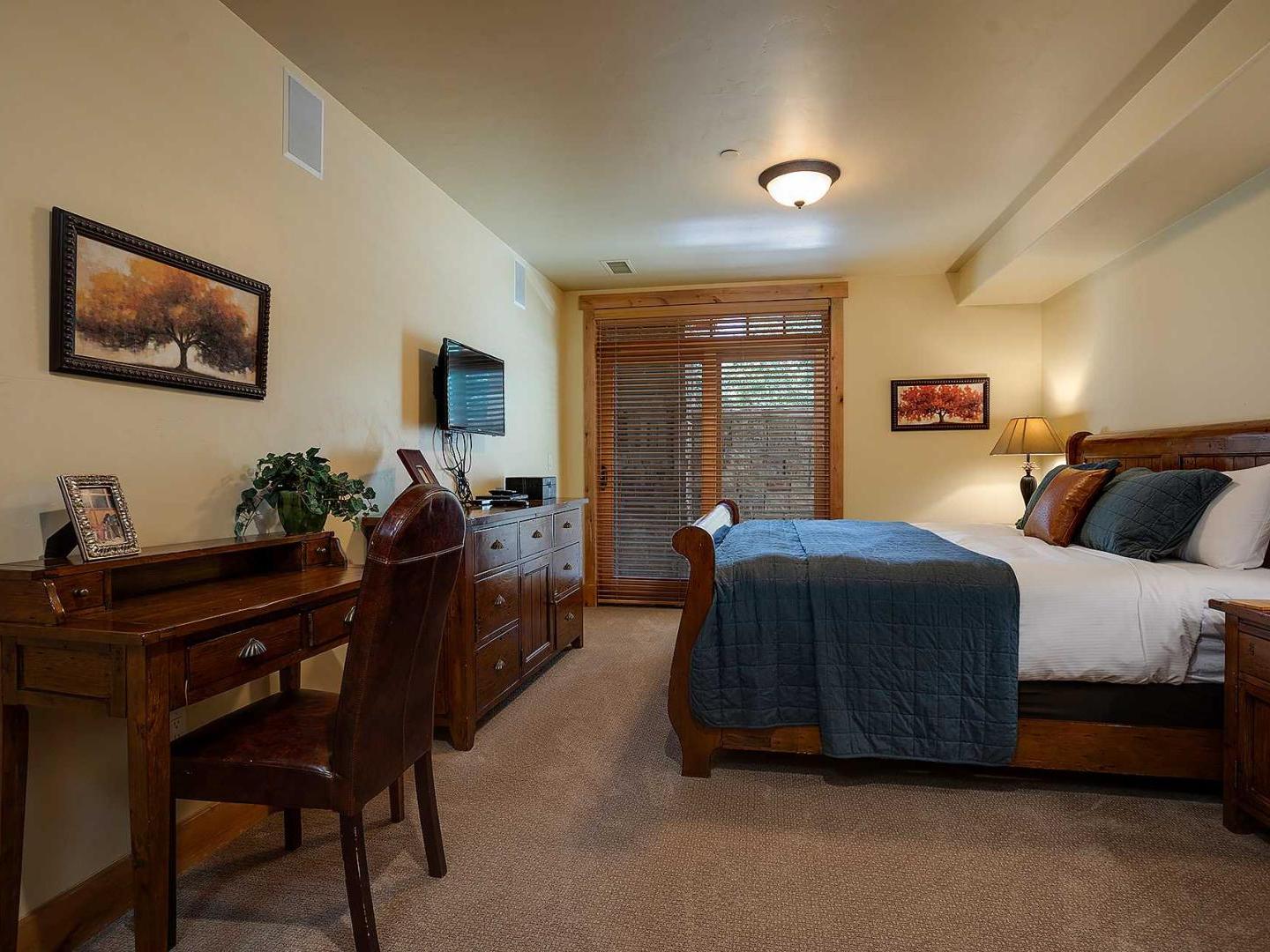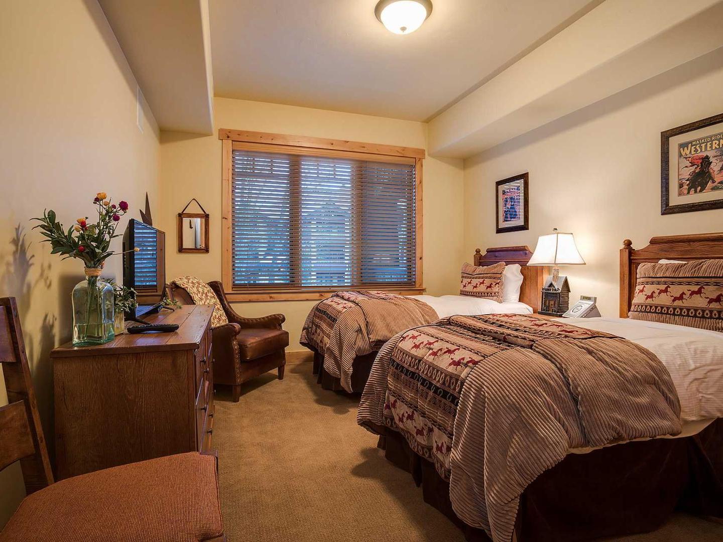 Large bedrooms in the Bear Lodge units are furnished with high quality bedding and linens. Guests staying at the Bear Lodge will appreciate the property's exclusive vacation amenities. Kids and adults alike will love relaxing in the indoor/outdoor swimming pool and multiple hot tubs at the end of a day on the Steamboat slopes. Those seeking a rounded work-out can finish off the day of activities in the fitness center with sauna and a day off the slopes can be enjoyed in the property's full service Spa. Summer guest will enjoy the tennis courts and everyone has access to the other amenities offered at the Trappeurs Crossing Resort.