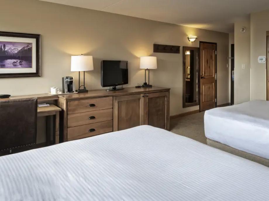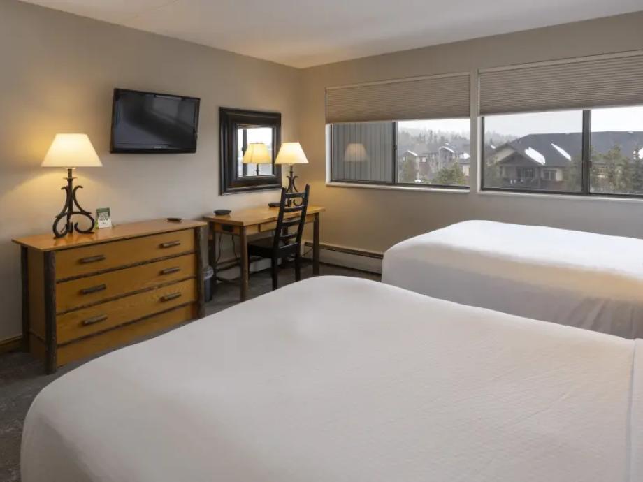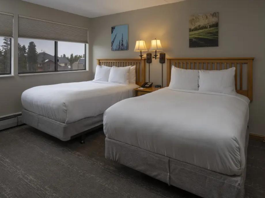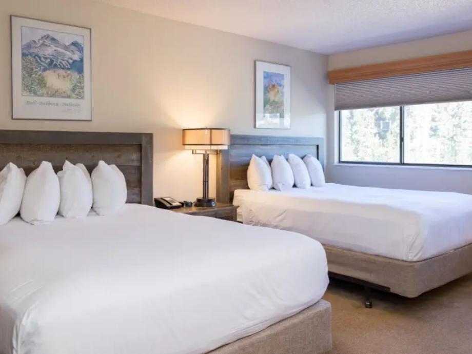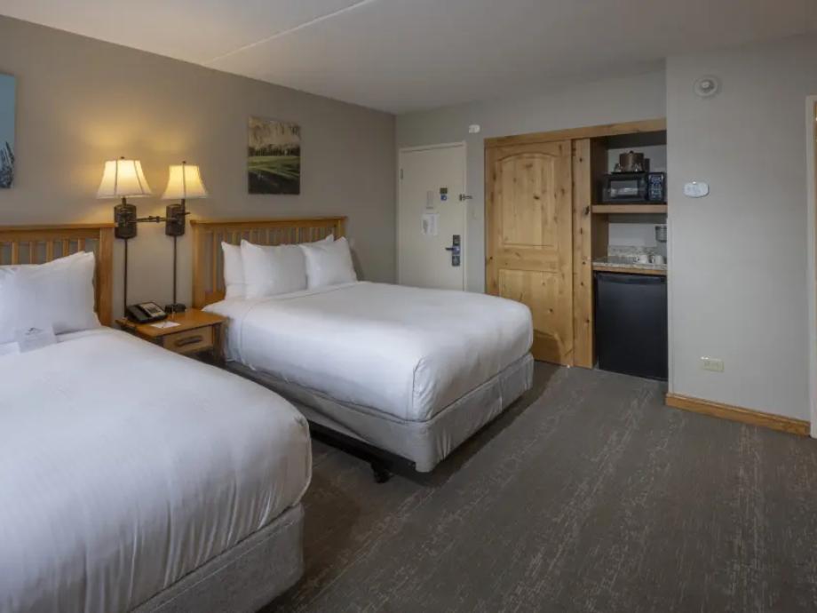 Hotel Room-Featuring two queen beds and 380 square feet of living space, each standard room also offers a separate sitting area along with a coffee maker, mini-fridge and a microwave. Private full bathrooms offer plush towels and a blow dryer. Located in Buildings 1-3, hotel rooms are in close proximity to the heated pools, hot tubs, games room and spa.