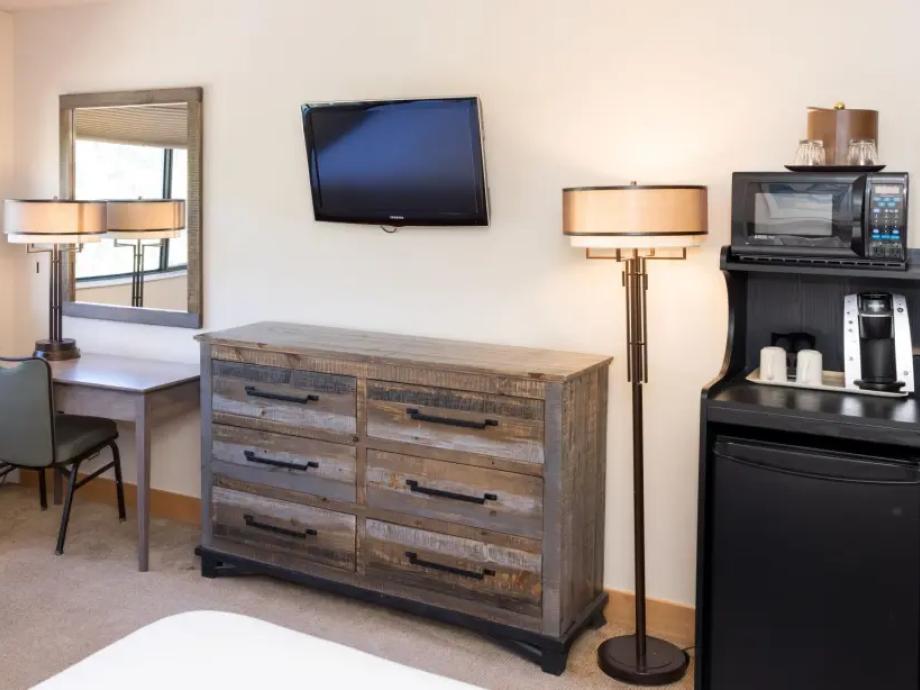 Colorado Suite-Situated in Building 4 with excellent slopes access, this 617 square foot suite offers a spacious living room with a cozy wood-burning fireplace and a private balcony. An efficiency kitchen allows for a quick breakfast or mid-day snack. Bedding includes one queen bed with a queen sleeper sofa.