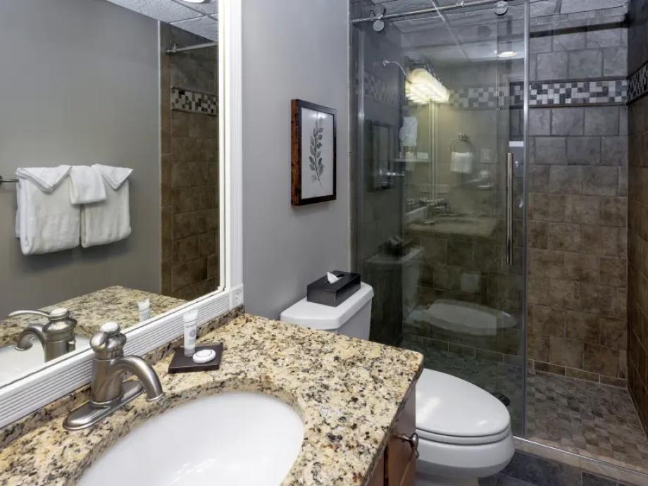 One Bedroom Suite-Found in Buildings 1-3, each one bedroom suite boasts 717 square feet of living space including a full sized kitchen and a spacious living room with a cozy wood-burning fireplace. A private balcony offers views of the surrounding area which sits close to the heated pools, hot tubs, games room and spa. Bedding includes one queen bed and a queen sleeper sofa.