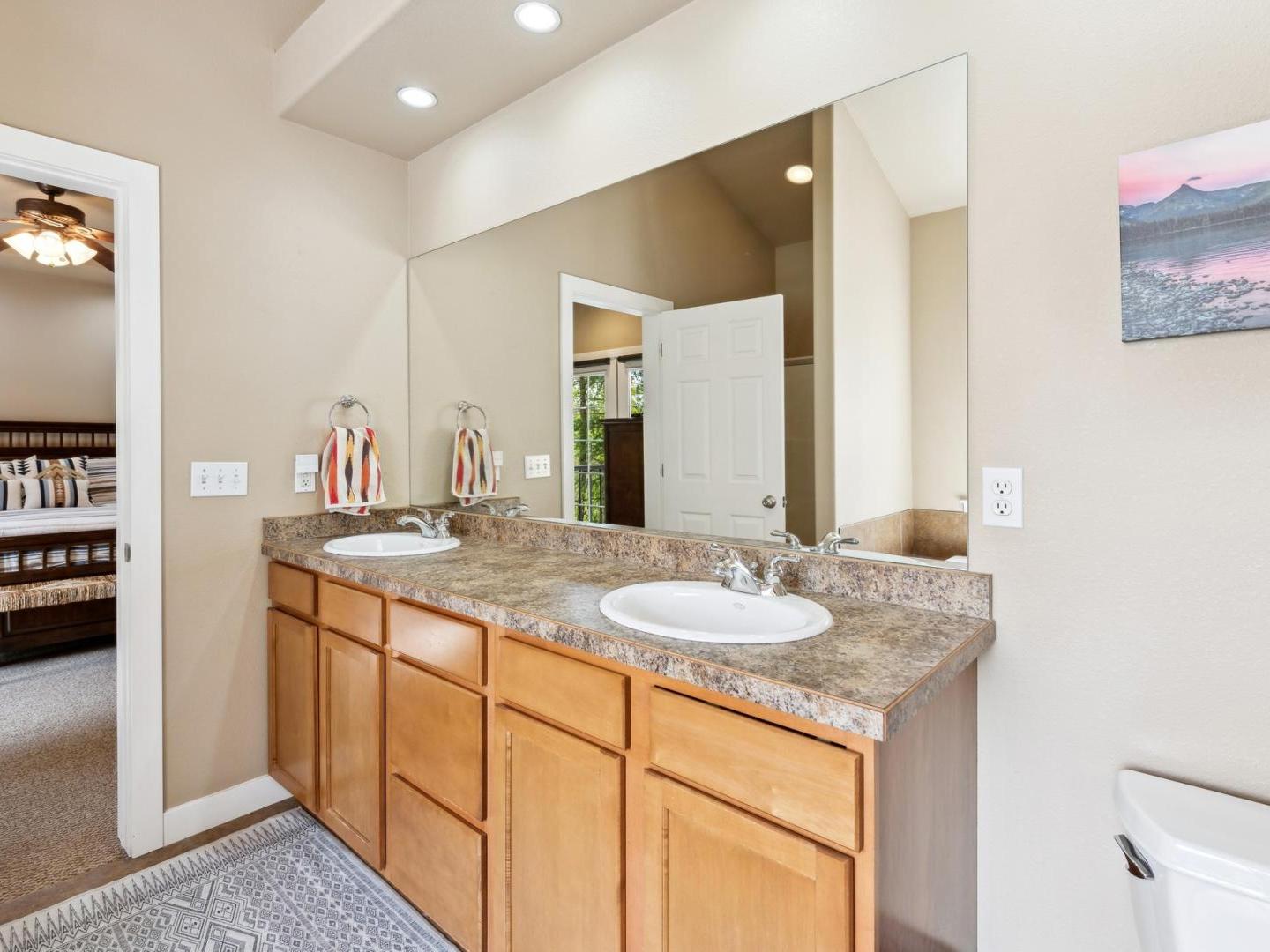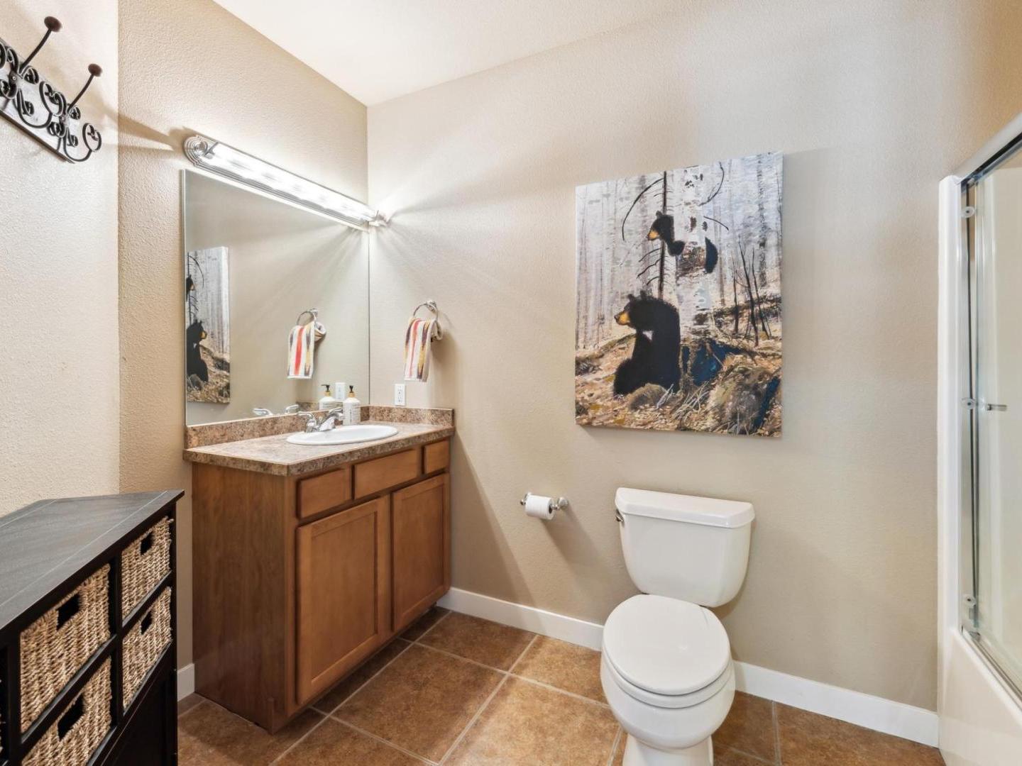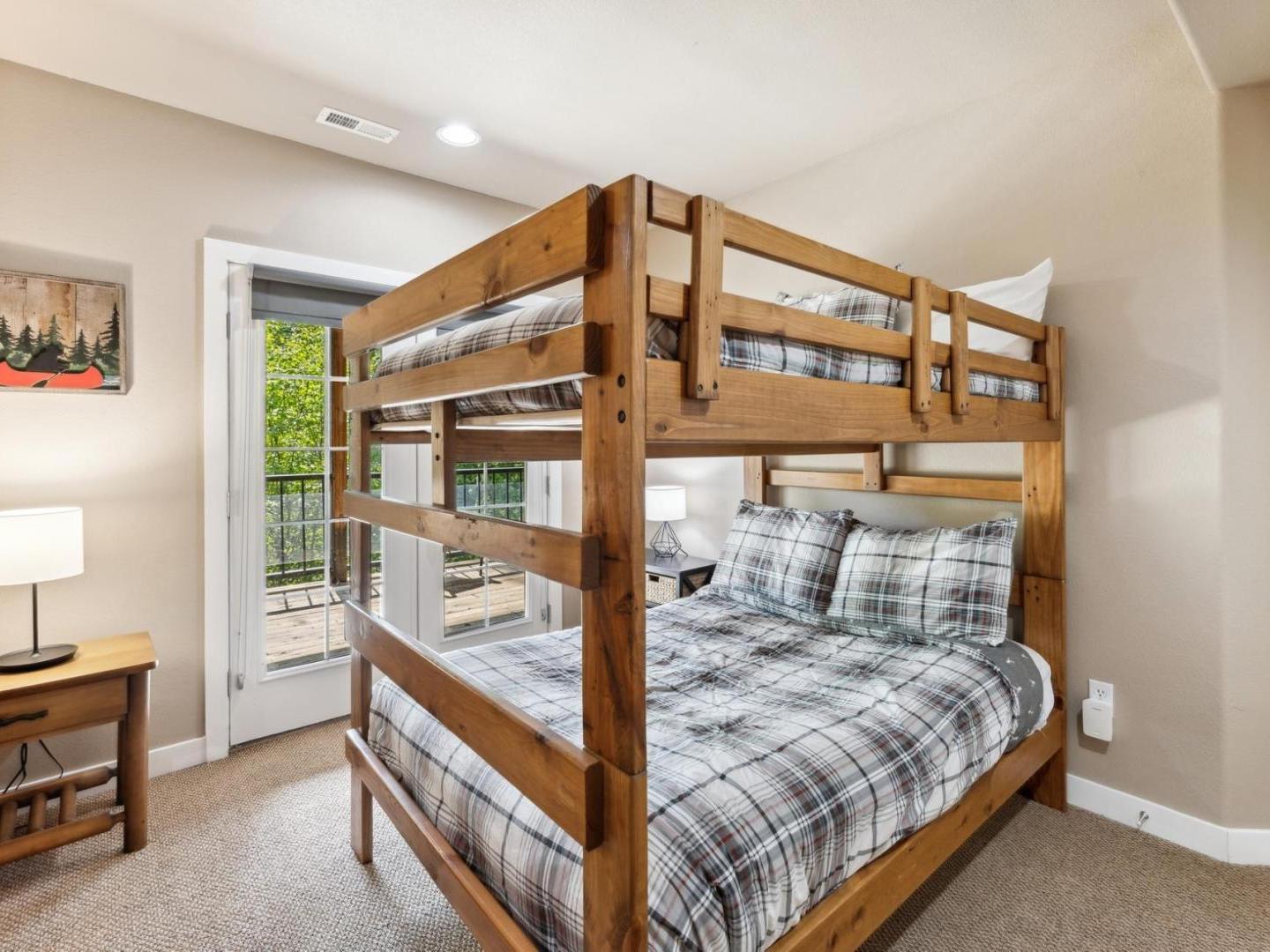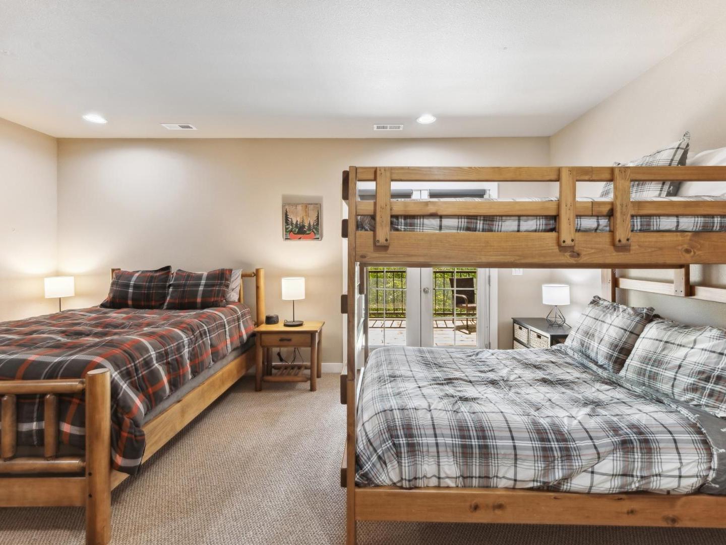 Furnished with a King bed, the main level primary bedroom includes access to the deck and a private bathroom with a dual-sink vanity, soaking tub and walk-in shower. One of the lower level bedrooms is appointed with a King bed and private bathroom with a combination shower/tub. Also on the lower level, the bunk room is outfitted with a Queen bed plus a Full over Full bunk bed and accesses a bathroom in the hallway.