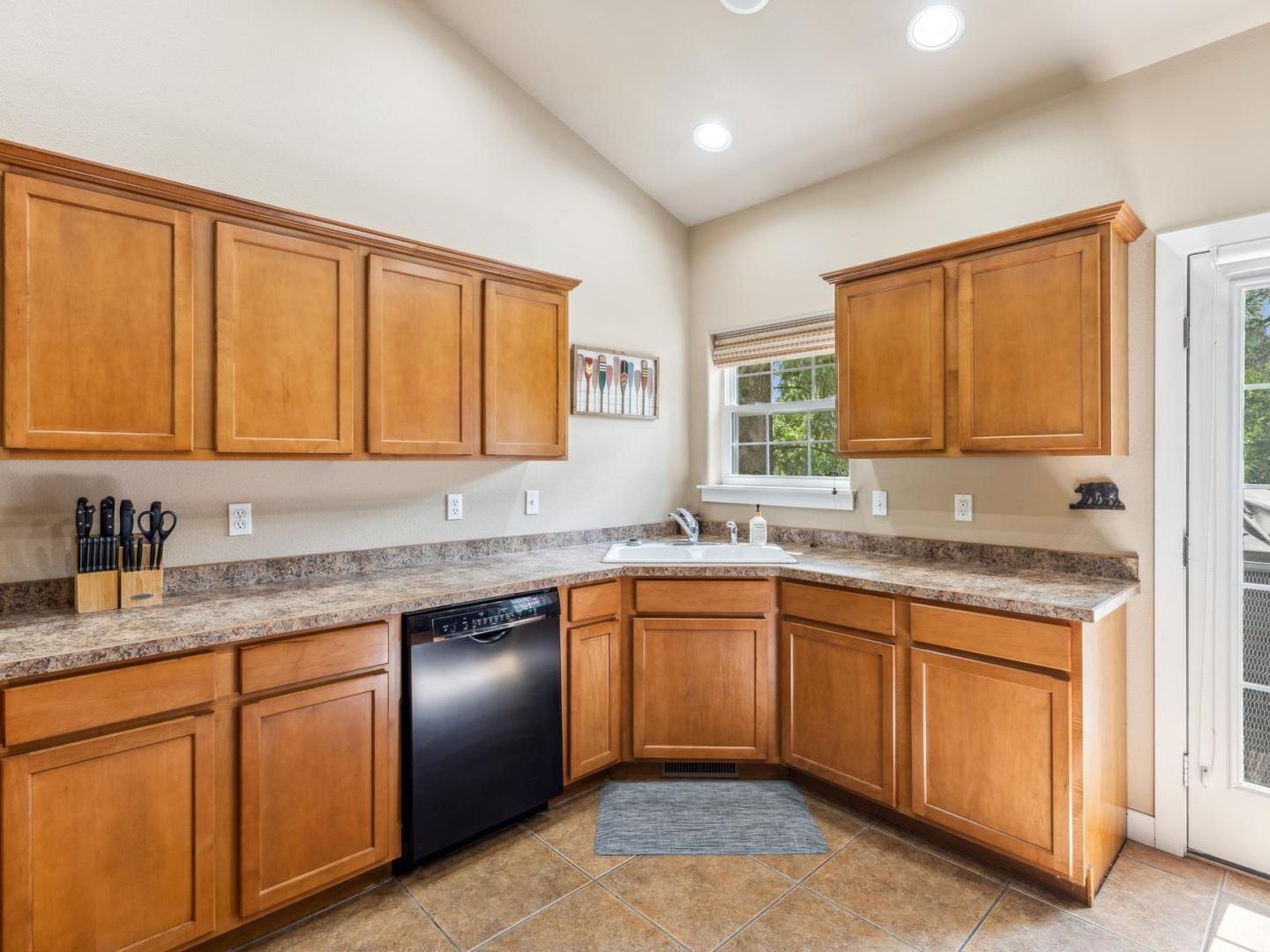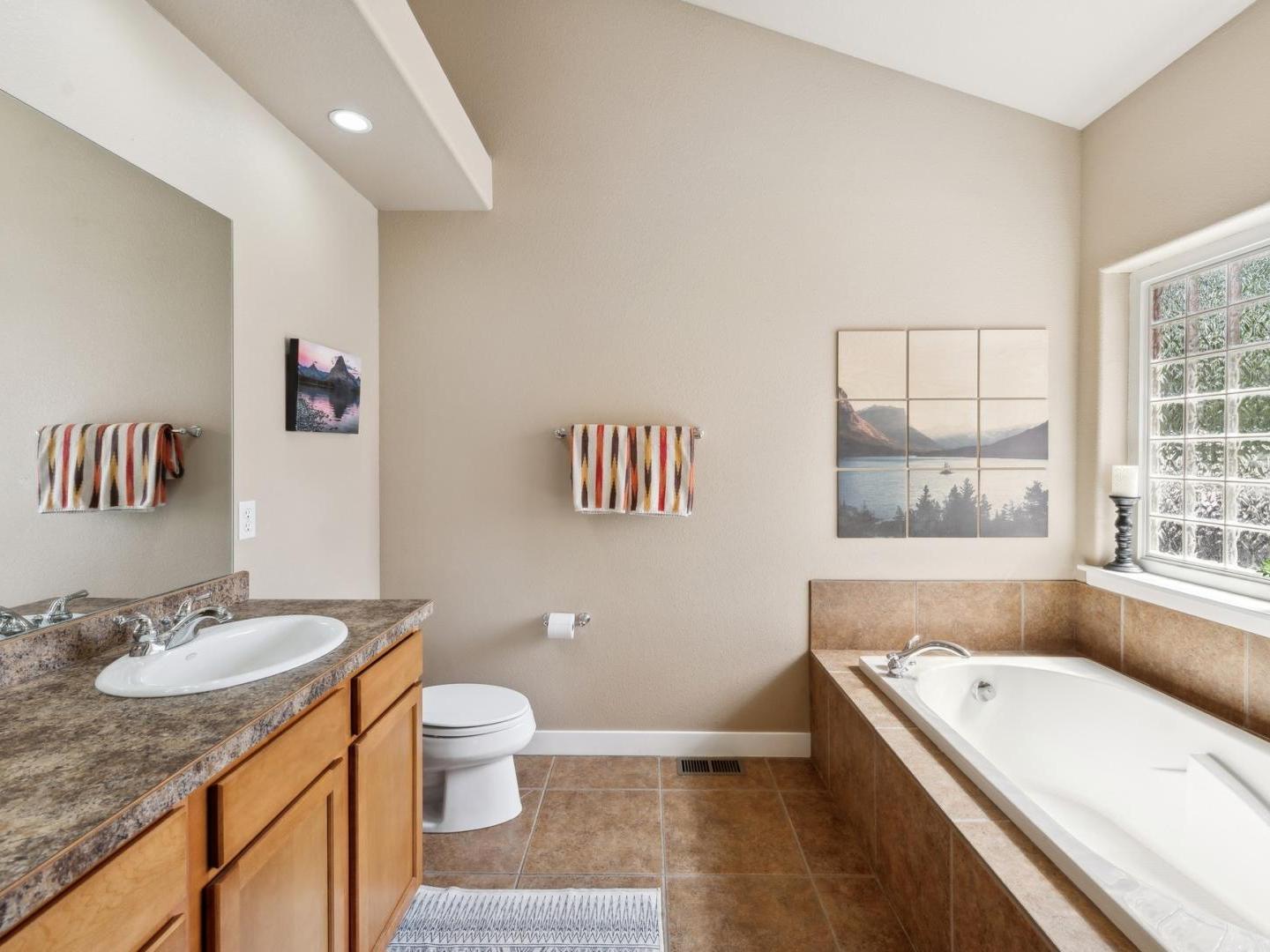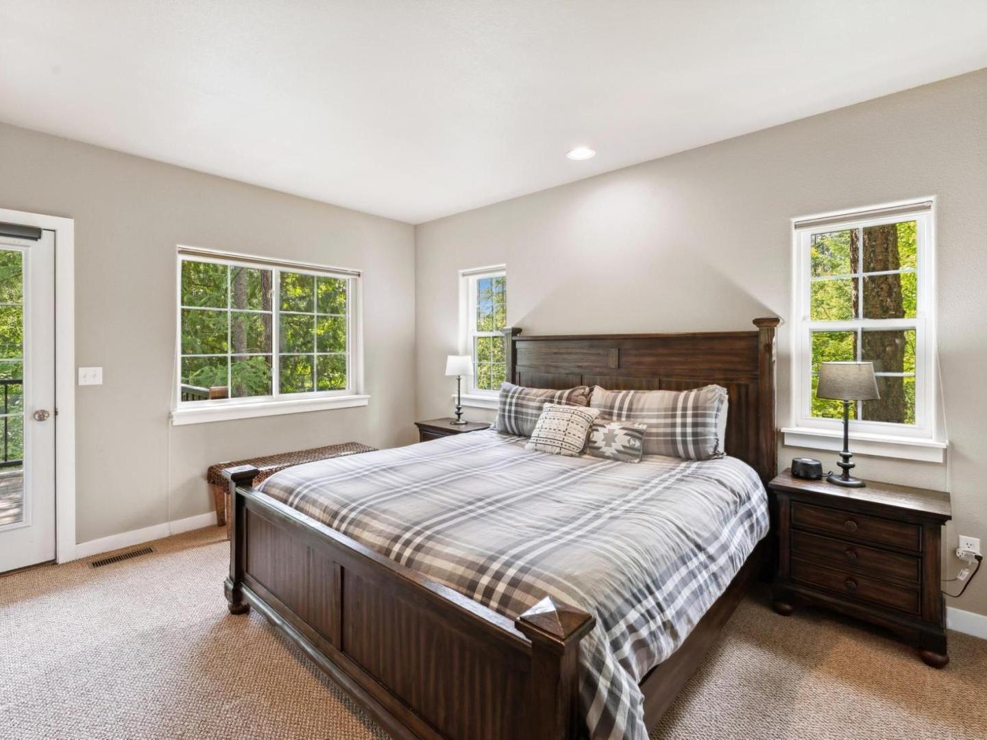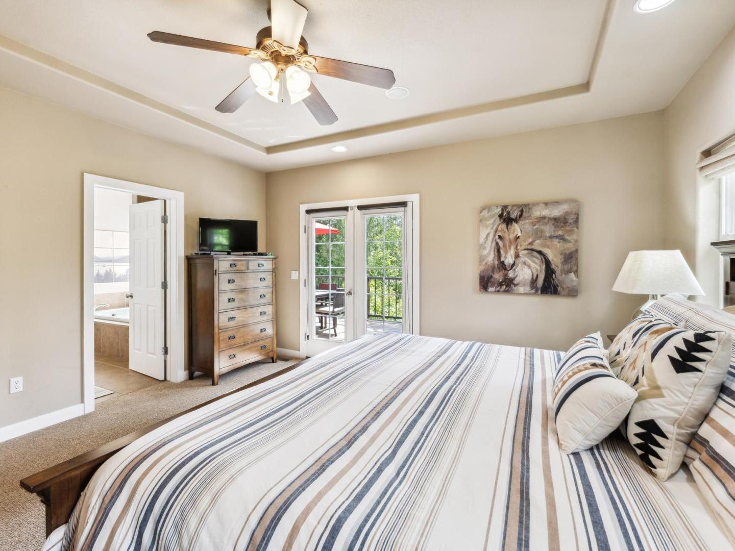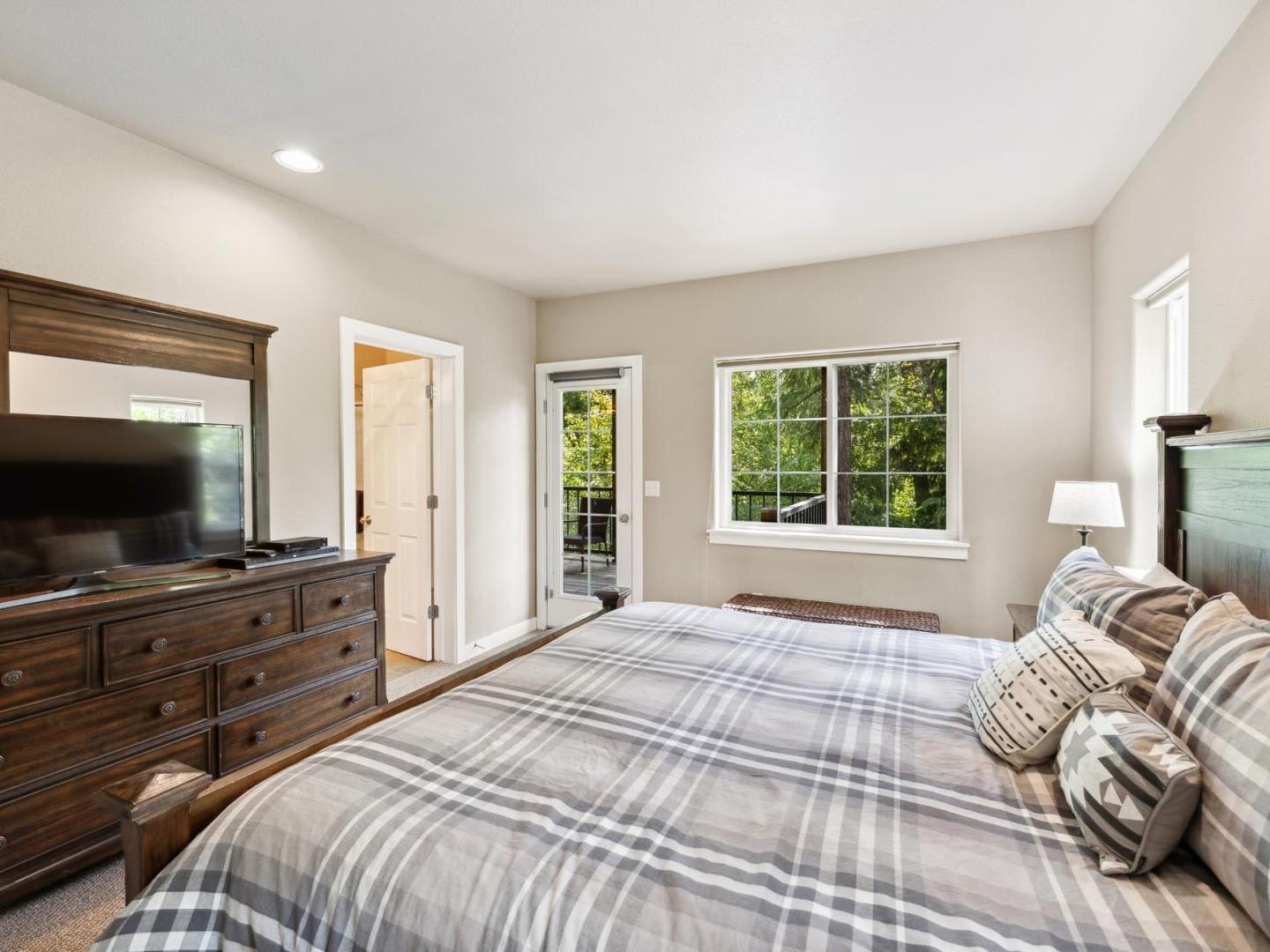 Furnished with a King bed, the main level primary bedroom includes access to the deck and a private bathroom with a dual-sink vanity, soaking tub and walk-in shower. One of the lower level bedrooms is appointed with a King bed and private bathroom with a combination shower/tub. Also on the lower level, the bunk room is outfitted with a Queen bed plus a Full over Full bunk bed and accesses a bathroom in the hallway.