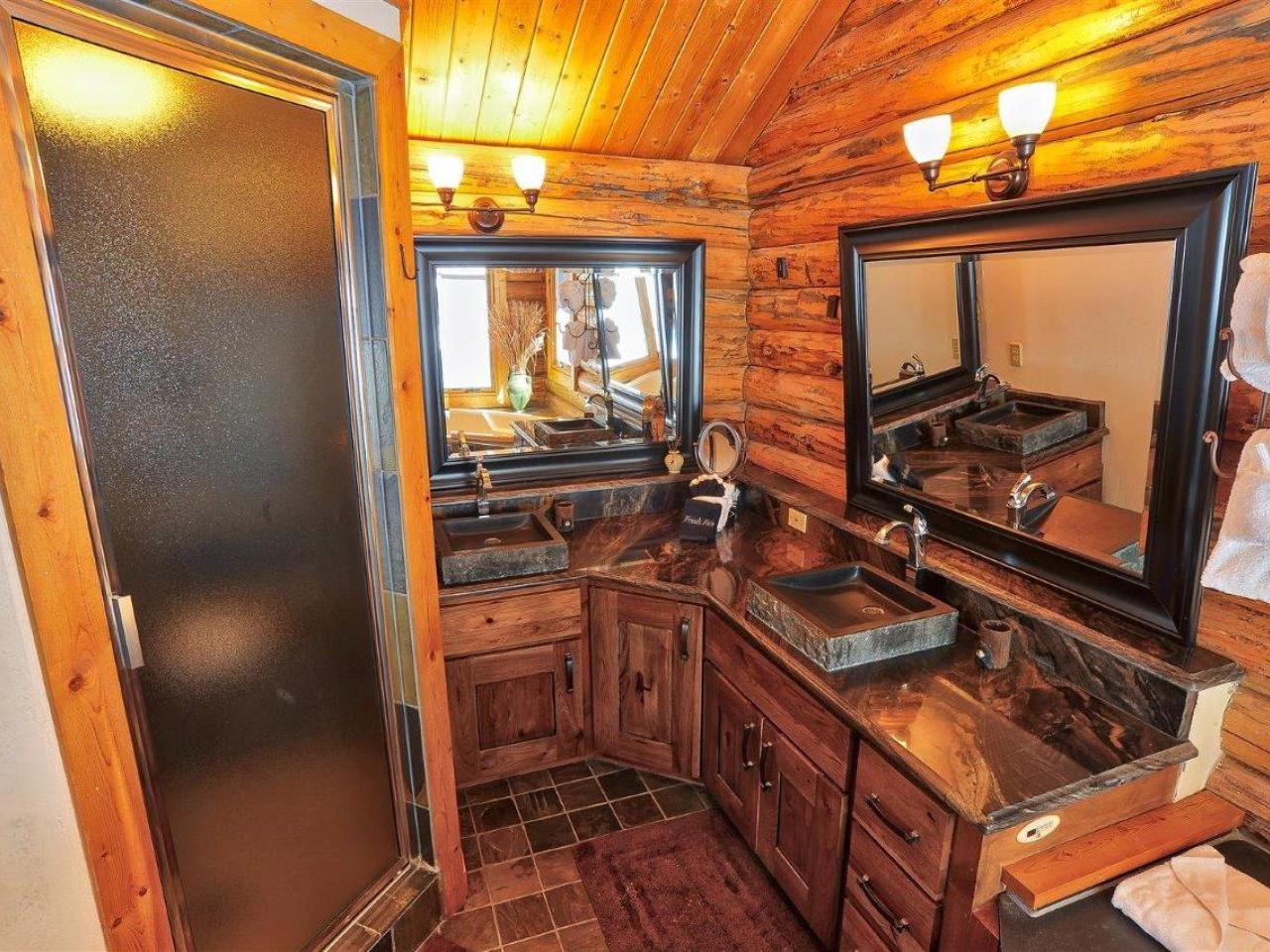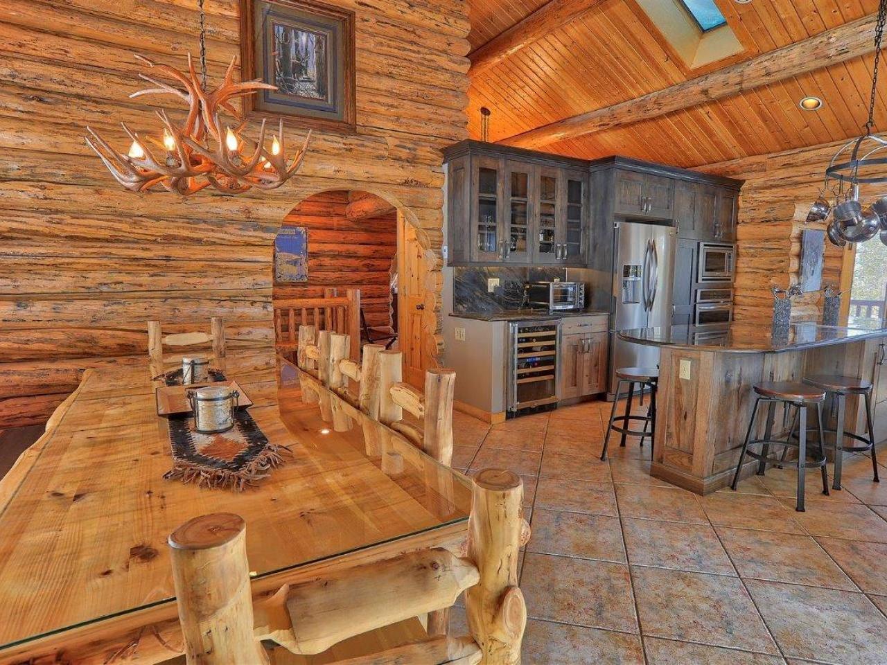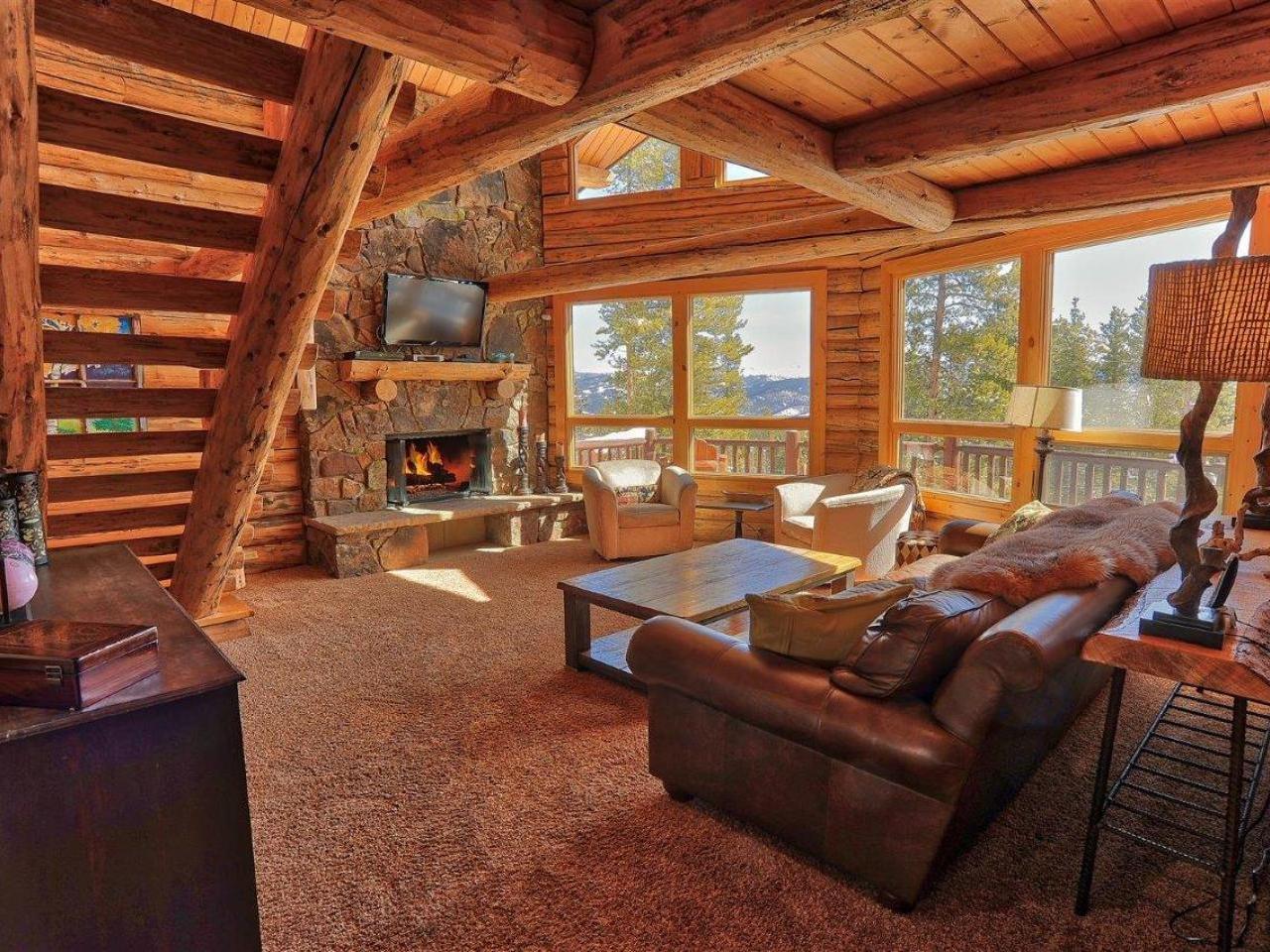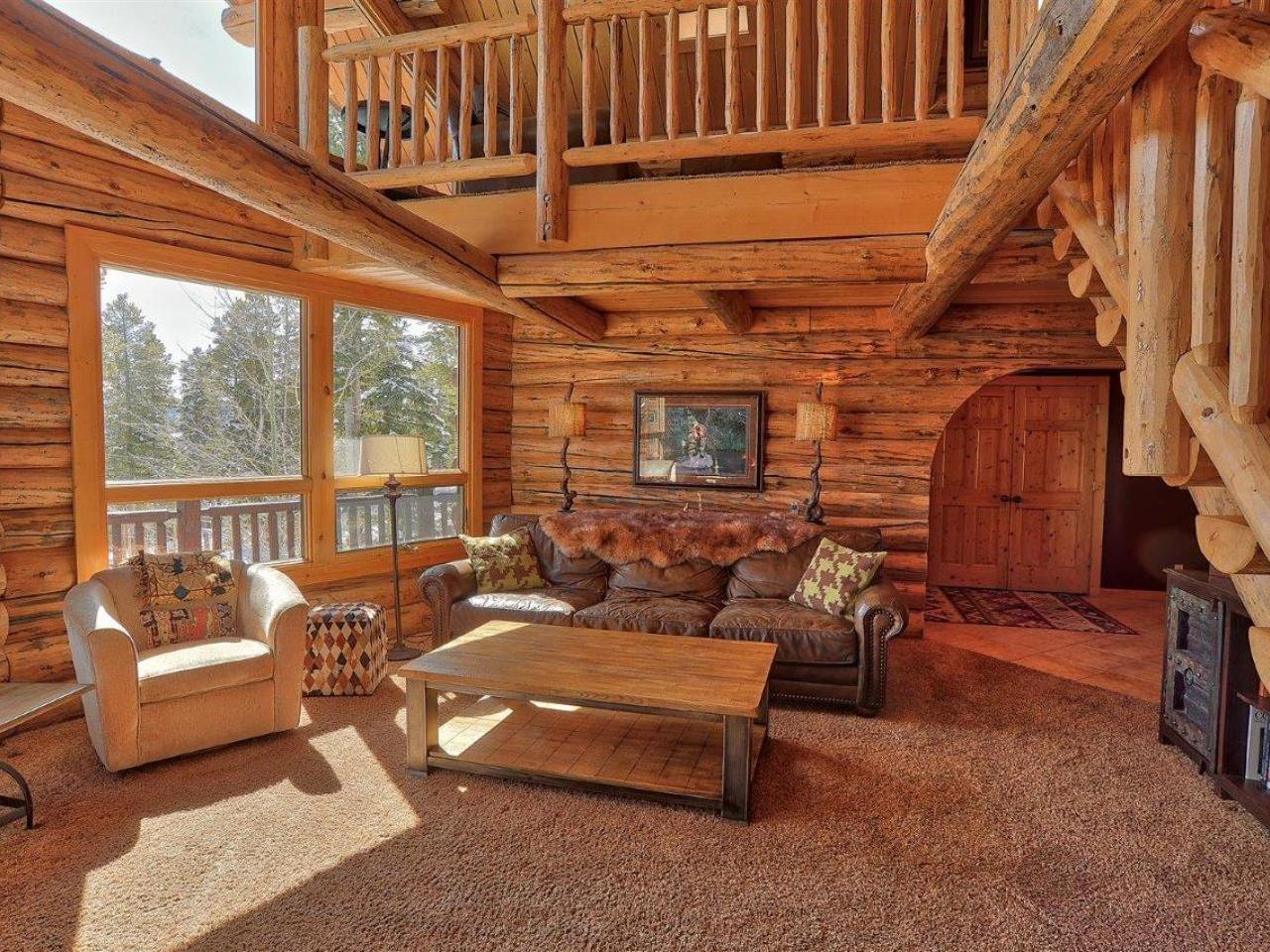 Centered on a fireplace and television, with walls of windows exposing majestic mountain views, the main level living room in this 3 bedroom, 3 bathroom log home is an open space with comfortable furnishings and two-story vaulted ceilings. Open to the living room, the dining area accommodates 8 guests around the large table with another 5 stools at the breakfast bar. Polished stone countertops and high-end stainless steel appliances are featured in the fully equipped kitchen which offers a breakfast nook seating 4 guests. Step out to the wrap-around deck through glass doors to grill up a meal or relax in the private hot tub nestled along the National Forest.