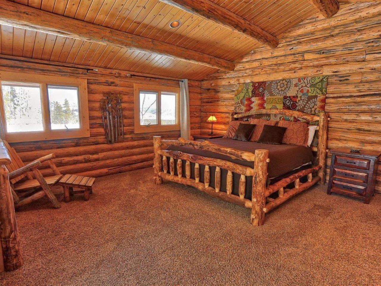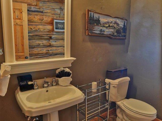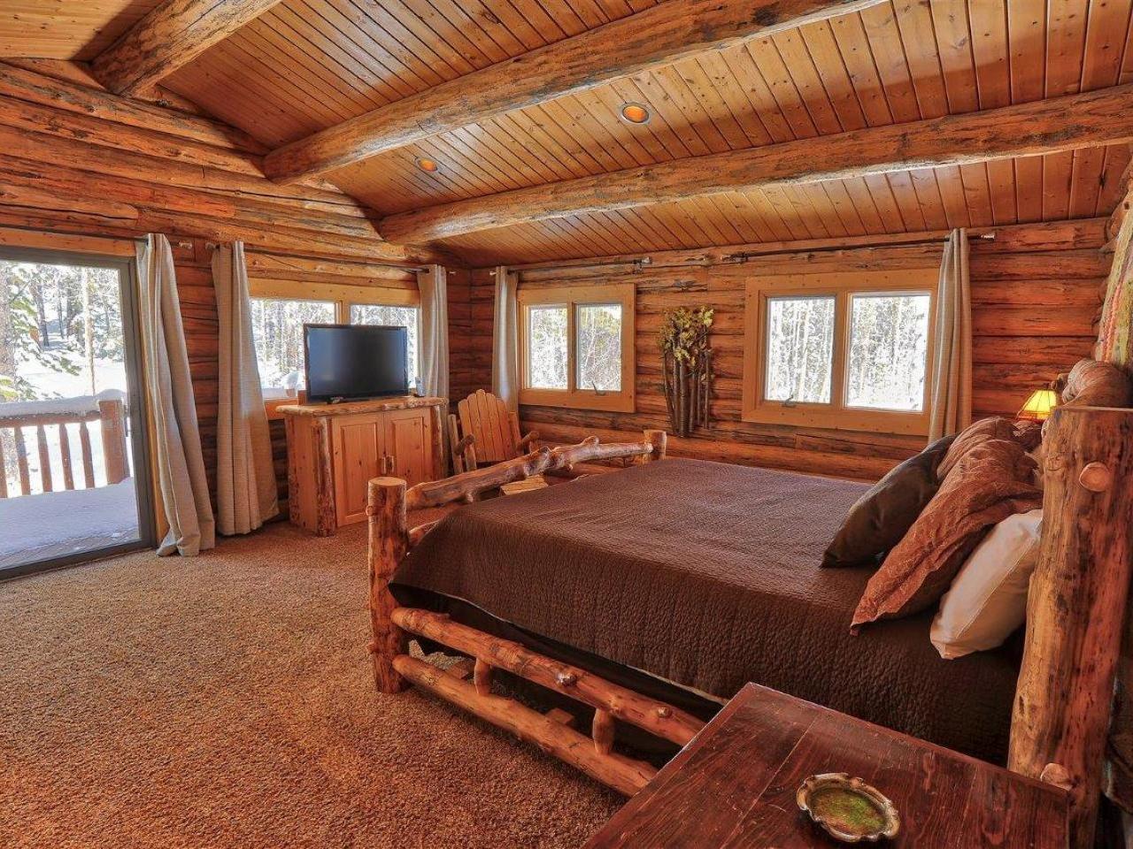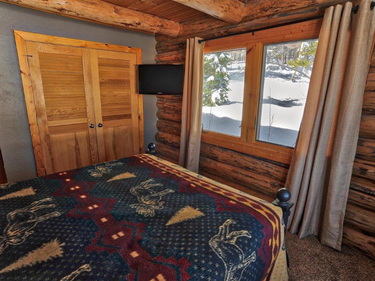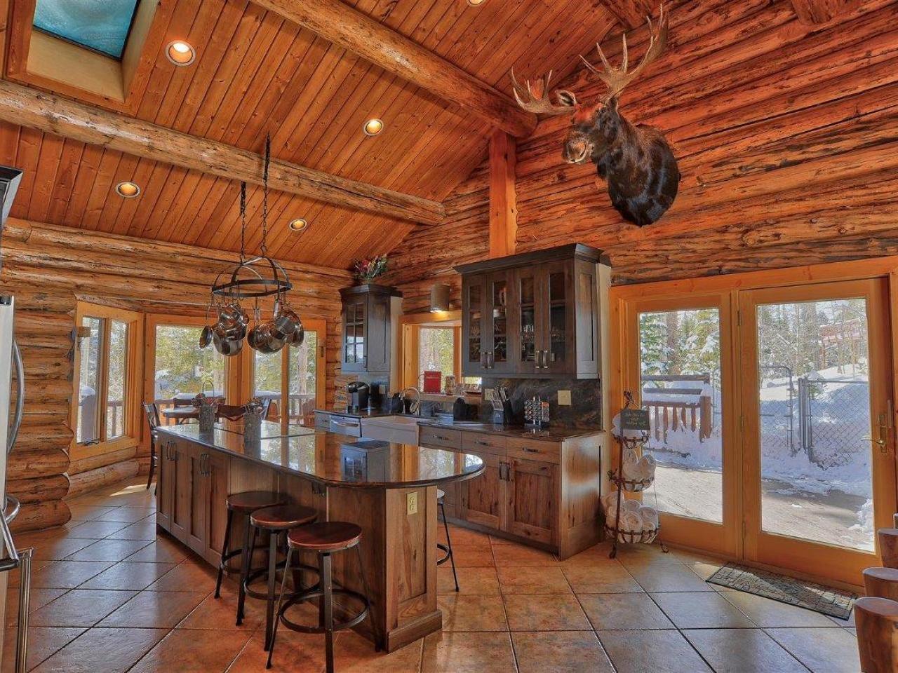 Centered on a fireplace and television, with walls of windows exposing majestic mountain views, the main level living room in this 3 bedroom, 3 bathroom log home is an open space with comfortable furnishings and two-story vaulted ceilings. Open to the living room, the dining area accommodates 8 guests around the large table with another 5 stools at the breakfast bar. Polished stone countertops and high-end stainless steel appliances are featured in the fully equipped kitchen which offers a breakfast nook seating 4 guests. Step out to the wrap-around deck through glass doors to grill up a meal or relax in the private hot tub nestled along the National Forest.