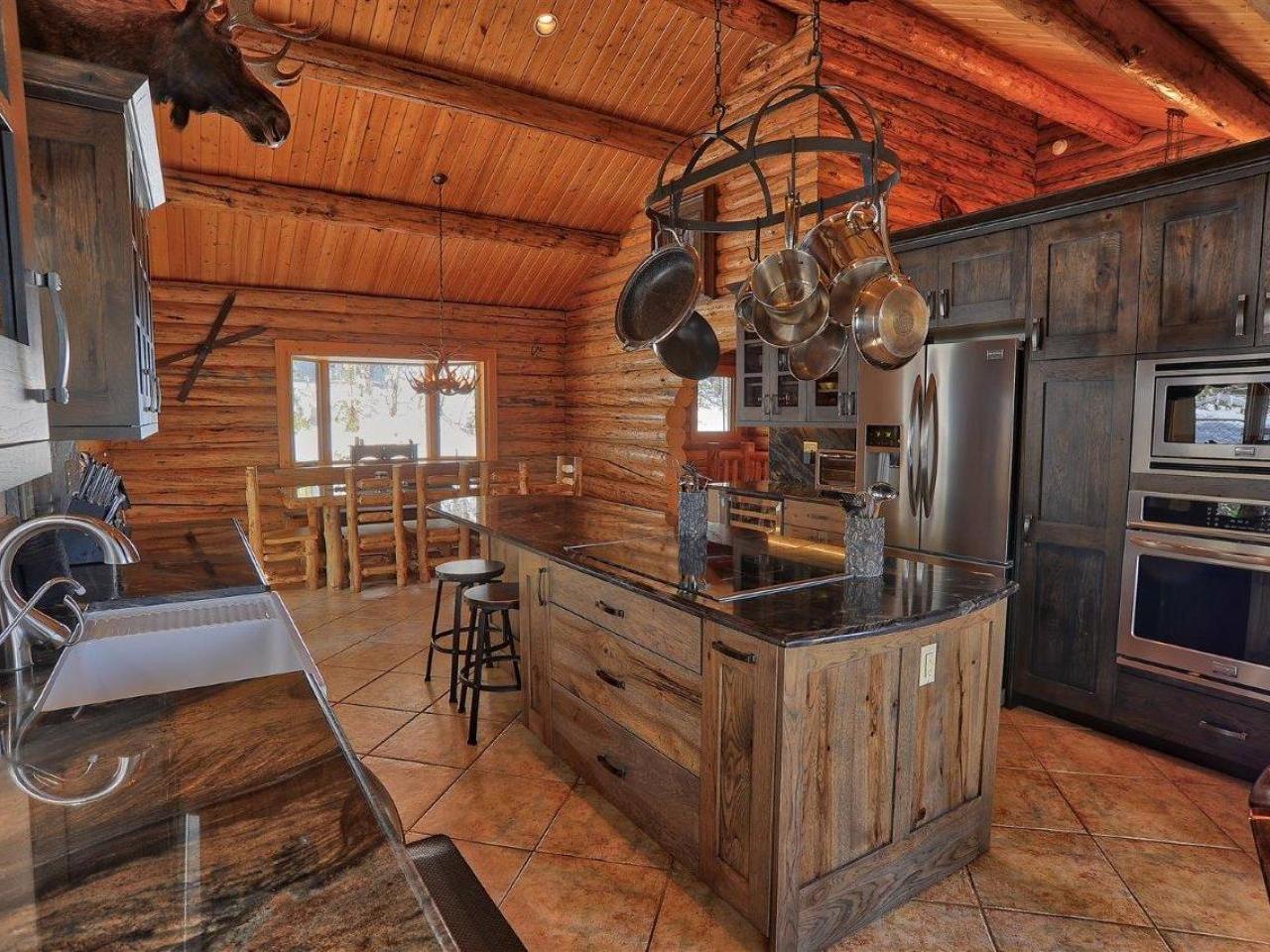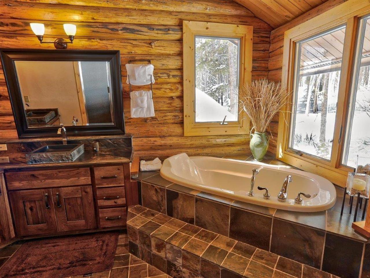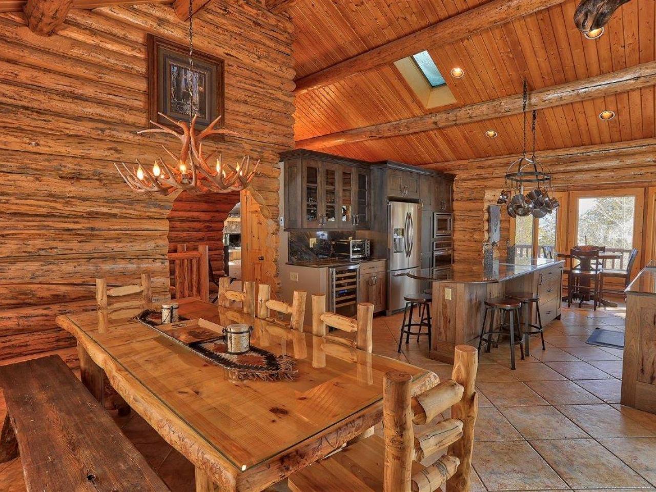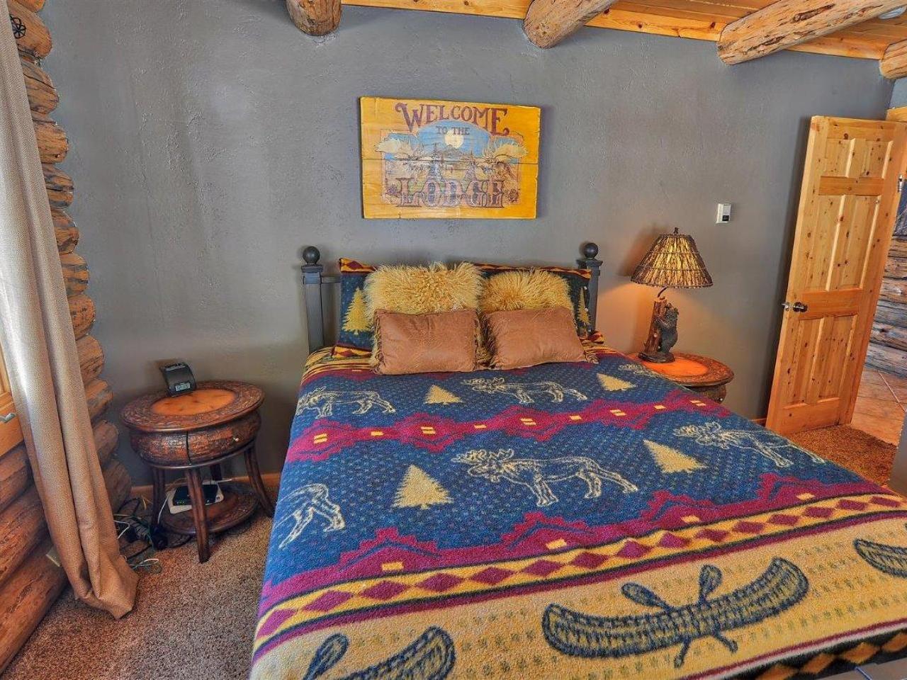 Centered on a fireplace and television, with walls of windows exposing majestic mountain views, the main level living room in this 3 bedroom, 3 bathroom log home is an open space with comfortable furnishings and two-story vaulted ceilings. Open to the living room, the dining area accommodates 8 guests around the large table with another 5 stools at the breakfast bar. Polished stone countertops and high-end stainless steel appliances are featured in the fully equipped kitchen which offers a breakfast nook seating 4 guests. Step out to the wrap-around deck through glass doors to grill up a meal or relax in the private hot tub nestled along the National Forest.