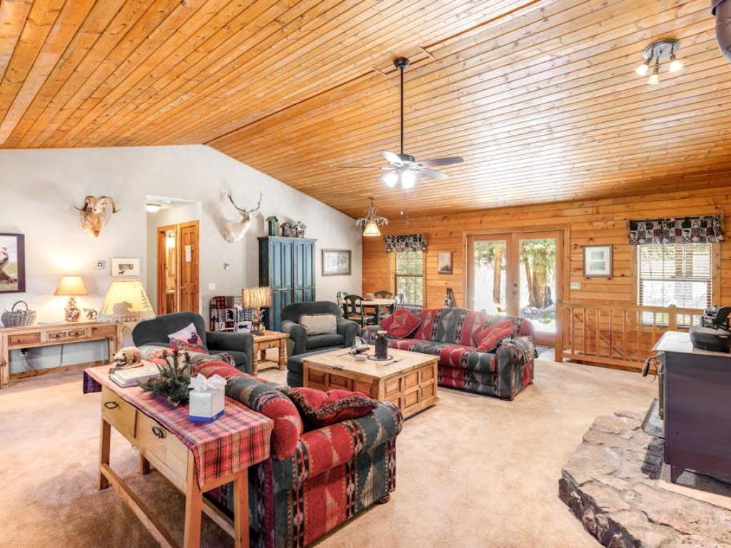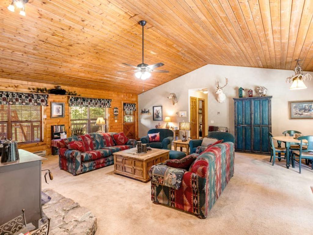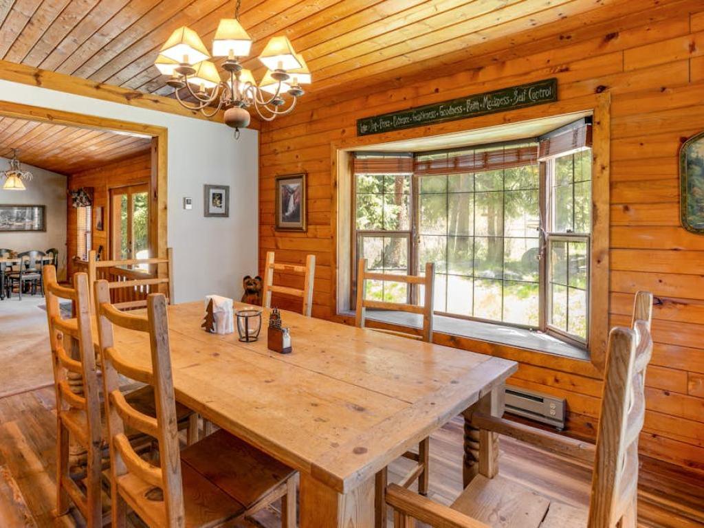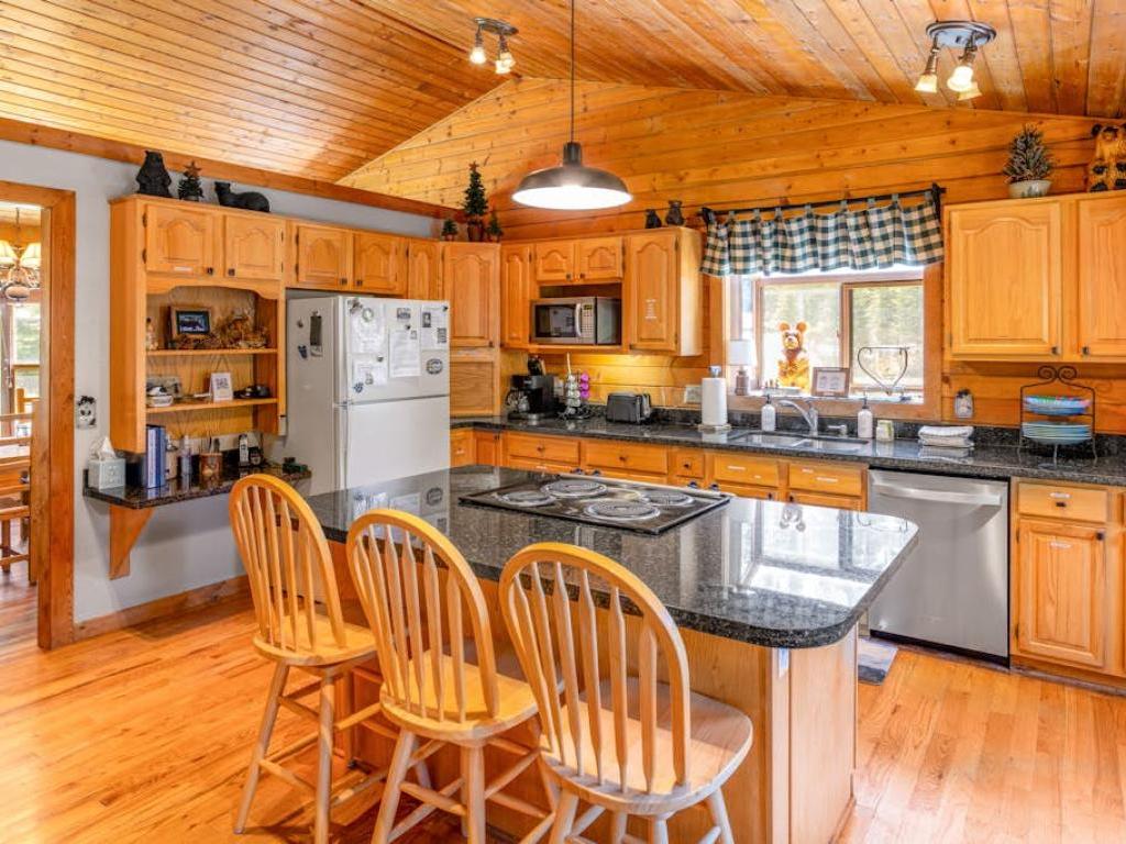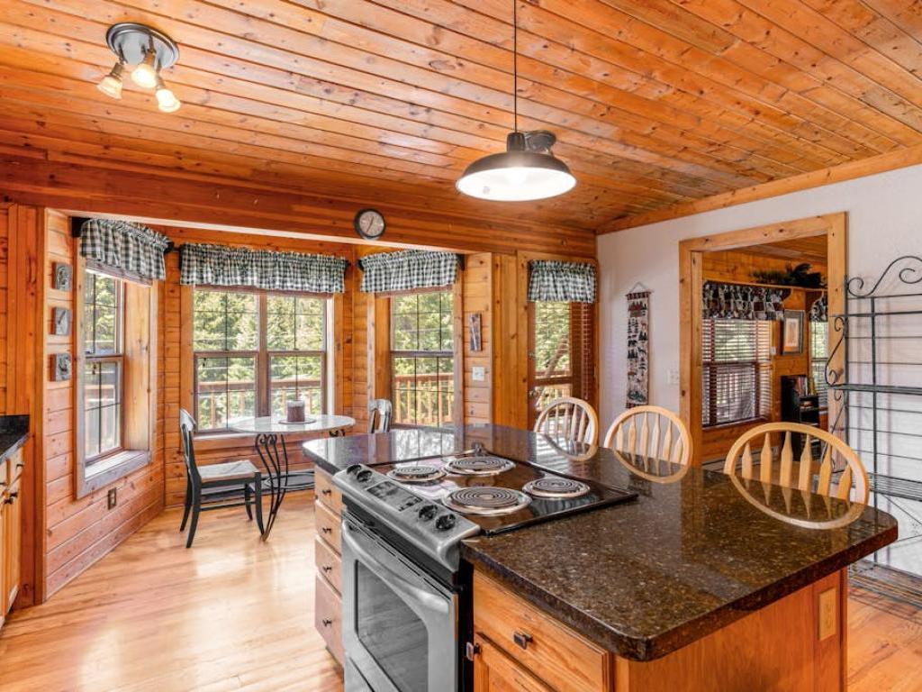 Presenting the ideal space for entertaining, the warm and welcoming Great Room sits at the heart of the home and enjoys wooded and mountain views through the expansive windows, under a vaulted ceiling with a gas-burning fireplace and beautiful rock hearth. The chefs in the group will be delighted with the well-appointed kitchen offering a 6-burner gas cooktop, double ovens, granite countertops, and island seating. An adjacent breakfast nook with large windows and mountain views is a perfect place to sip your coffee while planning the day’s exciting adventures. The huge deck, perfectly suited for entertaining (or relaxing!) sits outside the kitchen and great room and features a BBQ Gas Grill, lots of comfortable seating, and private outdoor hot tub.