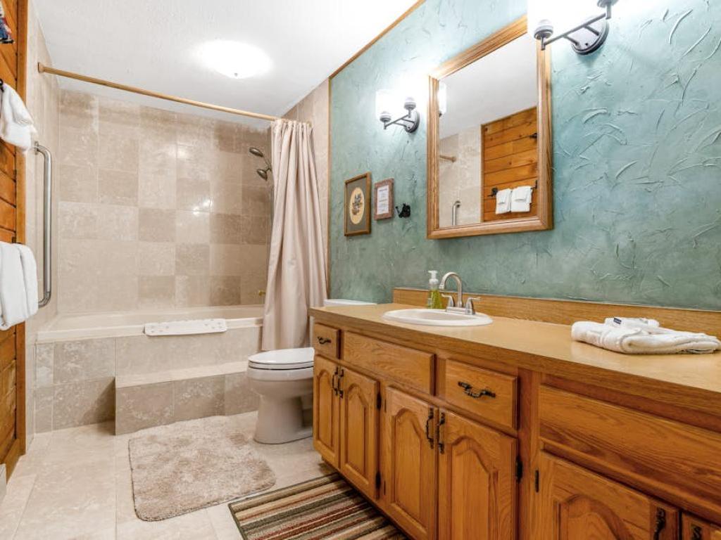 - Blue Spruce King Bedroom: King bed, shared Jack-and-Jill bath with tub/shower combo