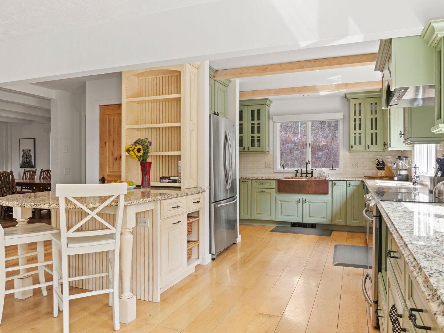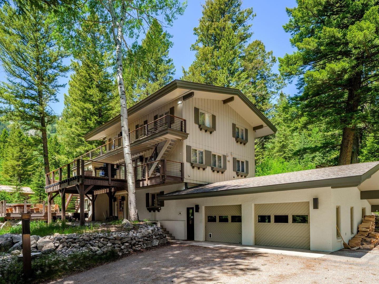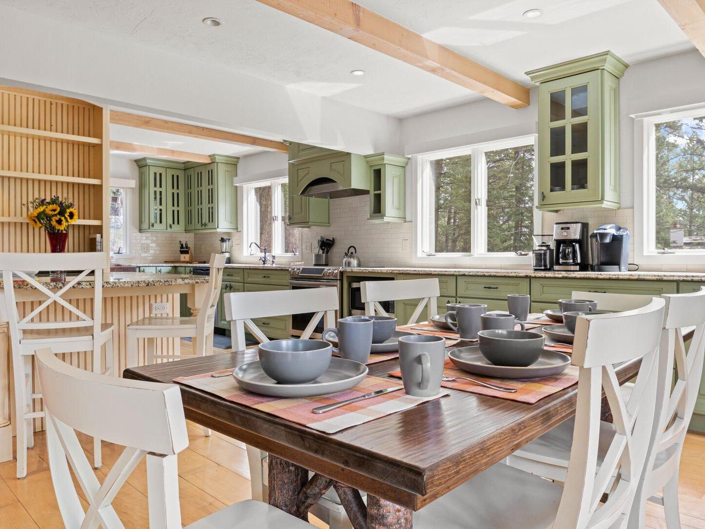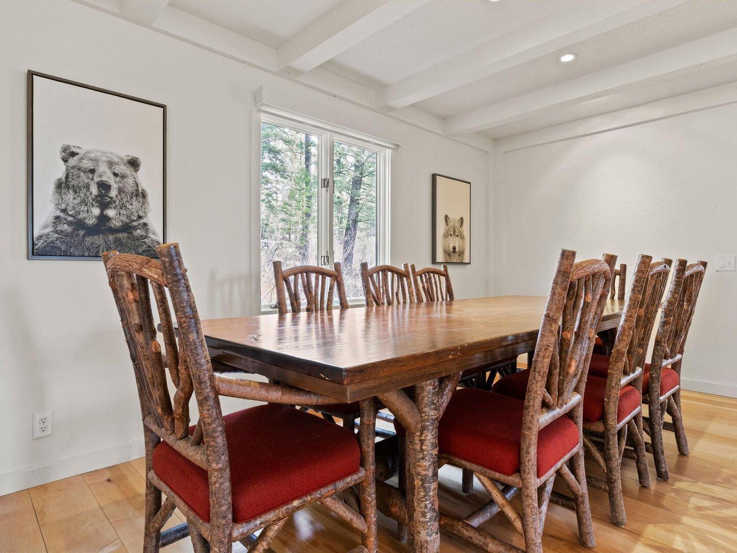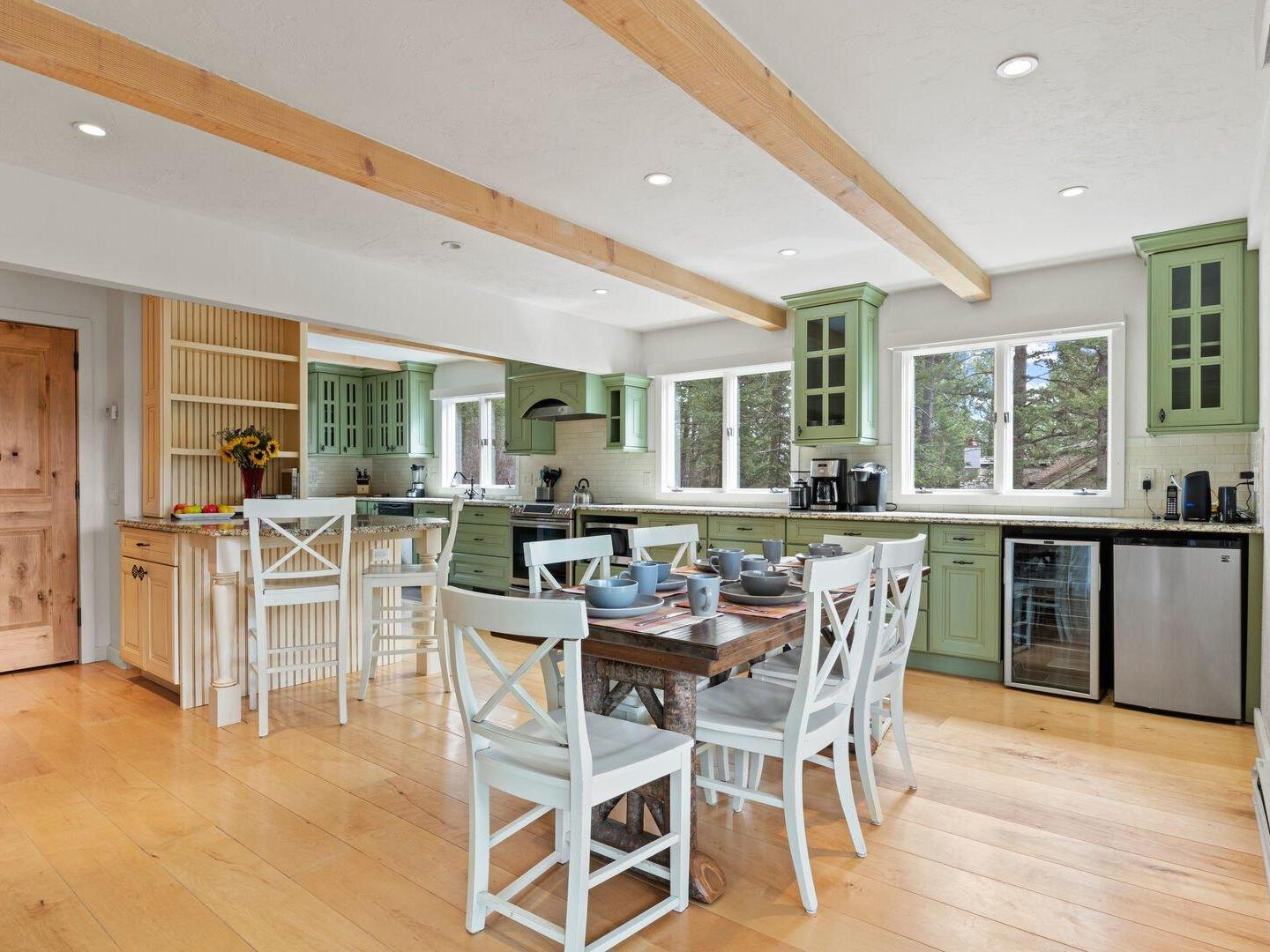 An open staircase divides the home across three spacious levels, with the kitchen occupying the mountain-facing mid-level. This expansive chef’s kitchen features granite countertops, modern appliances, and a large breakfast bar, offering everything needed to prepare and enjoy home-cooked meals. With dining space for up to 10 guests, it’s the perfect gathering place for shared meals after a day of adventure in Jackson Hole.