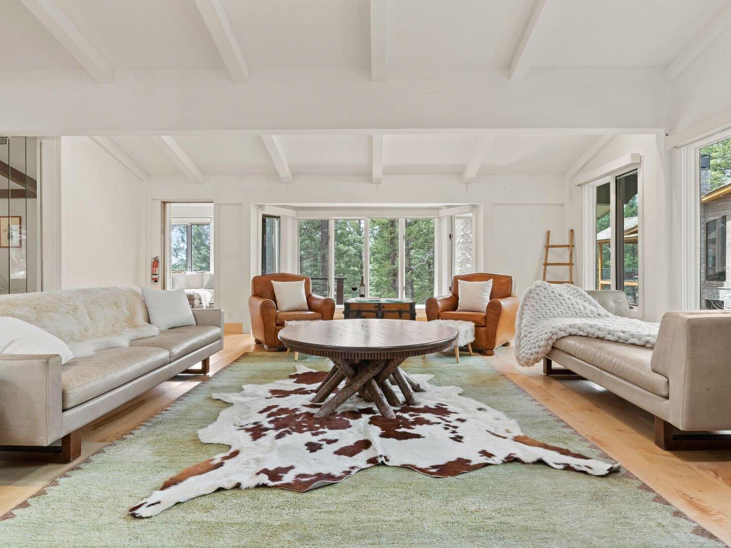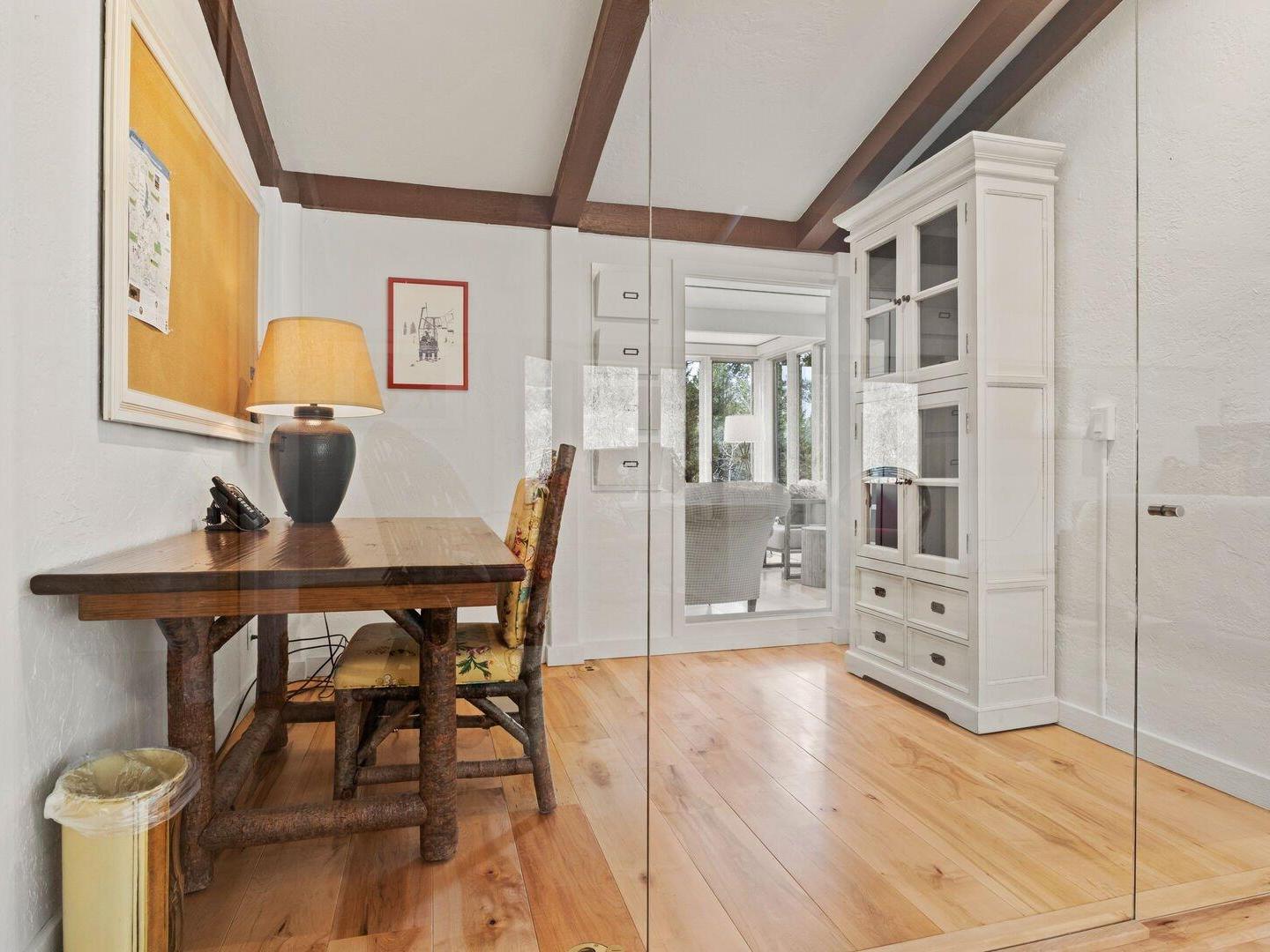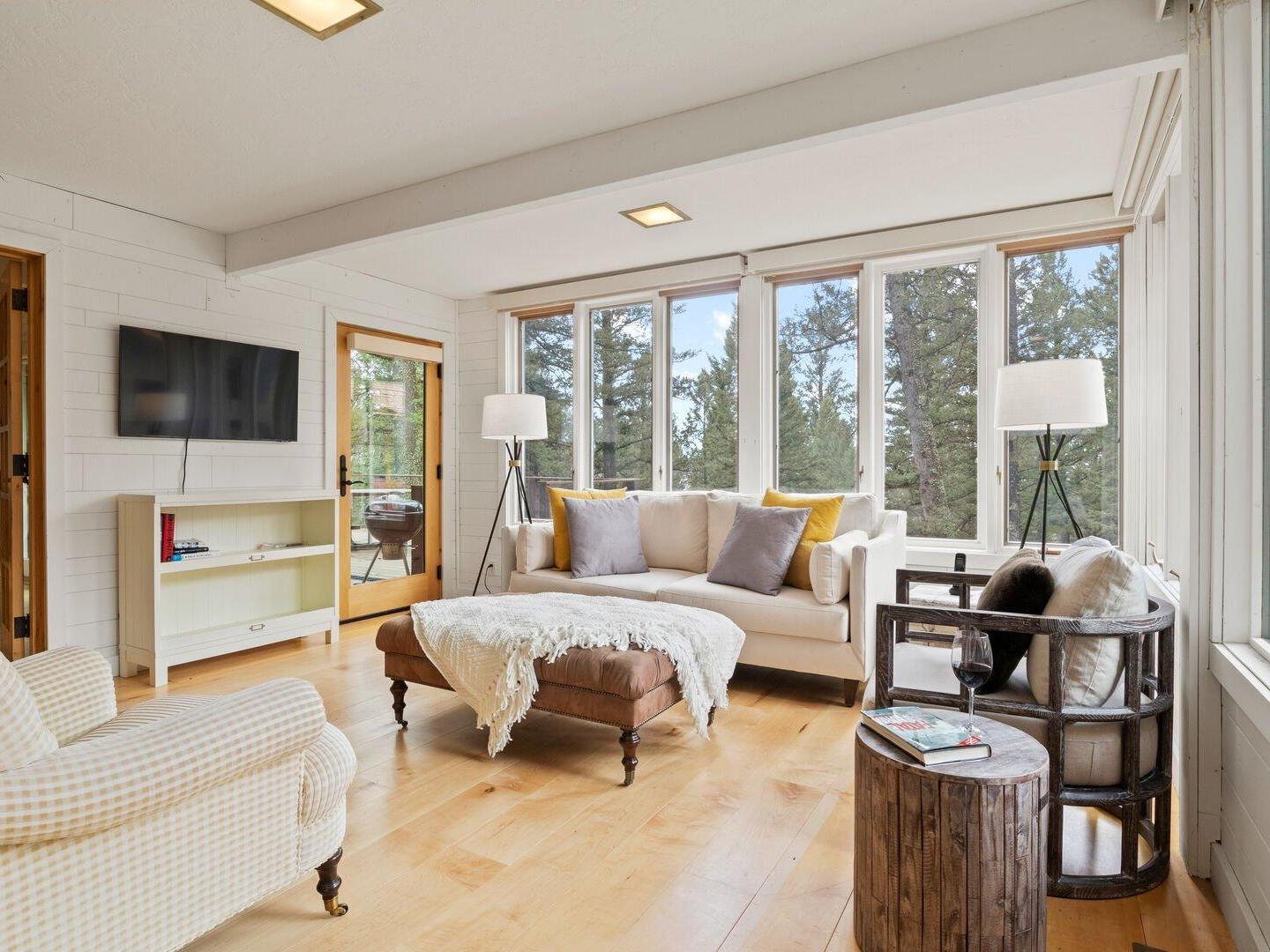Arranged in front of a wood-burning fireplace and wall-mounted television, the main-level living room in this 5-bedroom, 3.5-bathroom Jackson Hole vacation home is an inviting space, furnished with comfortable sofas and chairs and framed by large windows that let in abundant natural light. Off to the side, a second, more intimate sitting room offers the perfect spot to watch your favorite show, play a board game, or simply relax while enjoying the surrounding forest views. An alcove off the main living room hosts a private home office, enclosed by two floor-to-ceiling glass walls, providing a quiet space to work or read.