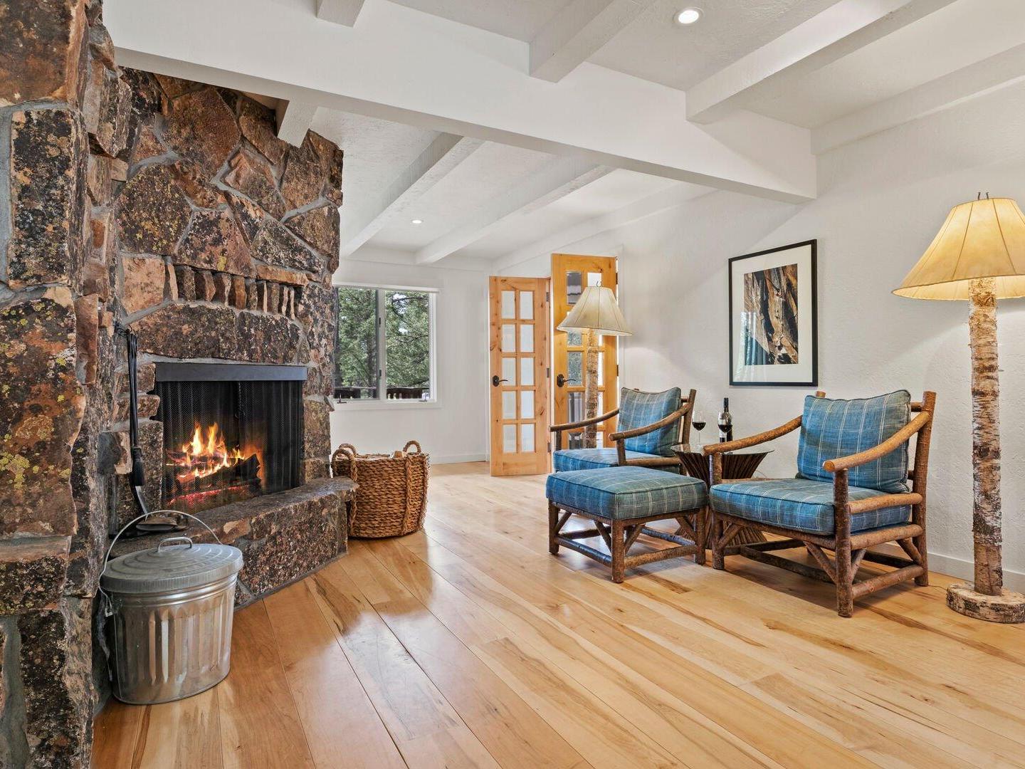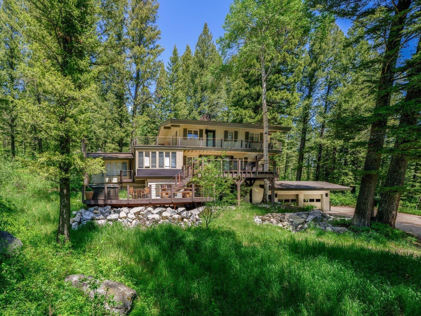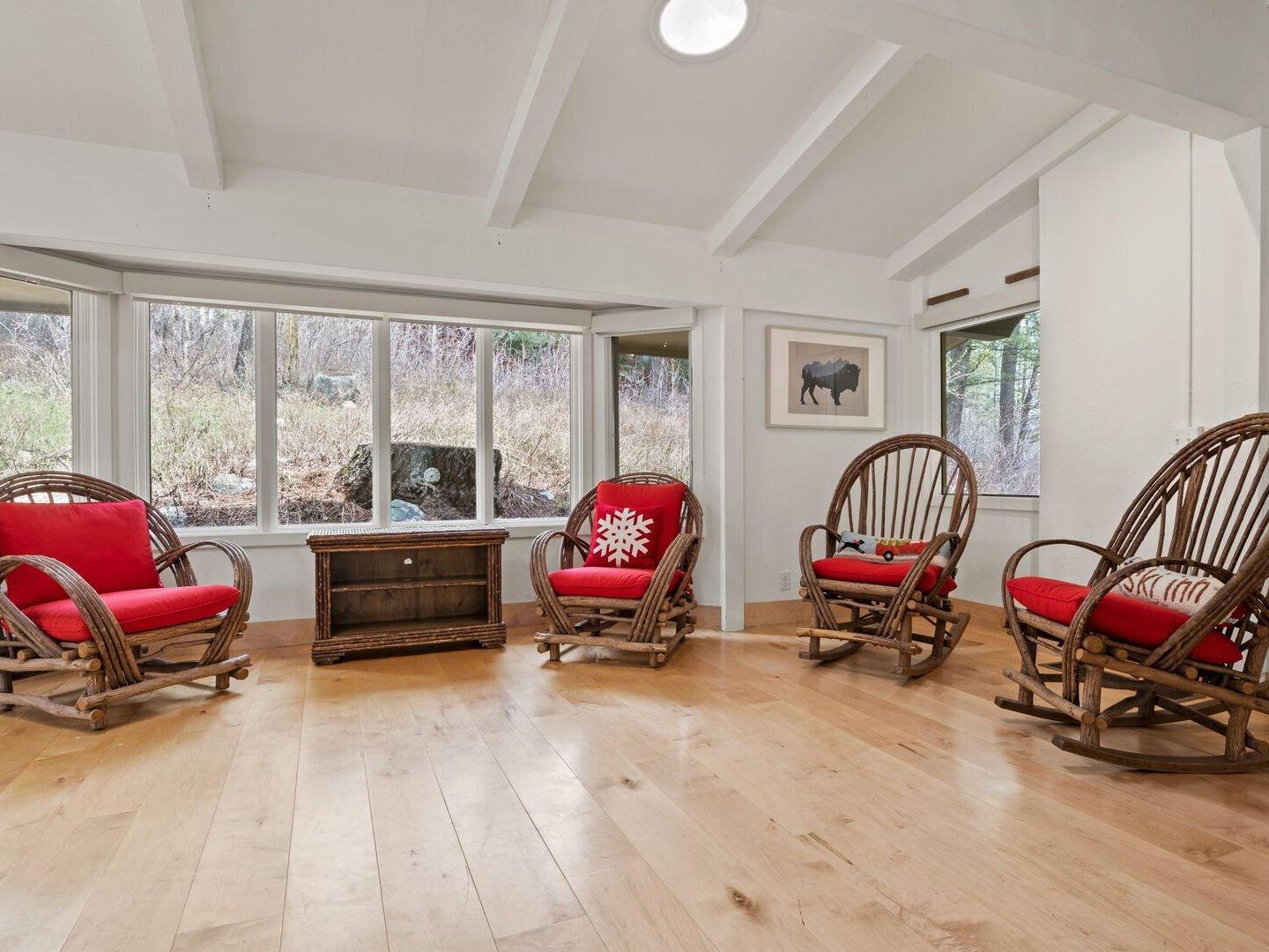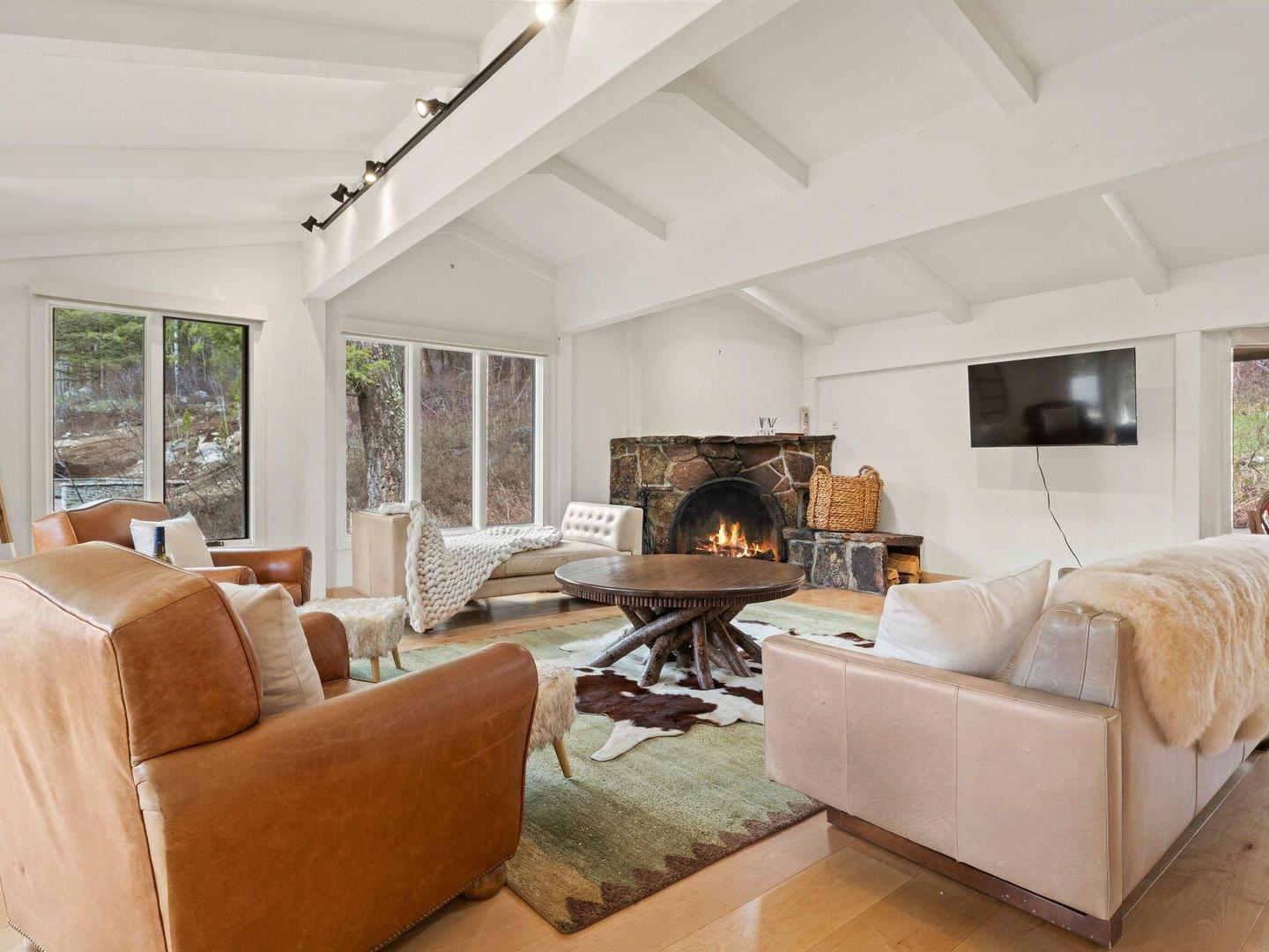 Arranged in front of a wood-burning fireplace and wall-mounted television, the main-level living room in this 5-bedroom, 3.5-bathroom Jackson Hole vacation home is an inviting space, furnished with comfortable sofas and chairs and framed by large windows that let in abundant natural light. Off to the side, a second, more intimate sitting room offers the perfect spot to watch your favorite show, play a board game, or simply relax while enjoying the surrounding forest views. An alcove off the main living room hosts a private home office, enclosed by two floor-to-ceiling glass walls, providing a quiet space to work or read.