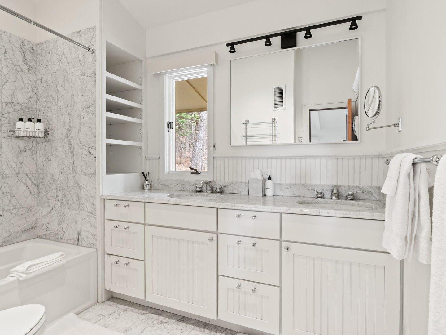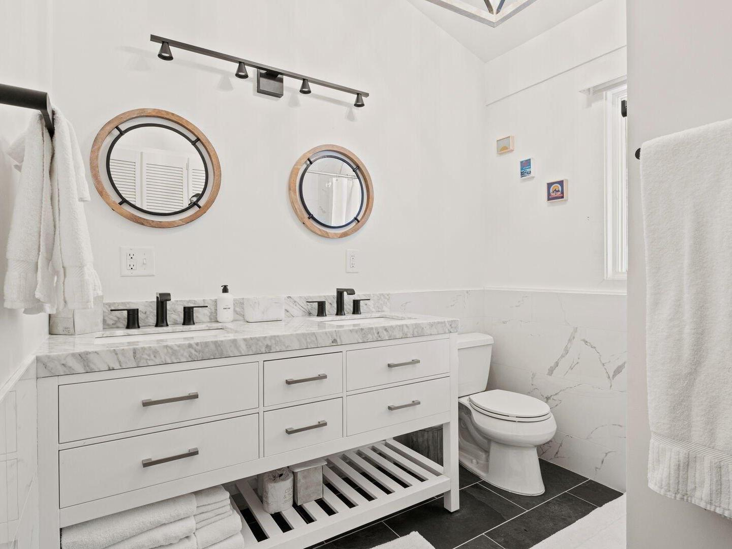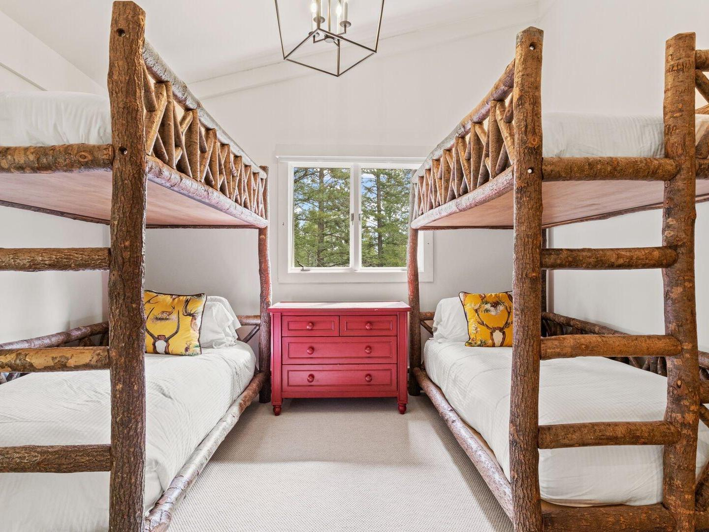 Located on the upper level, the primary bedroom is appointed with a King bed, private deck access, and an en suite bathroom with a dual-sink vanity and a combination shower/tub. Three additional guest bedrooms on this floor share a full bathroom: one is furnished with two sets of Twin-over-Twin bunk beds, another offers a Queen bed, and the third is a cozy room with a single Twin bed — ideal for kids or solo travelers.