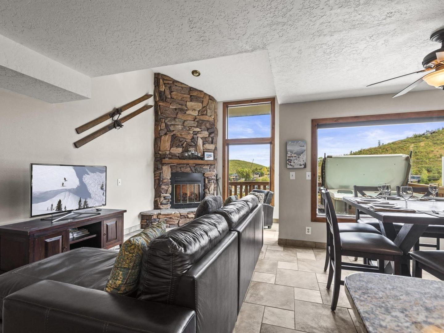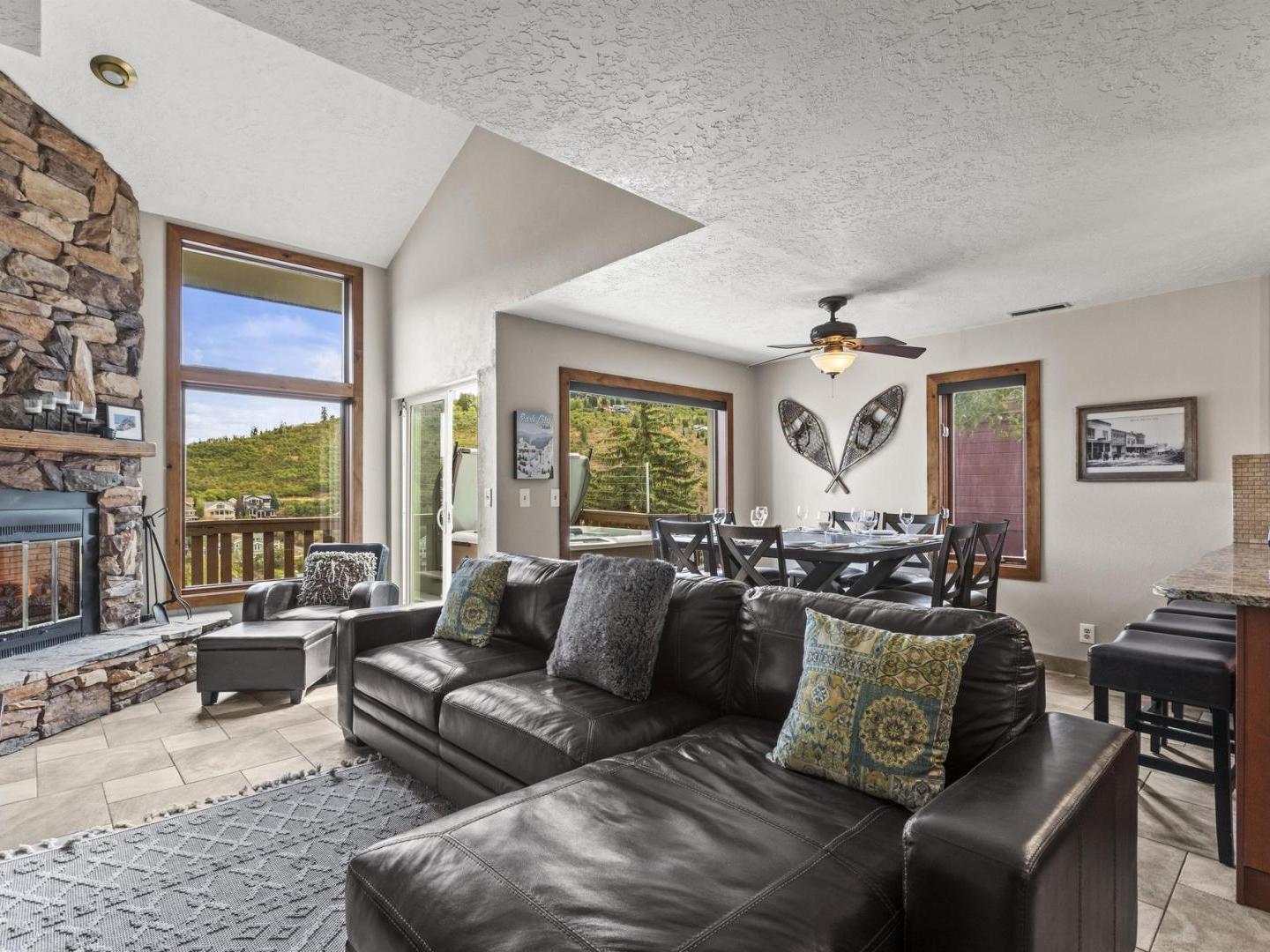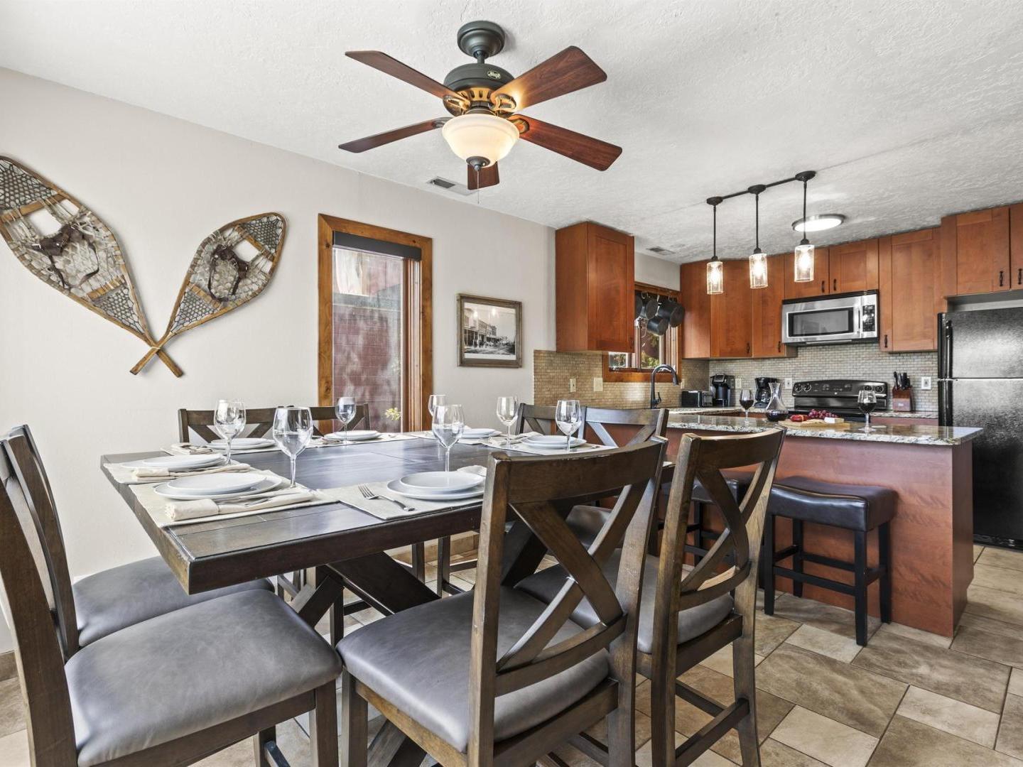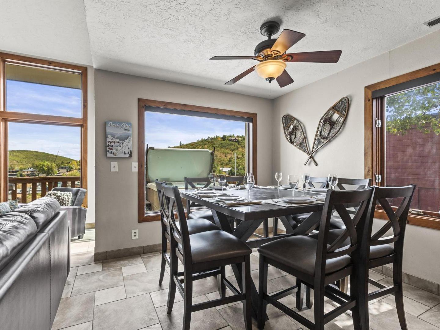 Occupying the main floor of this 4-bedroom, 3.5-bath mountain retreat is a cozy living room, complete with plush seating, a wood-burning fireplace, and an adjacent television—perfect for après-ski relaxation. The fully equipped kitchen features modern appliances, granite countertops, and a breakfast bar with seating for four. An adjacent dining area comfortably seats eight more, making it easy to enjoy meals together. Step outside onto the deck and soak in the private hot tub while taking in stunning views of Old Town and Upper Deer Valley.