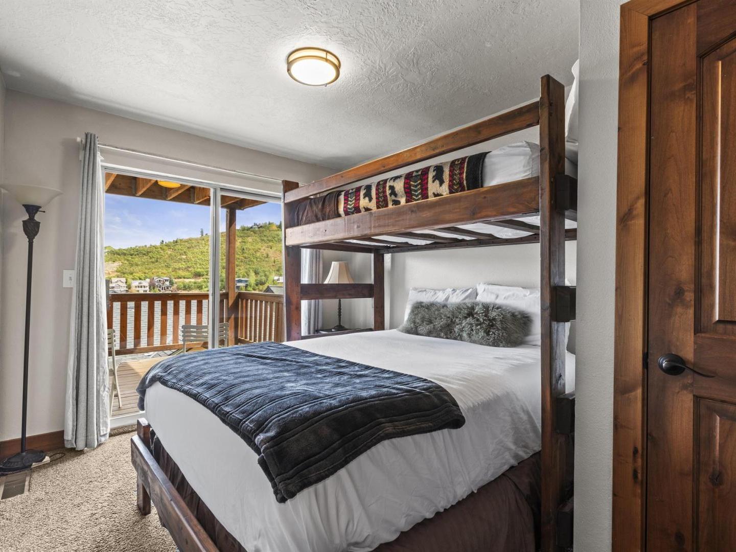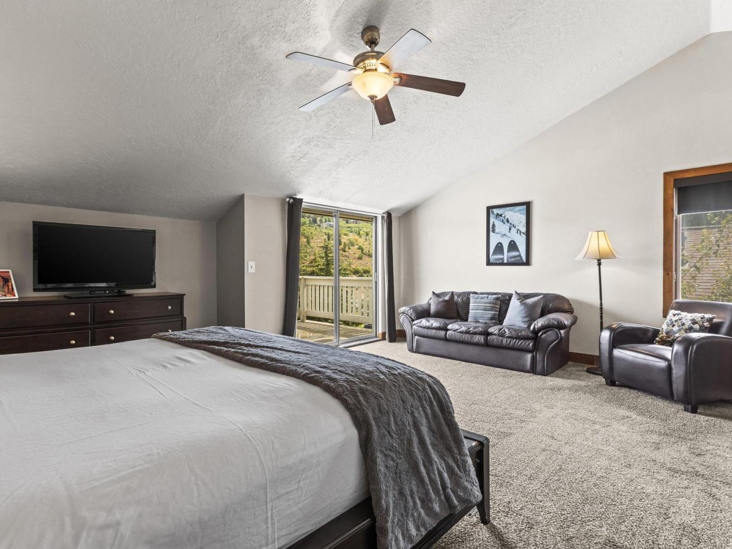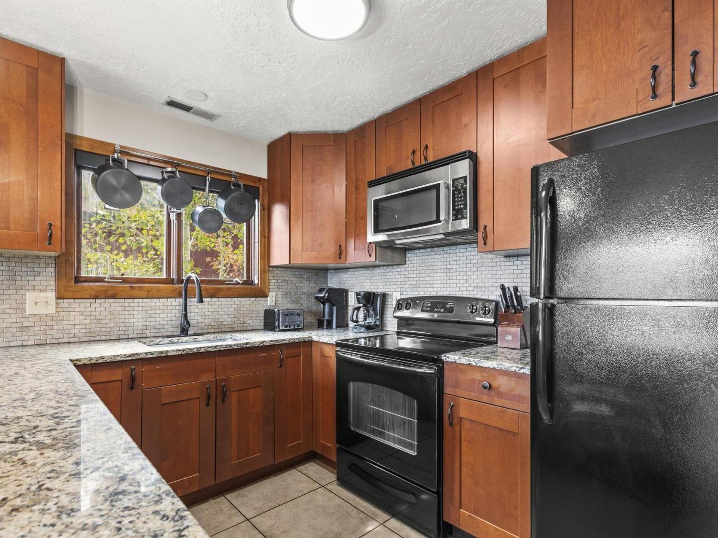 Occupying the main floor of this 4-bedroom, 3.5-bath mountain retreat is a cozy living room, complete with plush seating, a wood-burning fireplace, and an adjacent television—perfect for après-ski relaxation. The fully equipped kitchen features modern appliances, granite countertops, and a breakfast bar with seating for four. An adjacent dining area comfortably seats eight more, making it easy to enjoy meals together. Step outside onto the deck and soak in the private hot tub while taking in stunning views of Old Town and Upper Deer Valley.