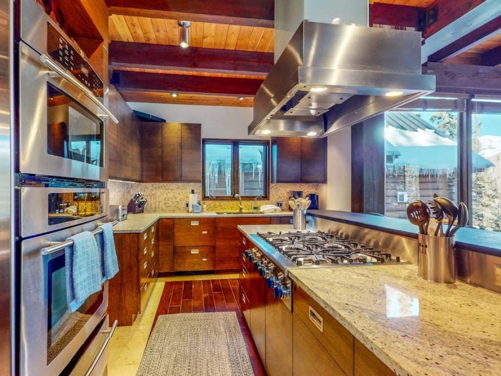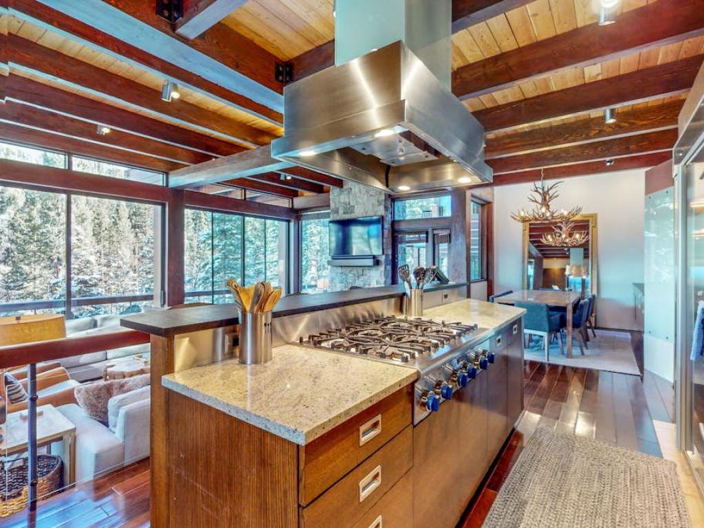 Set on the mountainside within a 5 minute walk to the Lower Sundance ski trail, your mountain vacation will be spent in style and convenience as you enjoy the comforts and amenities of Cabins Lane Retreat. Presenting an inviting space for the entire group of up to 10 guests to gather and entertain, the main level great room features an open layout with walls of windows framing the living space. Quality furnishings are arranged in front of a gas fireplace and flatscreen television in the cozy living room with access to the deck and barbecue grill through large glass doors. Overlooking the living room, the gourmet kitchen boasts high-end appliances, including a 6-burner gas stovetop and double ovens, with a breakfast bar seating 4 and an adjacent dining area with seating for 8 guests.