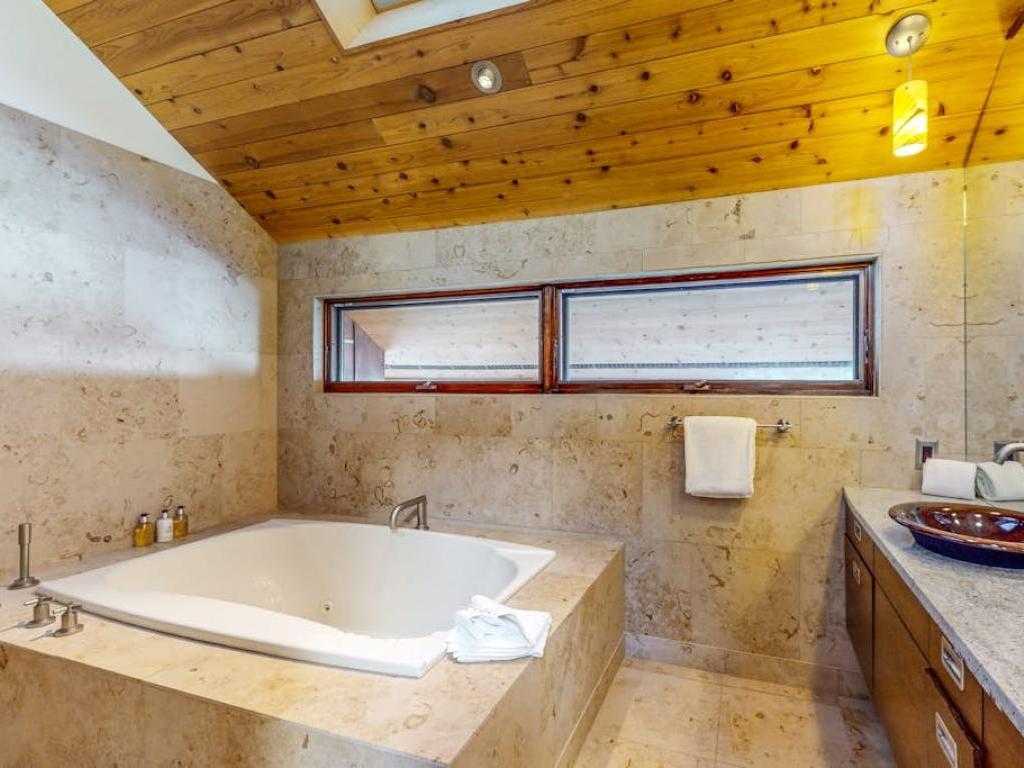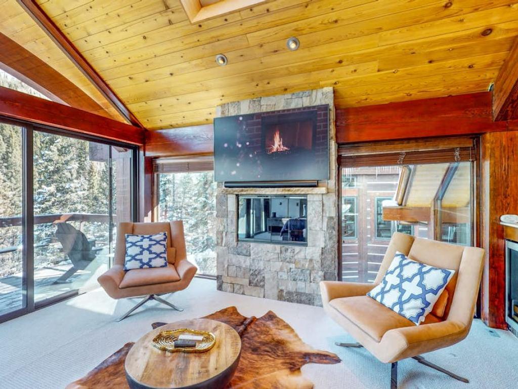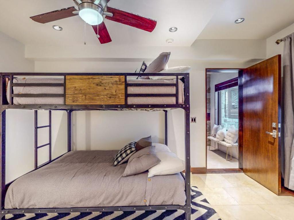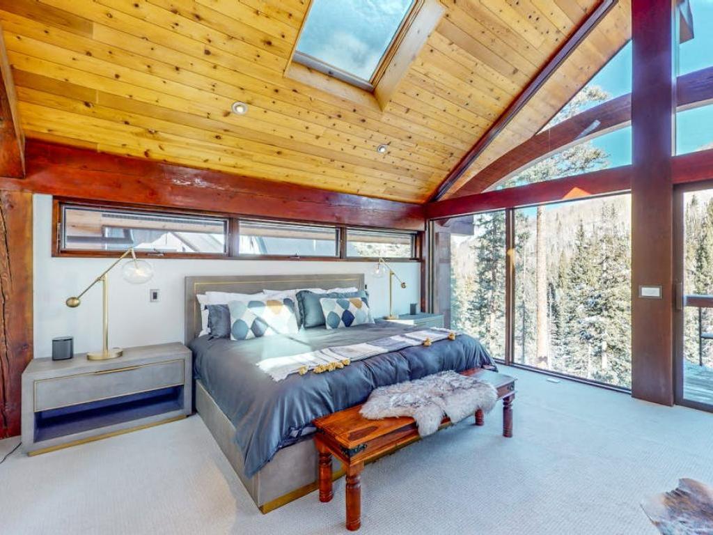 Two guest bedrooms furnished with Queen beds are located on the lower level, one enjoys a private bathroom while the other shares a bathroom with the family room. Up a half level is a large guest bedroom outfitted with a Queen bed and including a private nursery room. Located on the third level, the primary suite features a King bed set under vaulted ceilings with a wall of windows, private balcony, gas fireplace, office area, and private bathroom boasting a jetted tub and steam shower. Another half level above the primary suite is a unique "apartment" area with a King bed, private bathroom with jetted tub, and a second full kitchen.