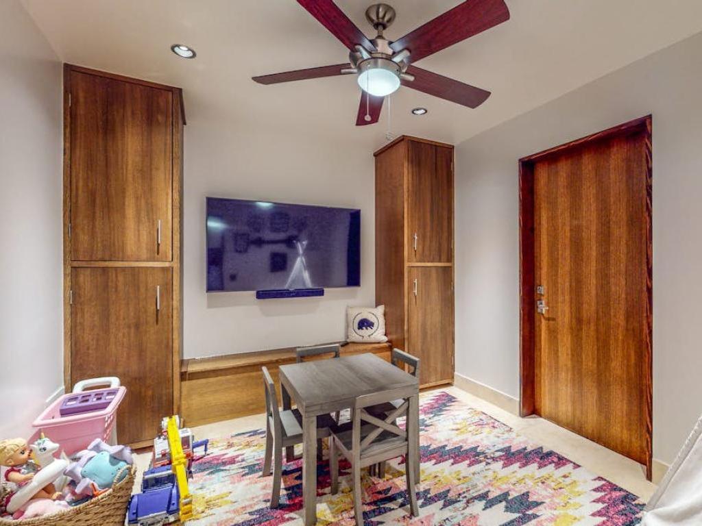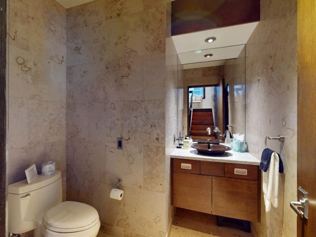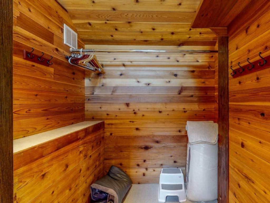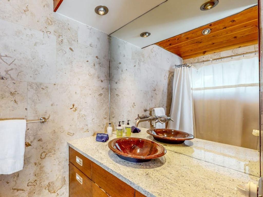 Two guest bedrooms furnished with Queen beds are located on the lower level, one enjoys a private bathroom while the other shares a bathroom with the family room. Up a half level is a large guest bedroom outfitted with a Queen bed and including a private nursery room. Located on the third level, the primary suite features a King bed set under vaulted ceilings with a wall of windows, private balcony, gas fireplace, office area, and private bathroom boasting a jetted tub and steam shower. Another half level above the primary suite is a unique "apartment" area with a King bed, private bathroom with jetted tub, and a second full kitchen.