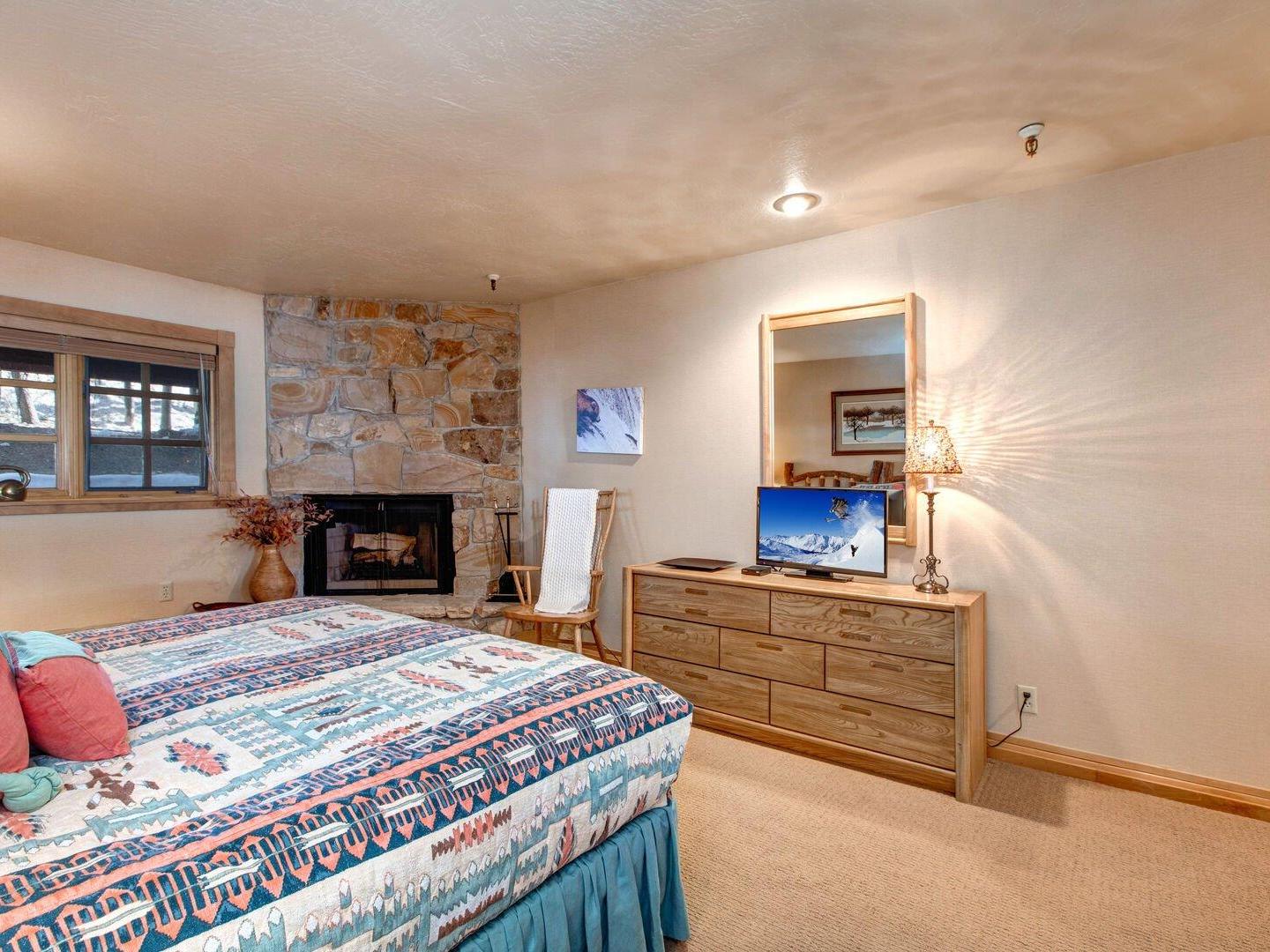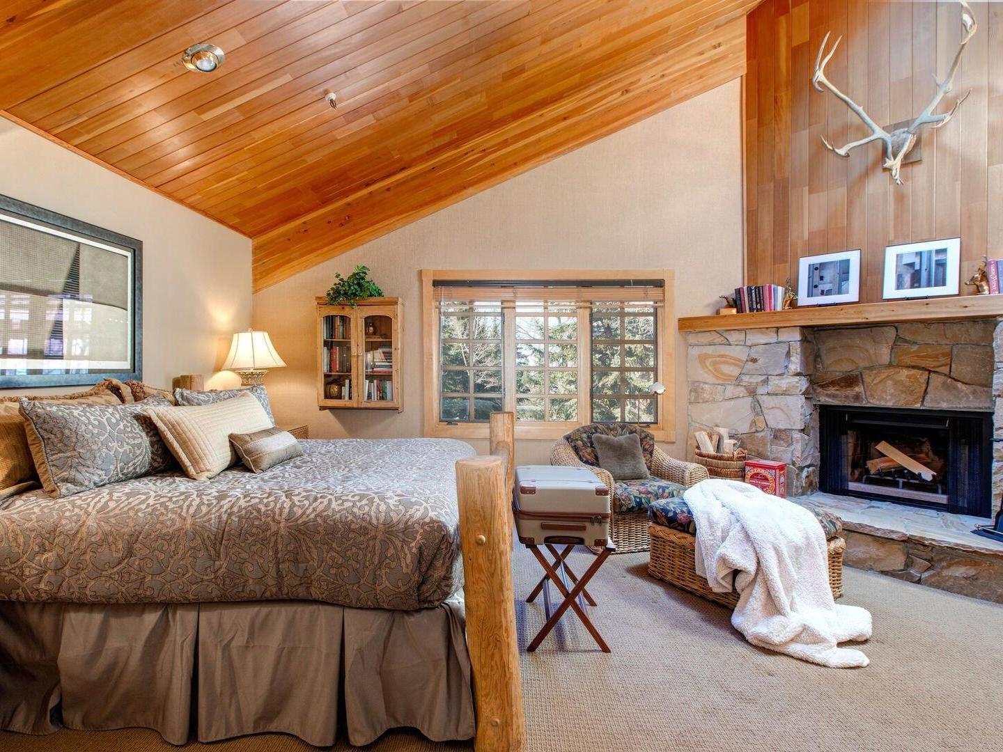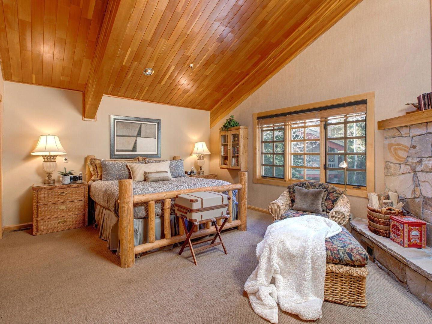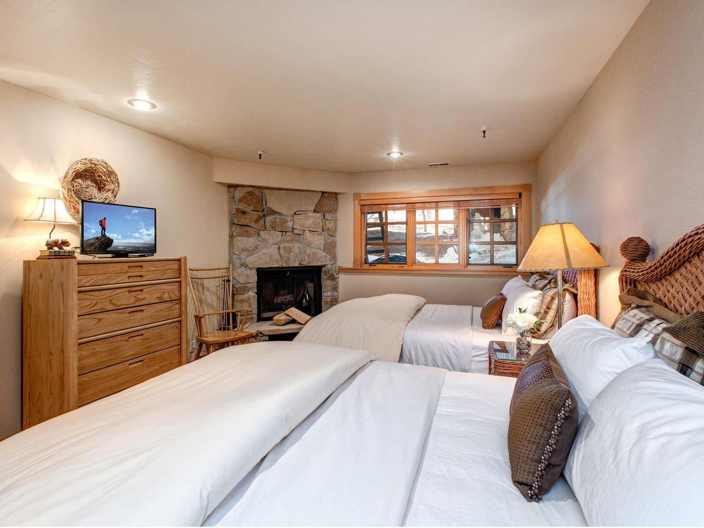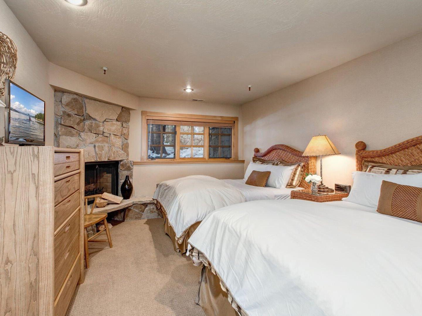 Located a half level down from the living area, the primary bedroom is appointed with a King bed, fireplace and private bathroom with a dual-sink vanity and walk-in shower. Two guest bedrooms with private bathrooms and fireplaces are located on the lower, one is furnished with a King bed while the other offers two Queen beds.