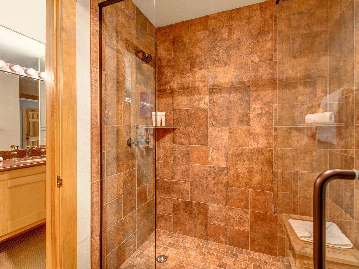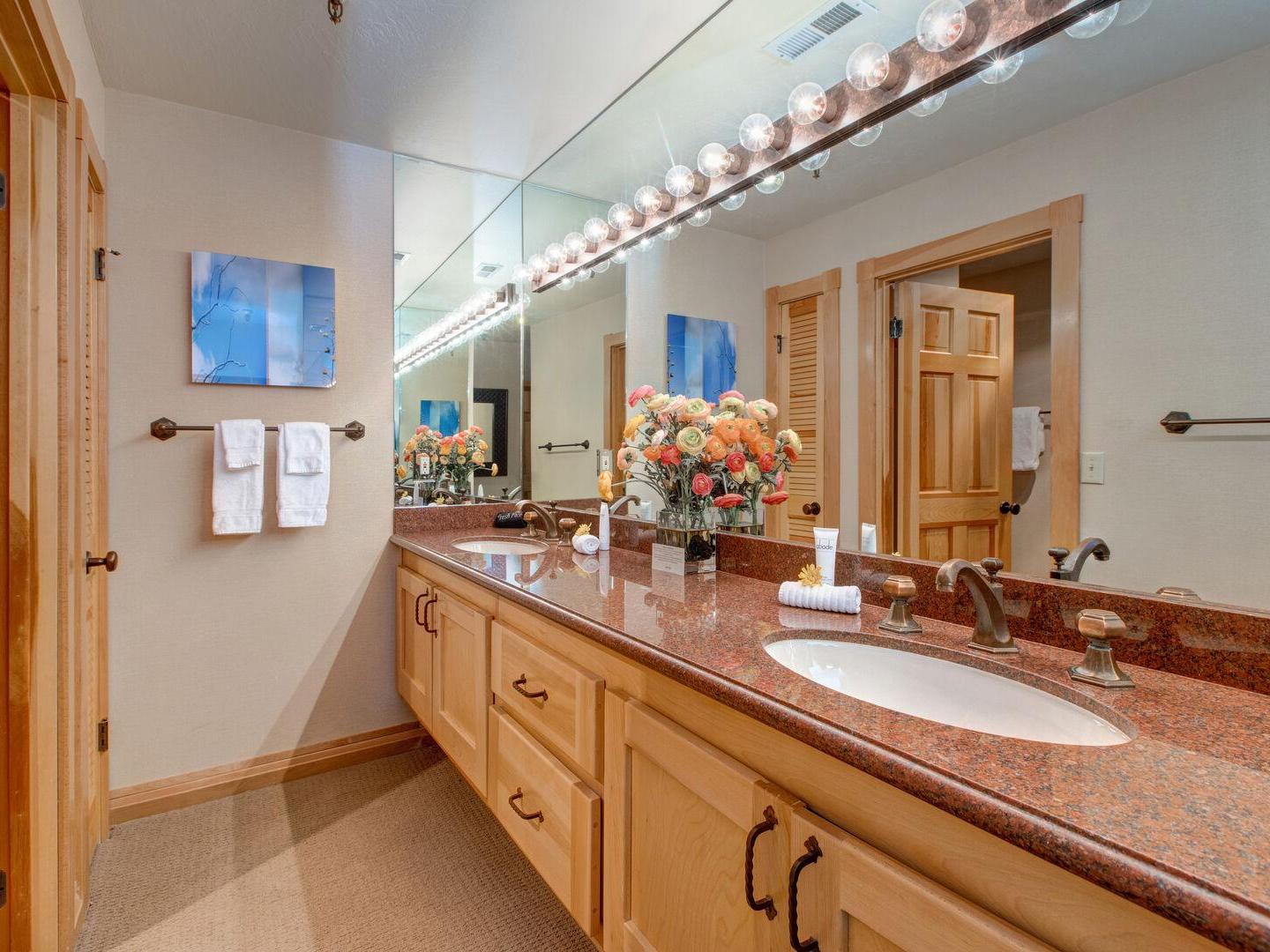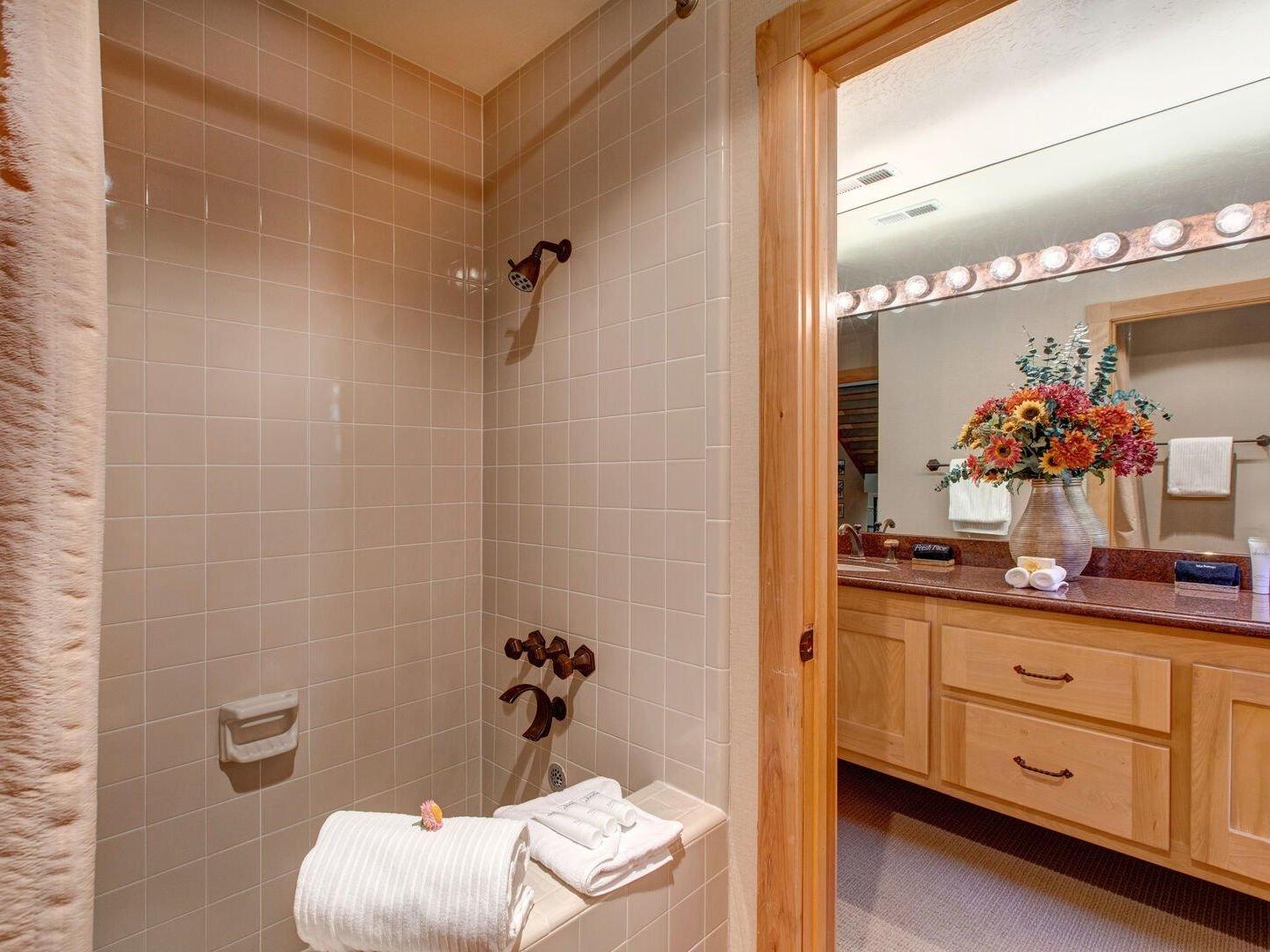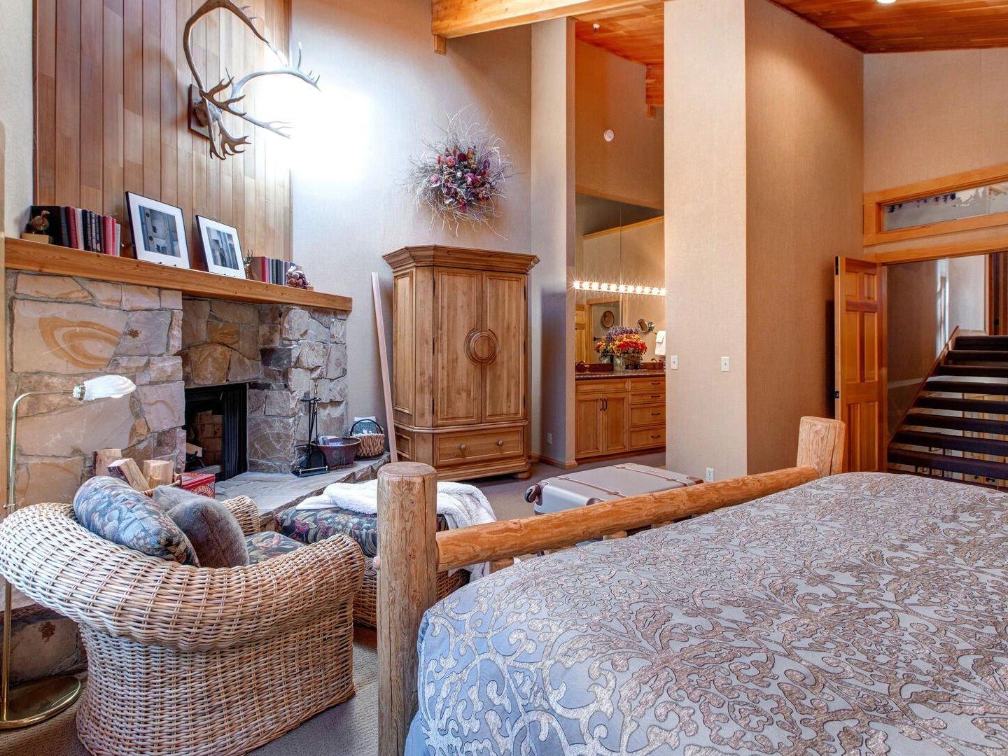 Located a half level down from the living area, the primary bedroom is appointed with a King bed, fireplace and private bathroom with a dual-sink vanity and walk-in shower. Two guest bedrooms with private bathrooms and fireplaces are located on the lower, one is furnished with a King bed while the other offers two Queen beds.