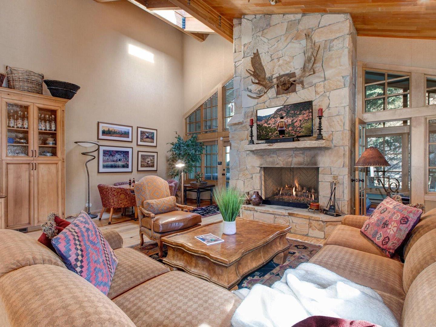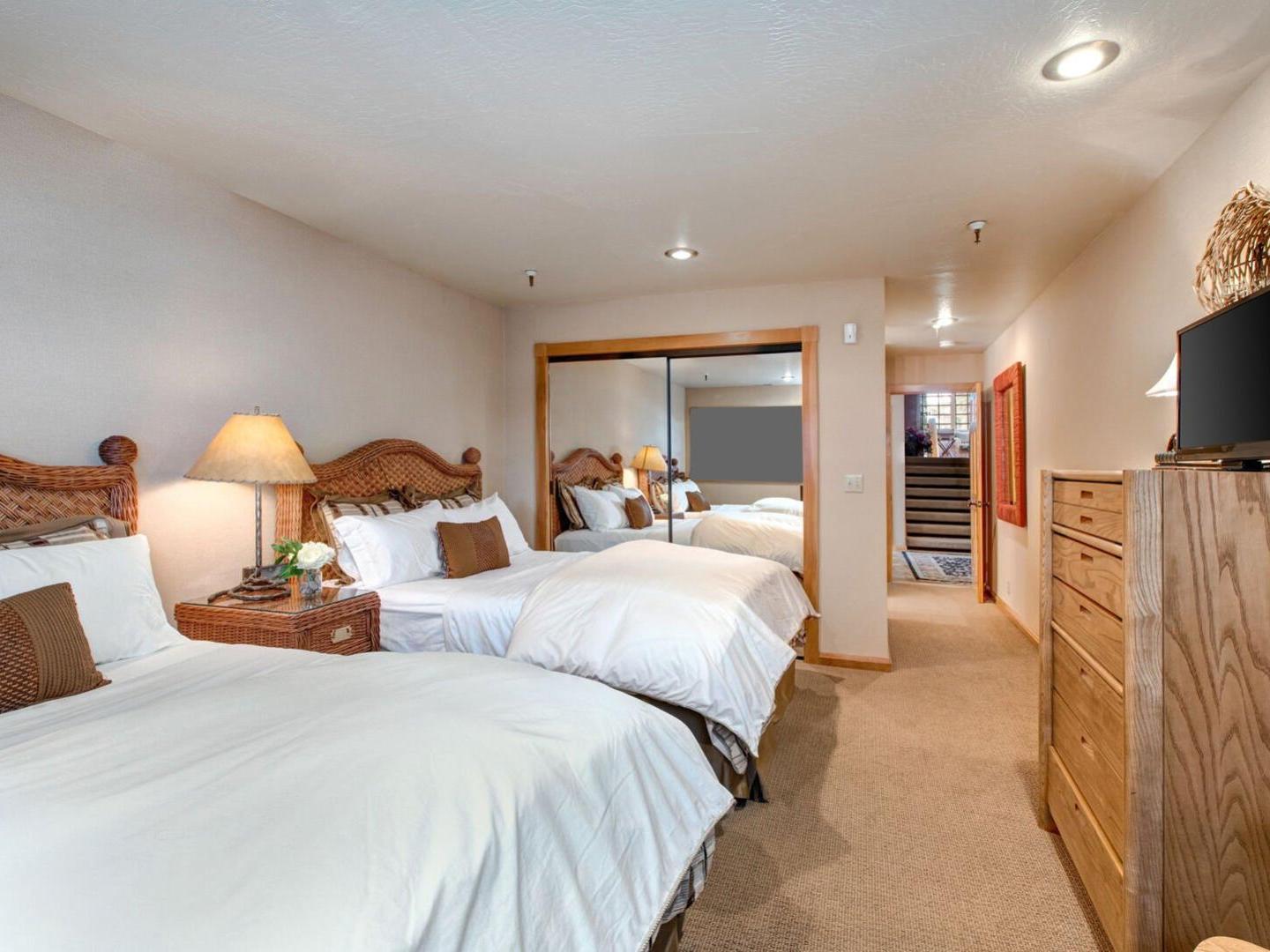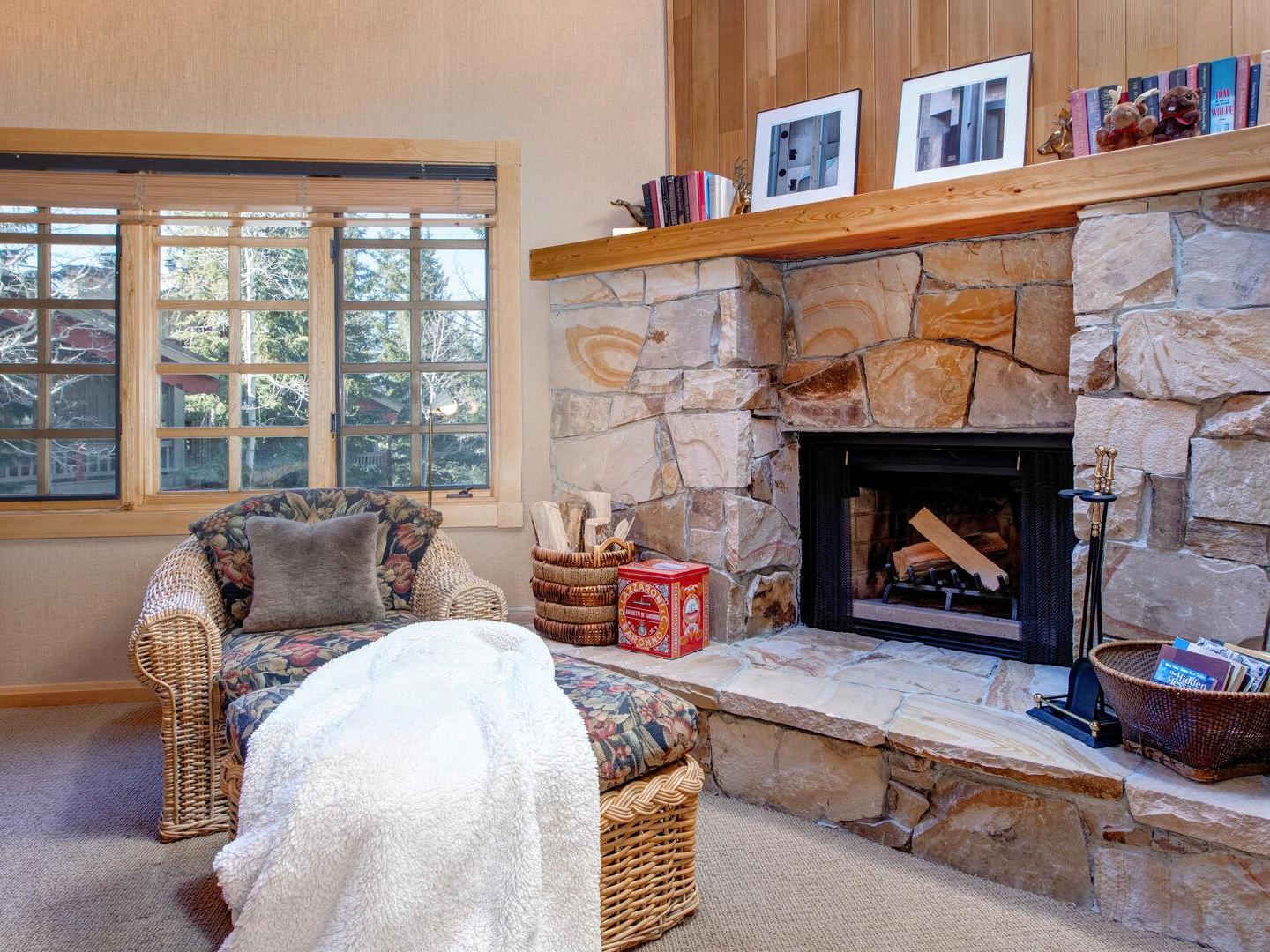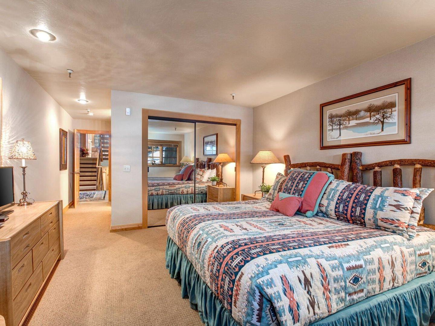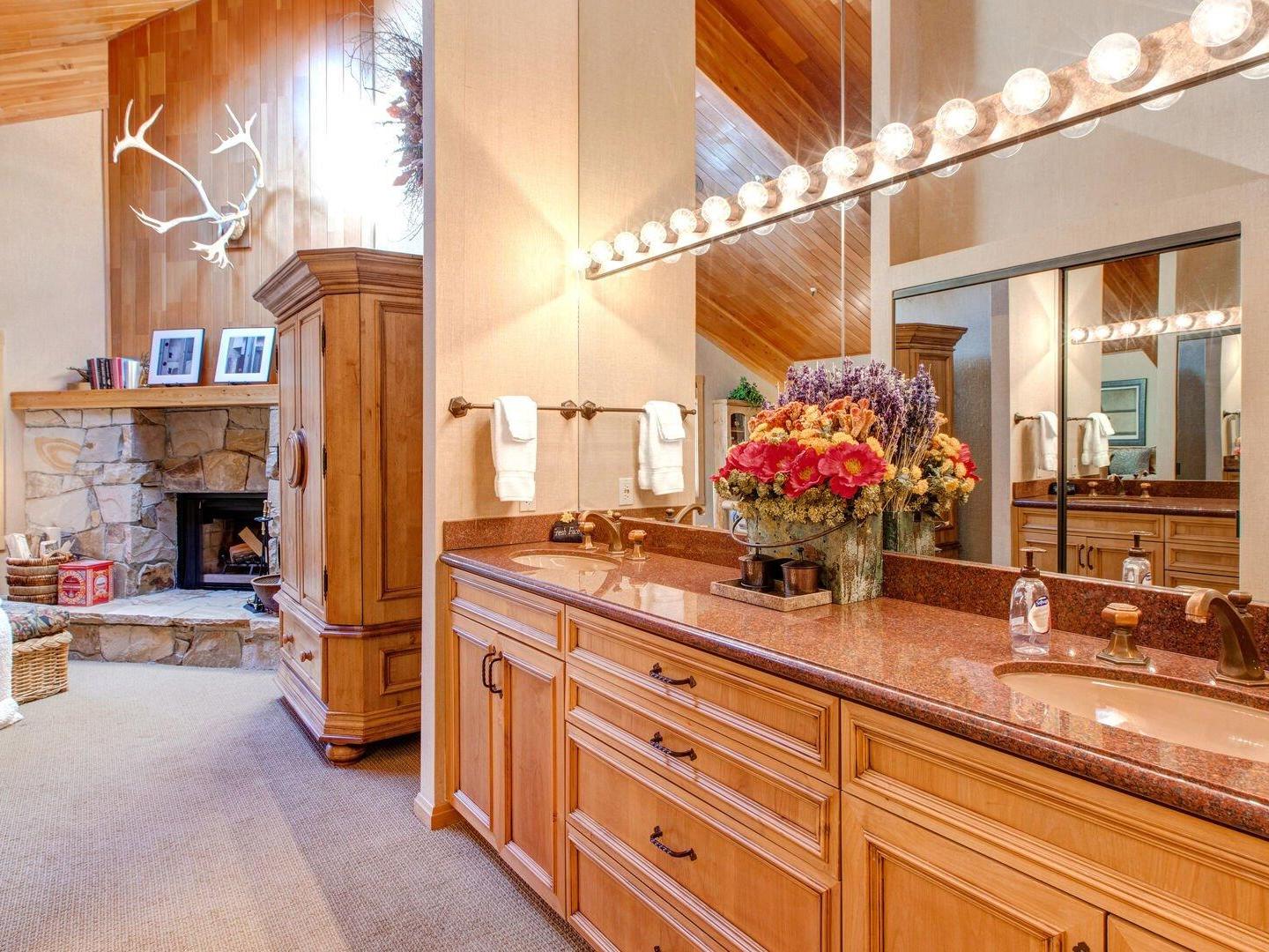 Located a half level down from the living area, the primary bedroom is appointed with a King bed, fireplace and private bathroom with a dual-sink vanity and walk-in shower. Two guest bedrooms with private bathrooms and fireplaces are located on the lower, one is furnished with a King bed while the other offers two Queen beds.