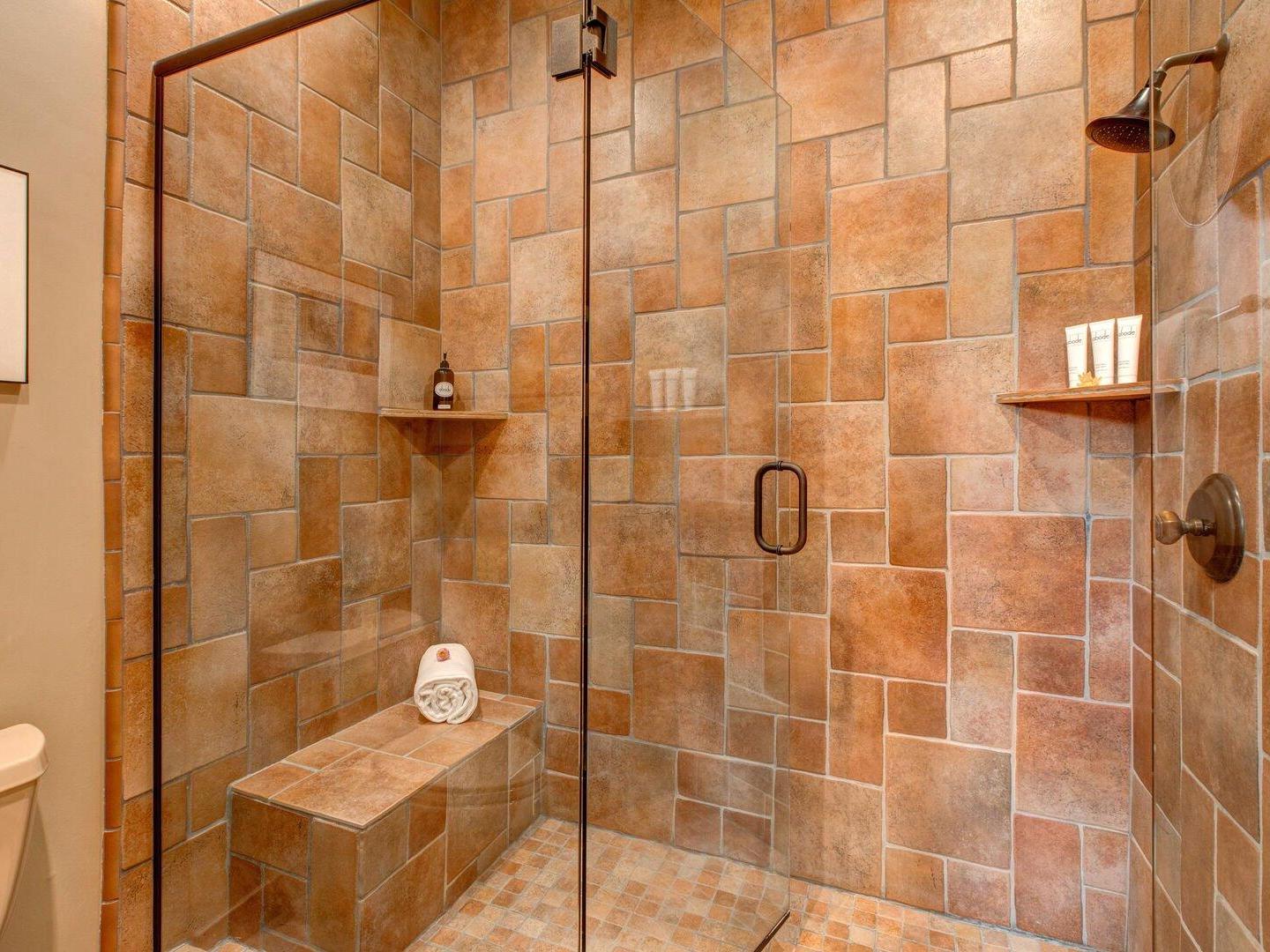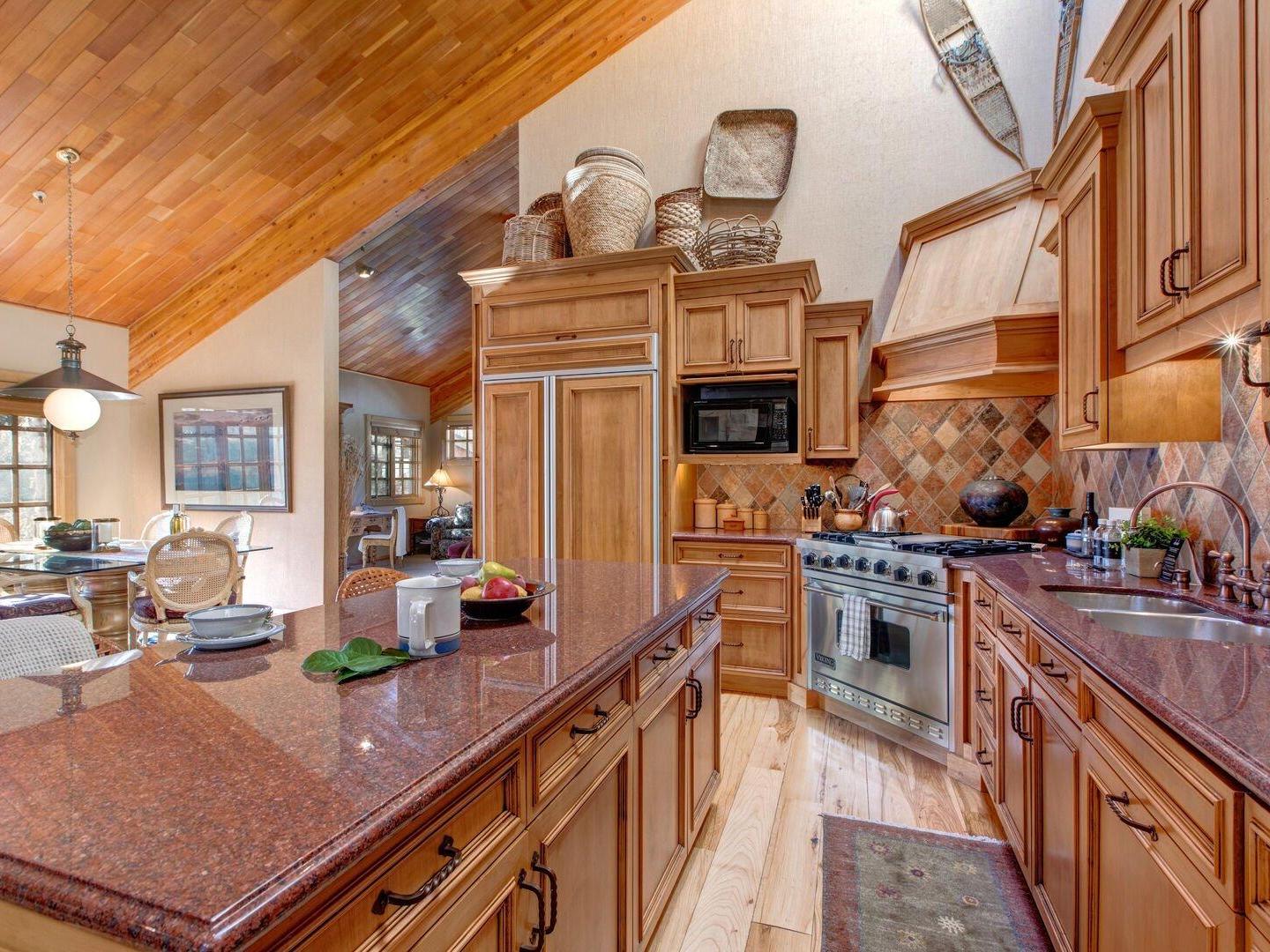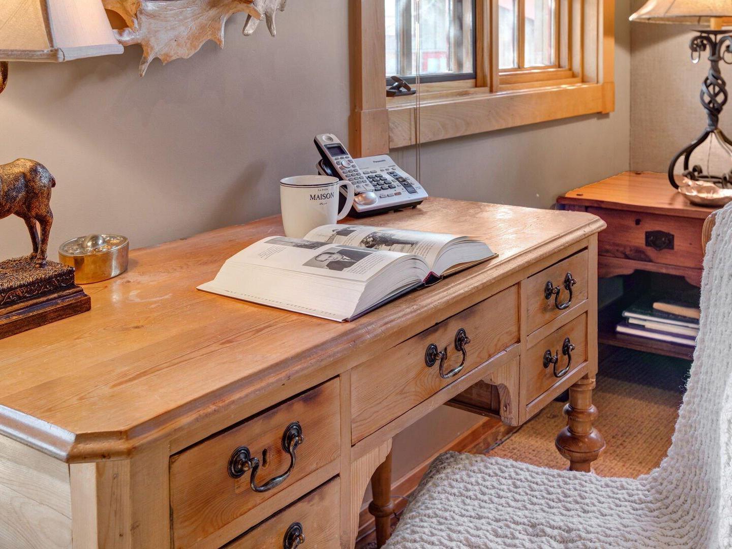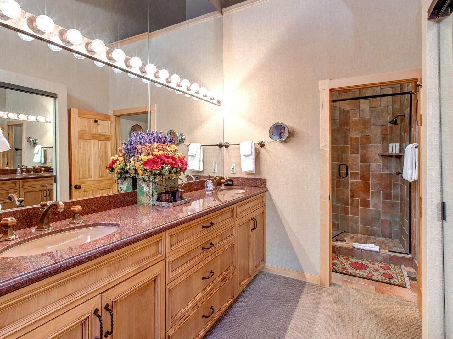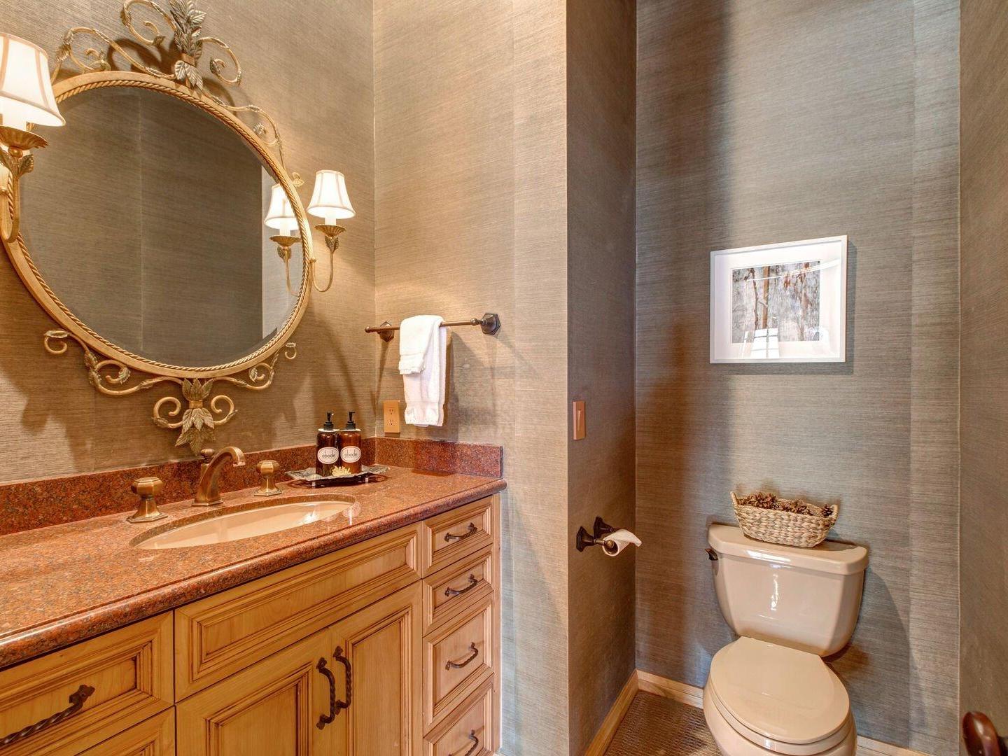 Located a half level down from the living area, the primary bedroom is appointed with a King bed, fireplace and private bathroom with a dual-sink vanity and walk-in shower. Two guest bedrooms with private bathrooms and fireplaces are located on the lower, one is furnished with a King bed while the other offers two Queen beds.