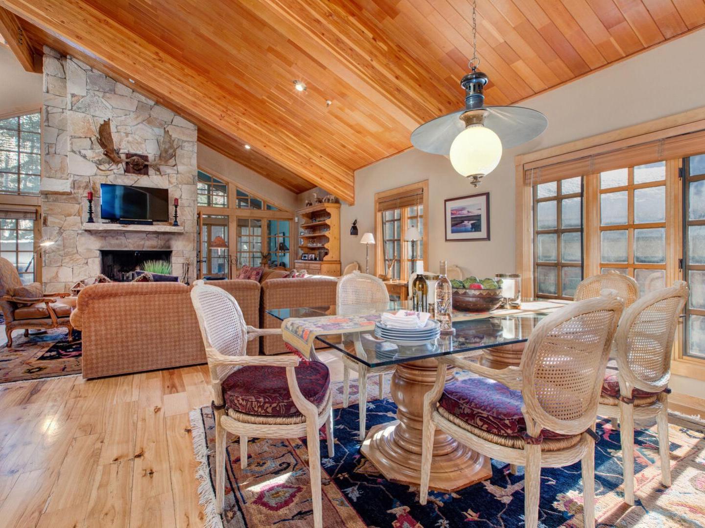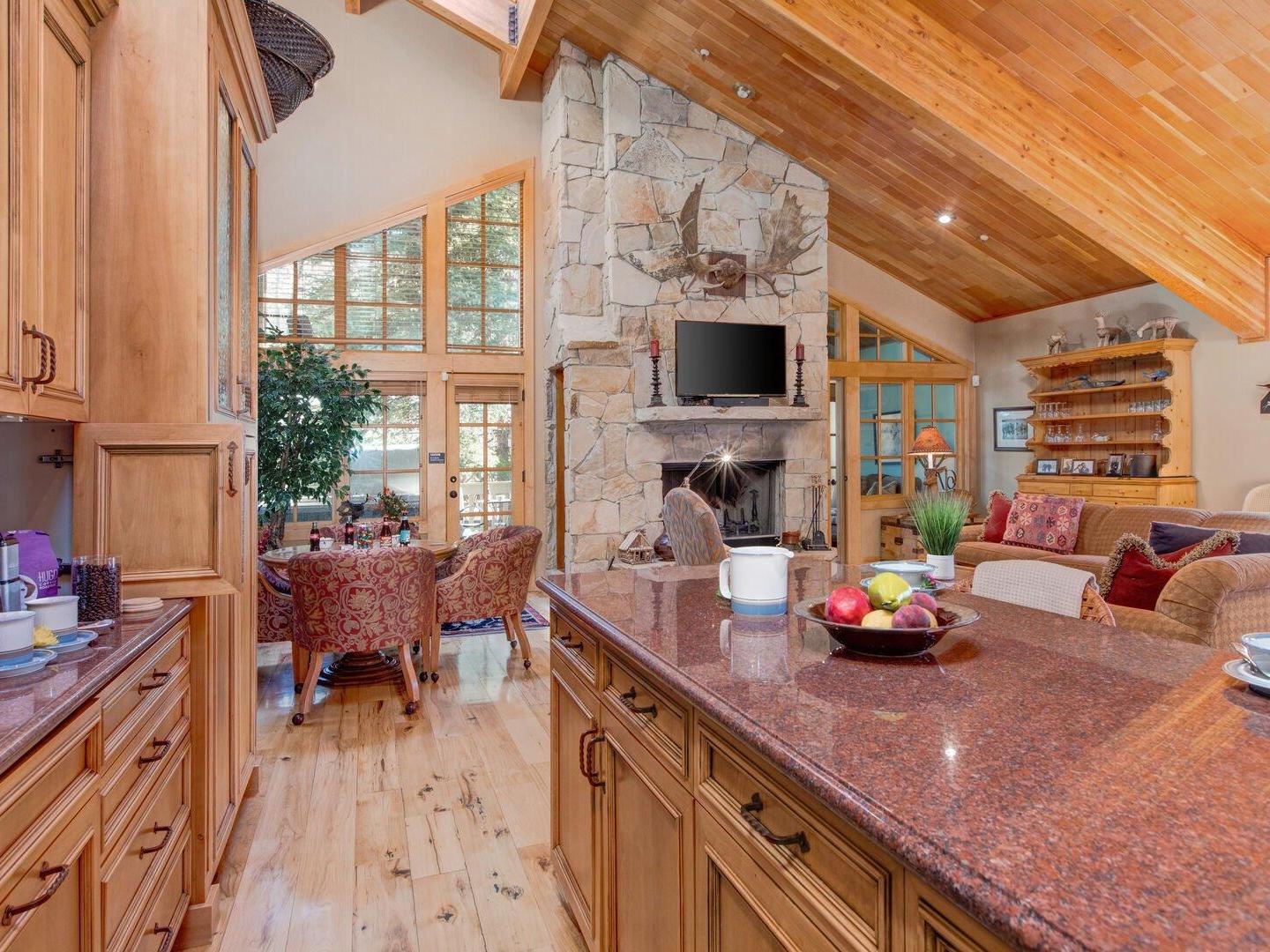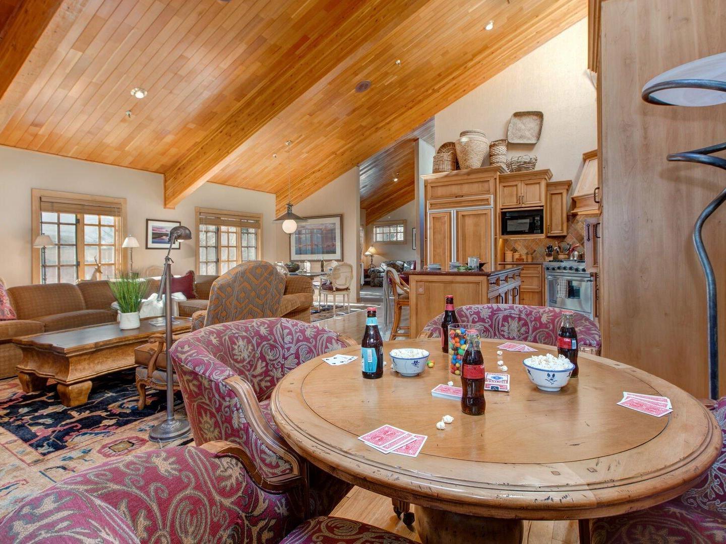 Designed for entertaining, the main level of this 3-bedroom, 3-bathroom townhouse welcomes guests with a spacious, tastefully furnished living room featuring vaulted ceilings, a stone-framed fireplace, and a wall-mounted TV. Two adjacent tables provide seating for up to ten—perfect for dining or game nights—while the open-concept kitchen is fully equipped with high-quality appliances, granite countertops, and a breakfast bar for two.