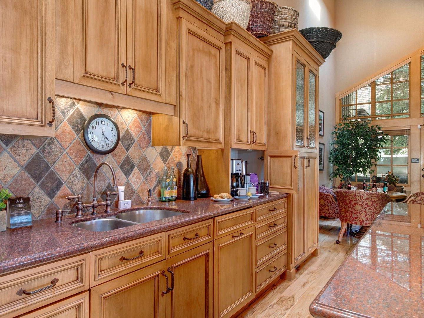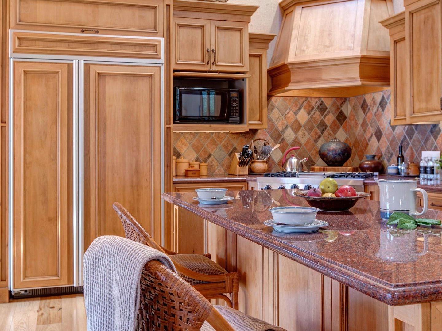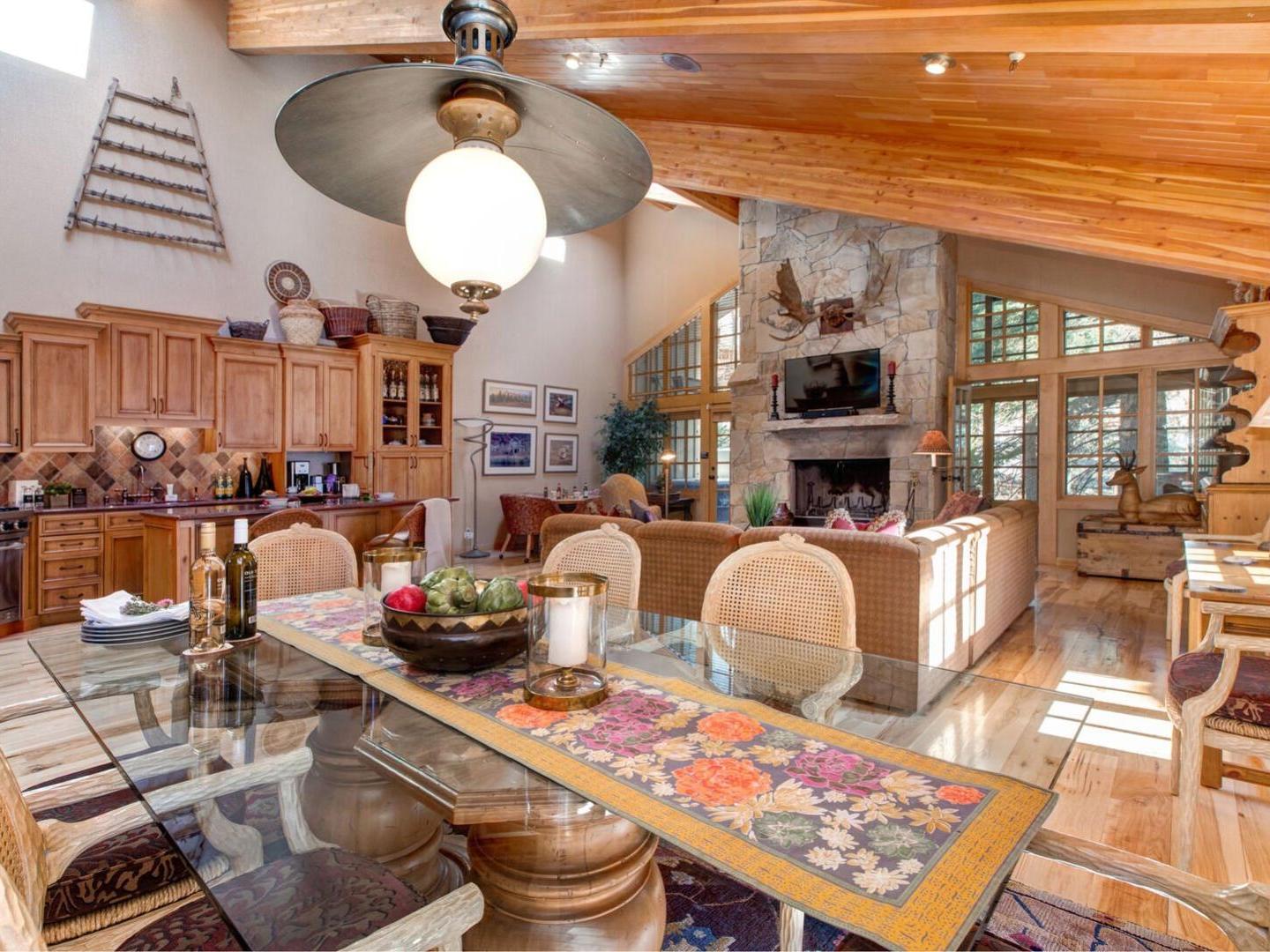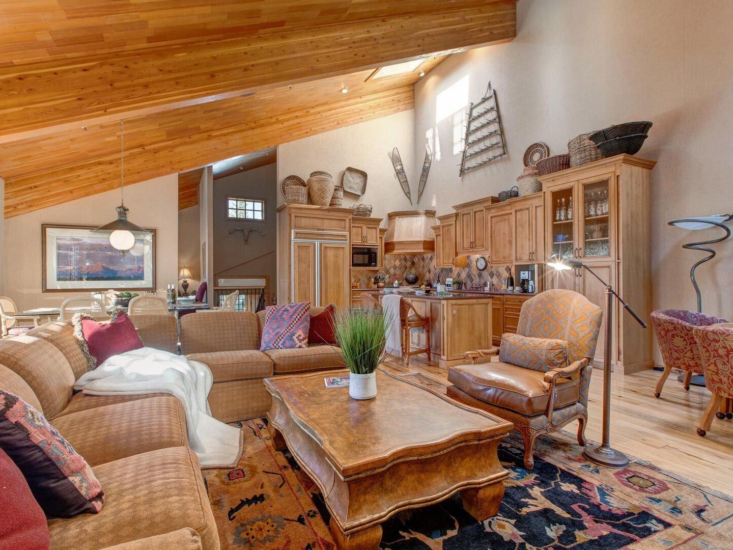 Designed for entertaining, the main level of this 3-bedroom, 3-bathroom townhouse welcomes guests with a spacious, tastefully furnished living room featuring vaulted ceilings, a stone-framed fireplace, and a wall-mounted TV. Two adjacent tables provide seating for up to ten—perfect for dining or game nights—while the open-concept kitchen is fully equipped with high-quality appliances, granite countertops, and a breakfast bar for two.