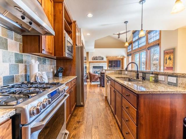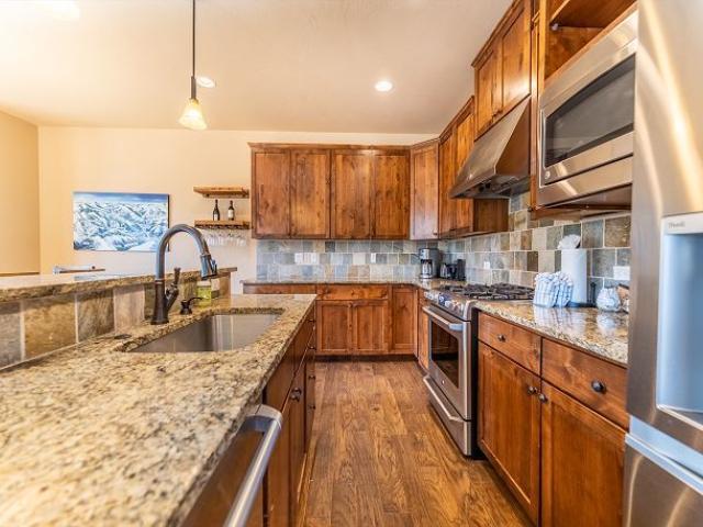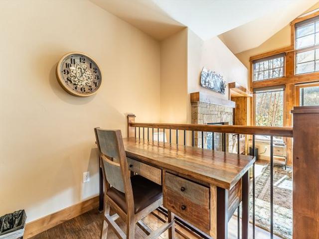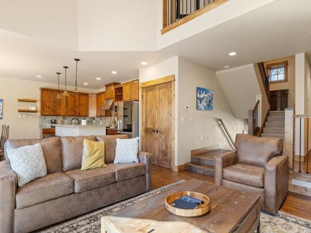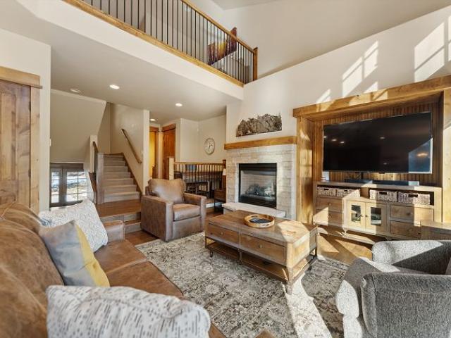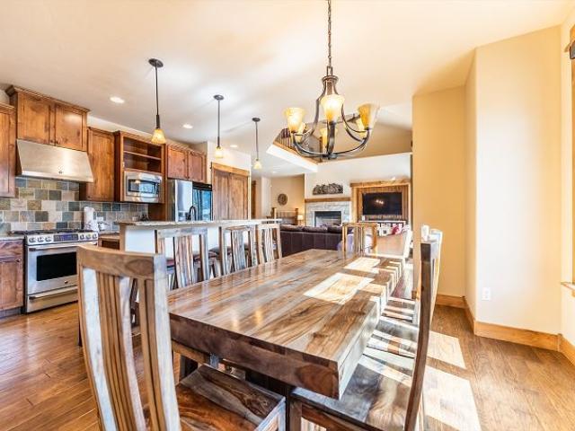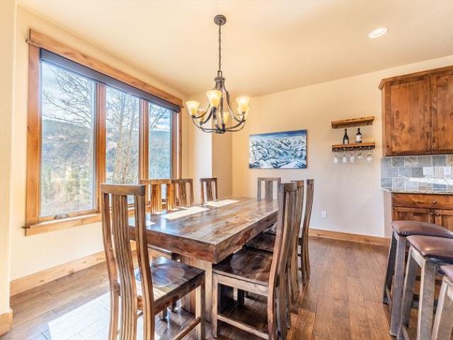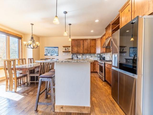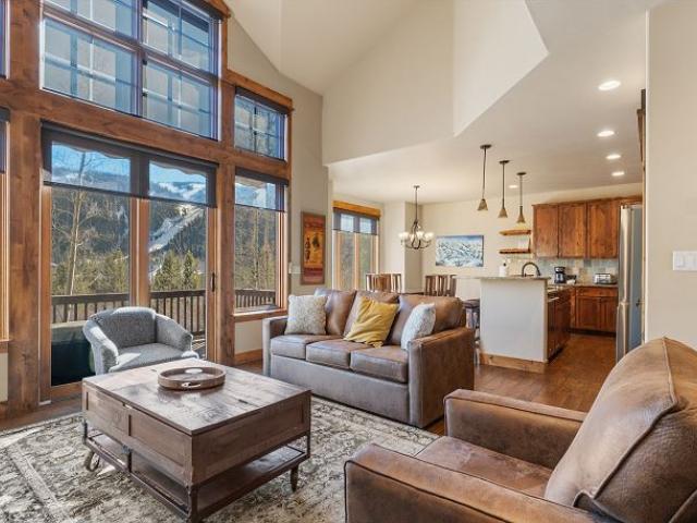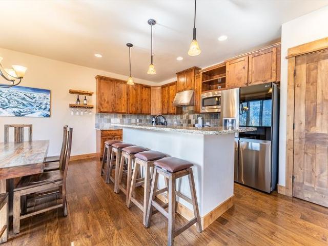 Gather inspiration from the ski slopes views that frame the living area of this 3 bedroom plus loft, 3.5 bathroom townhome featuring vaulted ceilings with floor-to-ceiling windows, hardwood radiant heat flooring, a gas fireplace with a beautiful stone surround, flat screen television, and access to the private balcony. Set off of the living room, the dining area comfortably seats eight with additional seating for five at the breakfast bar. Granite countertops and stainless steel appliances adorn the fully equipped kitchen that overlooks the living room and dining area.