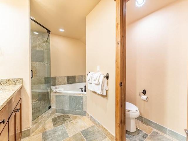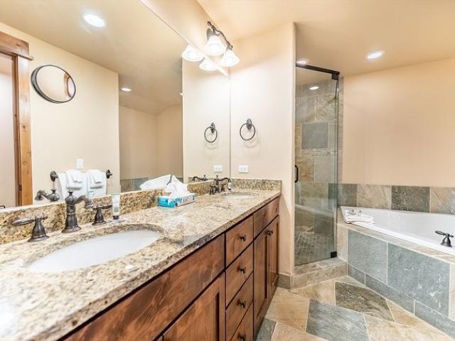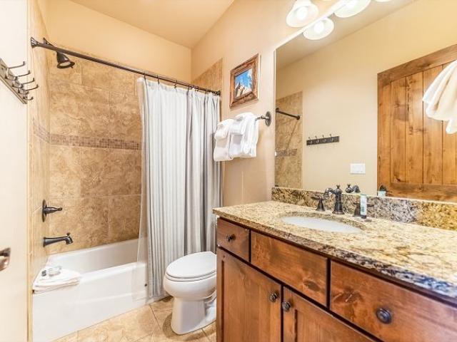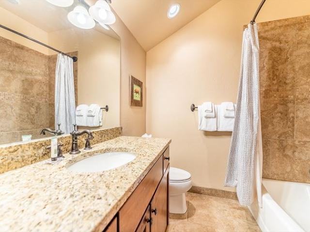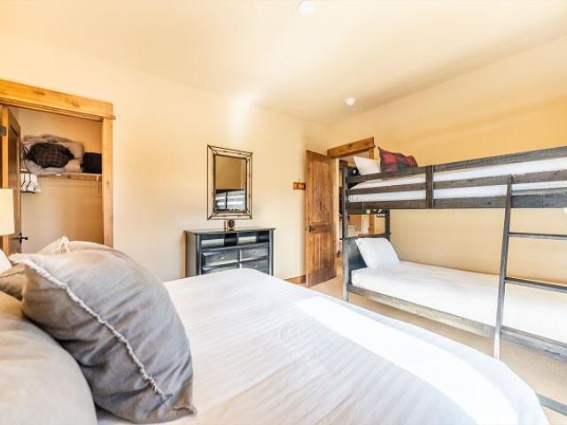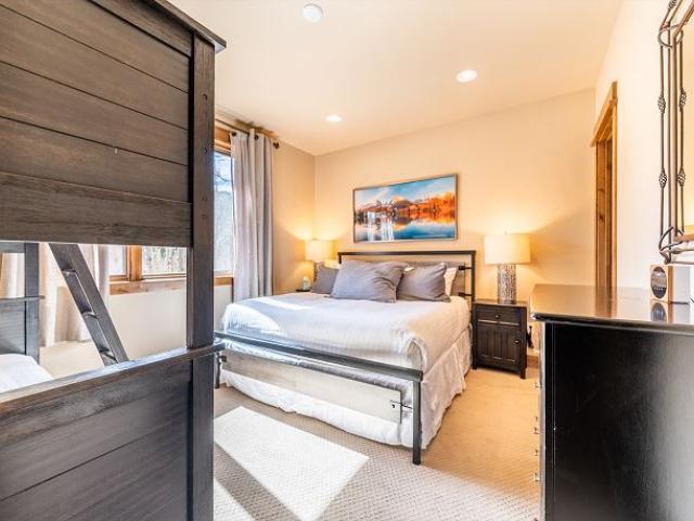 Furnished with a King bed, the upper level primary bedroom includes a private bathroom equipped with a dual-sink vanity, jetted tub and walk-in shower. Located midway between the upper and main levels, the guest primary bedroom offers a King bed and private bathroom. Off of the family room on the lower level, the third bedroom is equipped with a King bed plus a Twin over Twin bunk bed and shares a full bathroom with the family room.